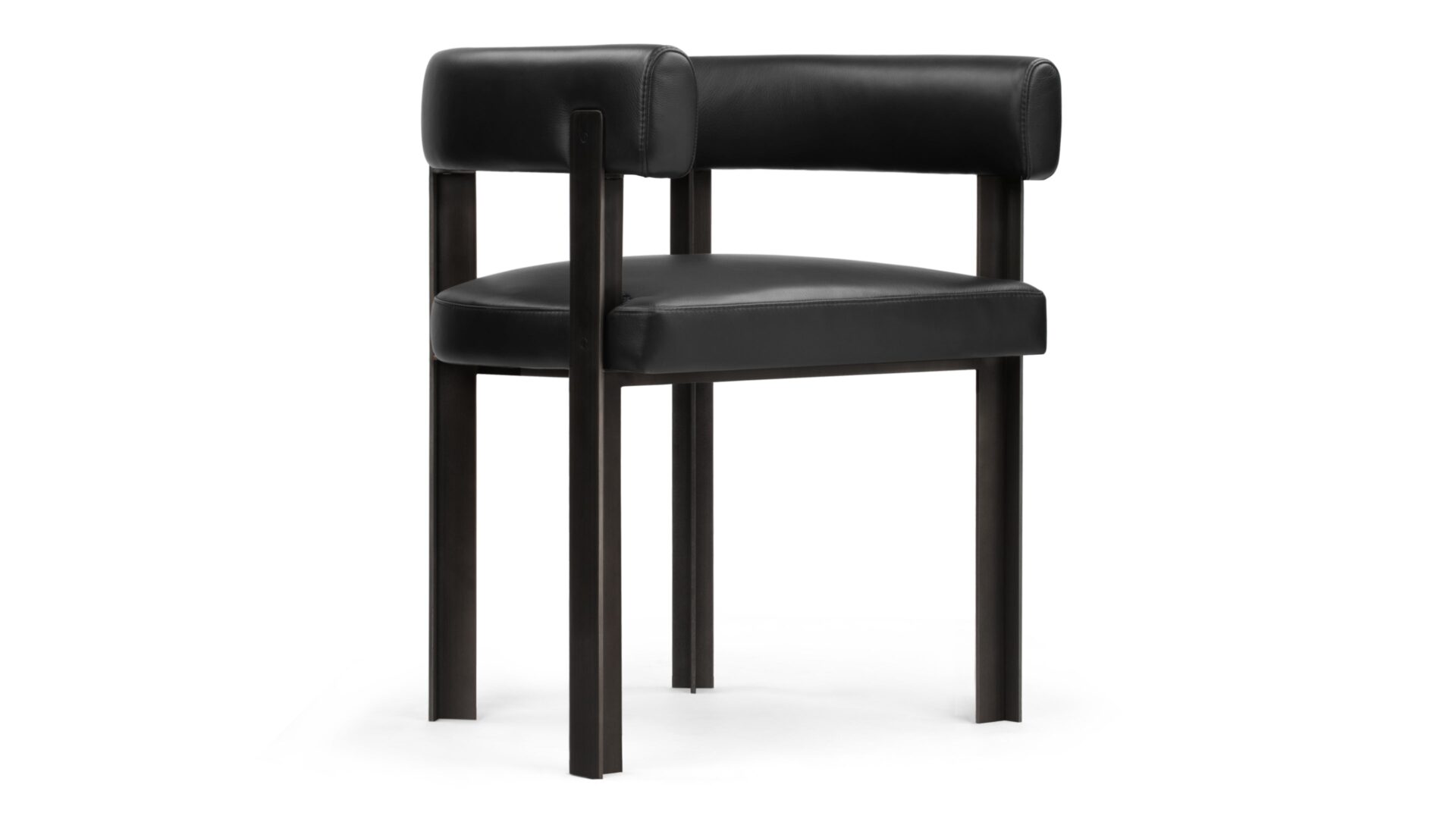 Experience the distinctive design of the iconic 'T' chair, characterized by its sharp angles and geometric form. Its stylish steel legs come together at 90-degree angles, meeting the soft curved backrest to create a commanding look.