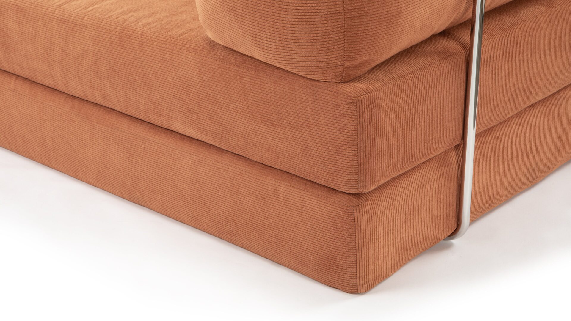 Discover the perfect fusion of contemporary style and luxurious coziness with the Teddy Sofa. This sofa showcases a vibrant orange corduroy finish and generously-sized ribbed cushions for added comfort. Its versatile design includes a convertible pull-out base, allowing it to effortlessly convert into a lounge or bed, catering especially to compact living areas.