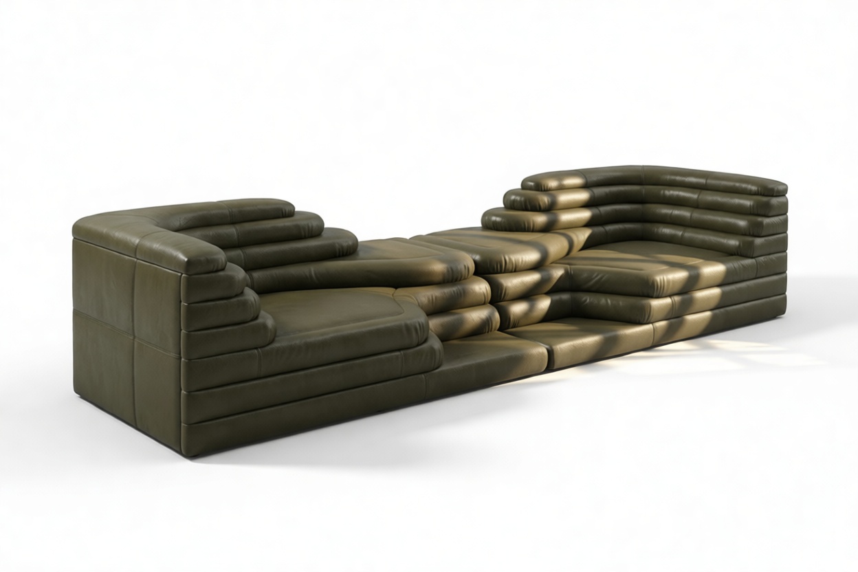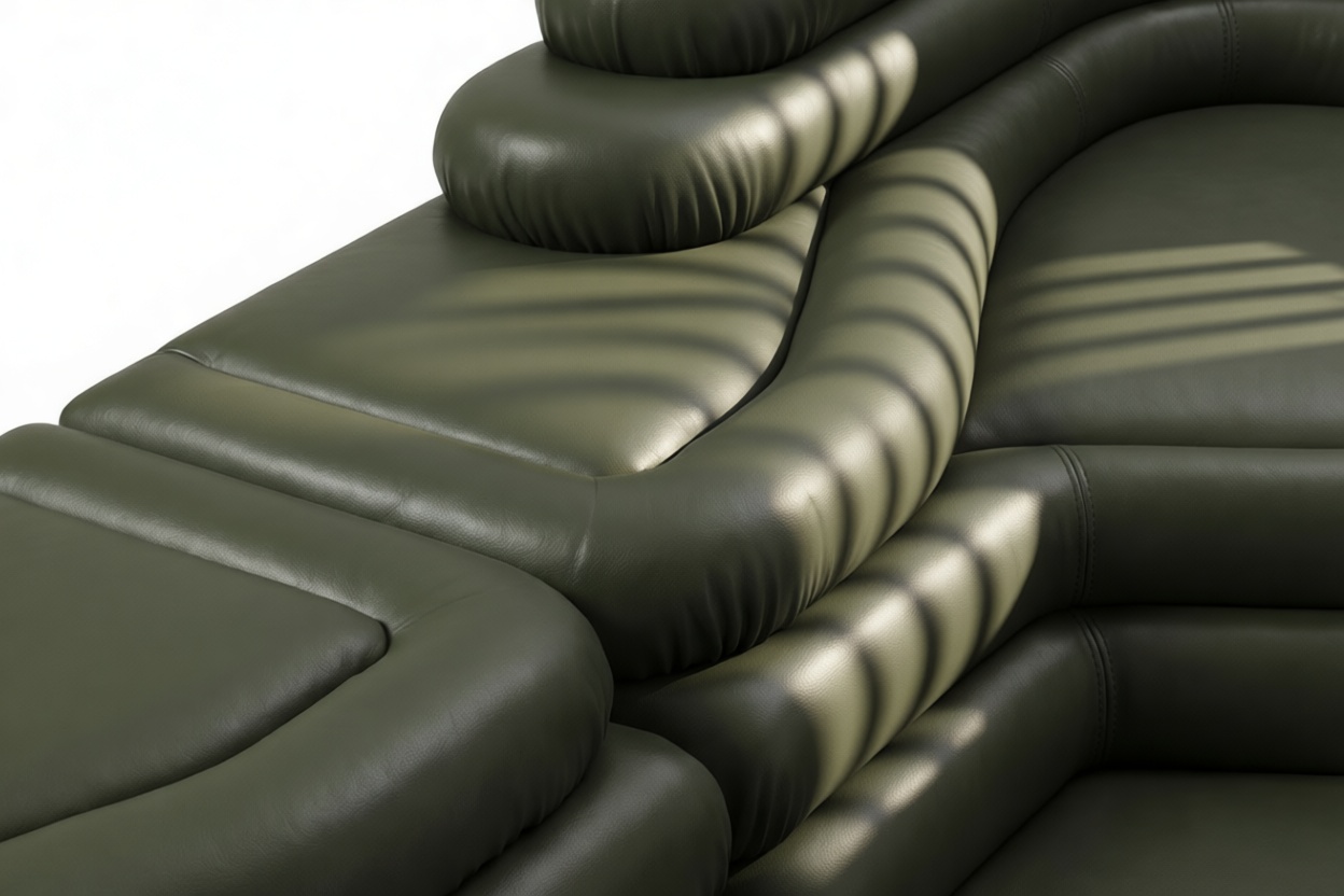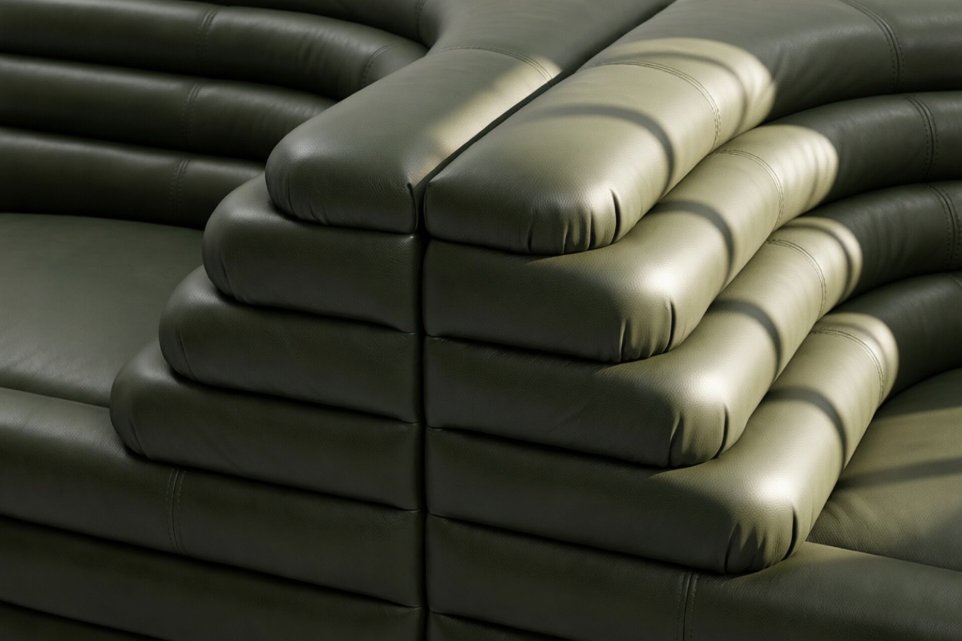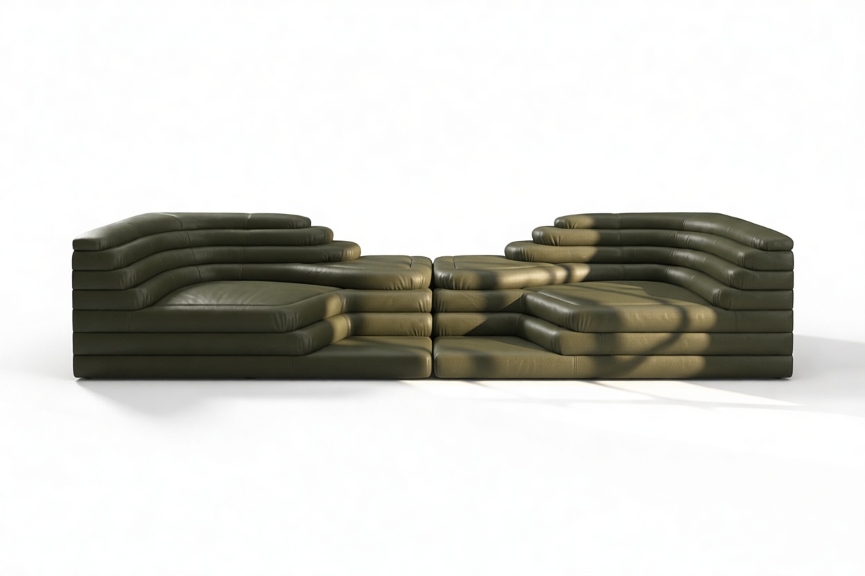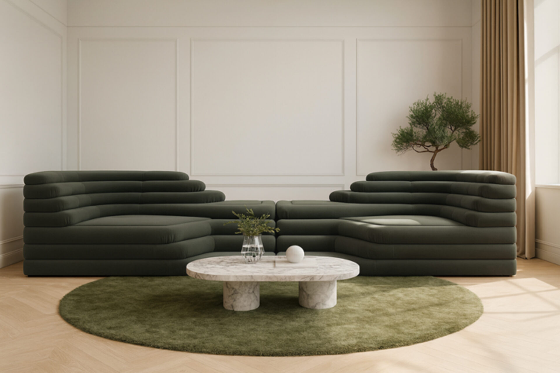 Introducing the Terrazza Sofa, an epitome of opulent comfort and superb artistry. Crafted with meticulous precision, it boasts a captivating blend of geometric shapes and textural contrasts in Army Green Vegan Leather. This masterpiece offers a visual delight with lavish upholstery, daring angles, and spacious seating for an unparalleled experience of sophistication and luxury.