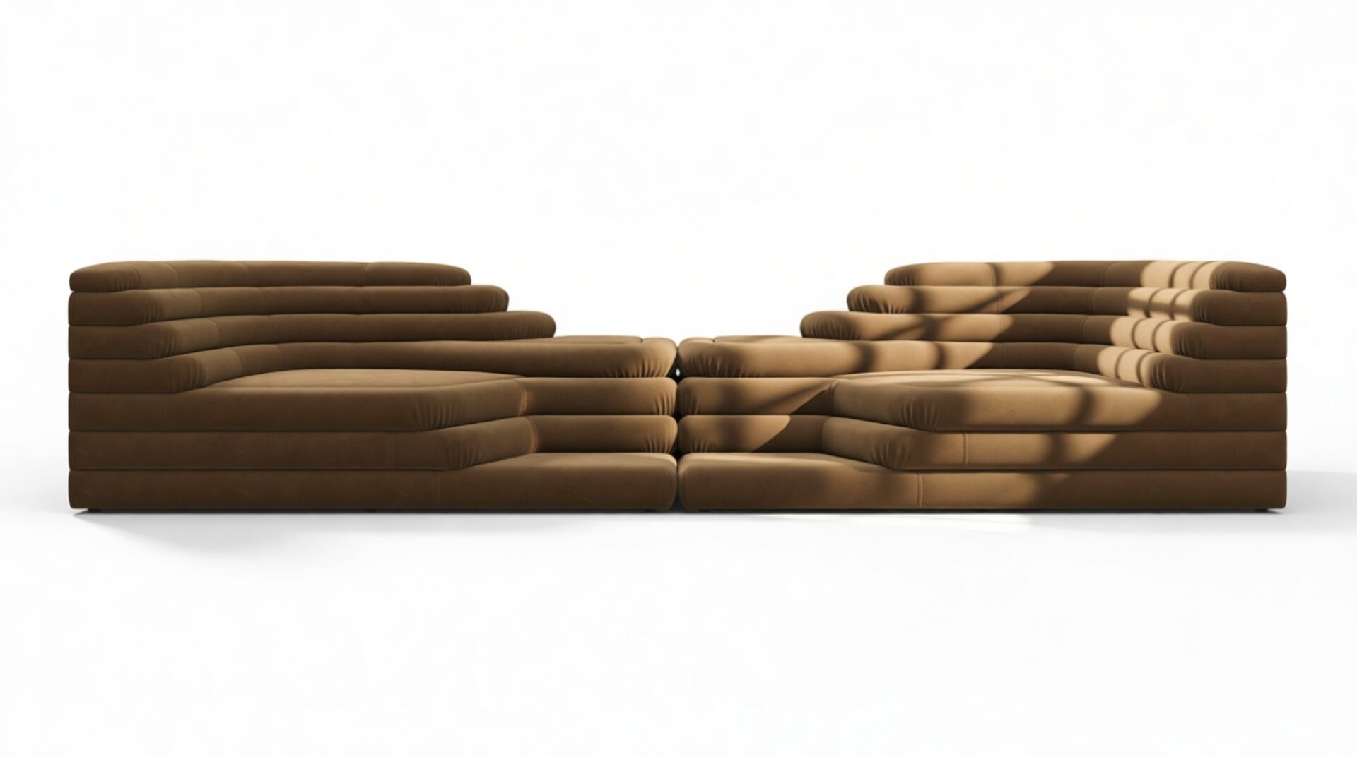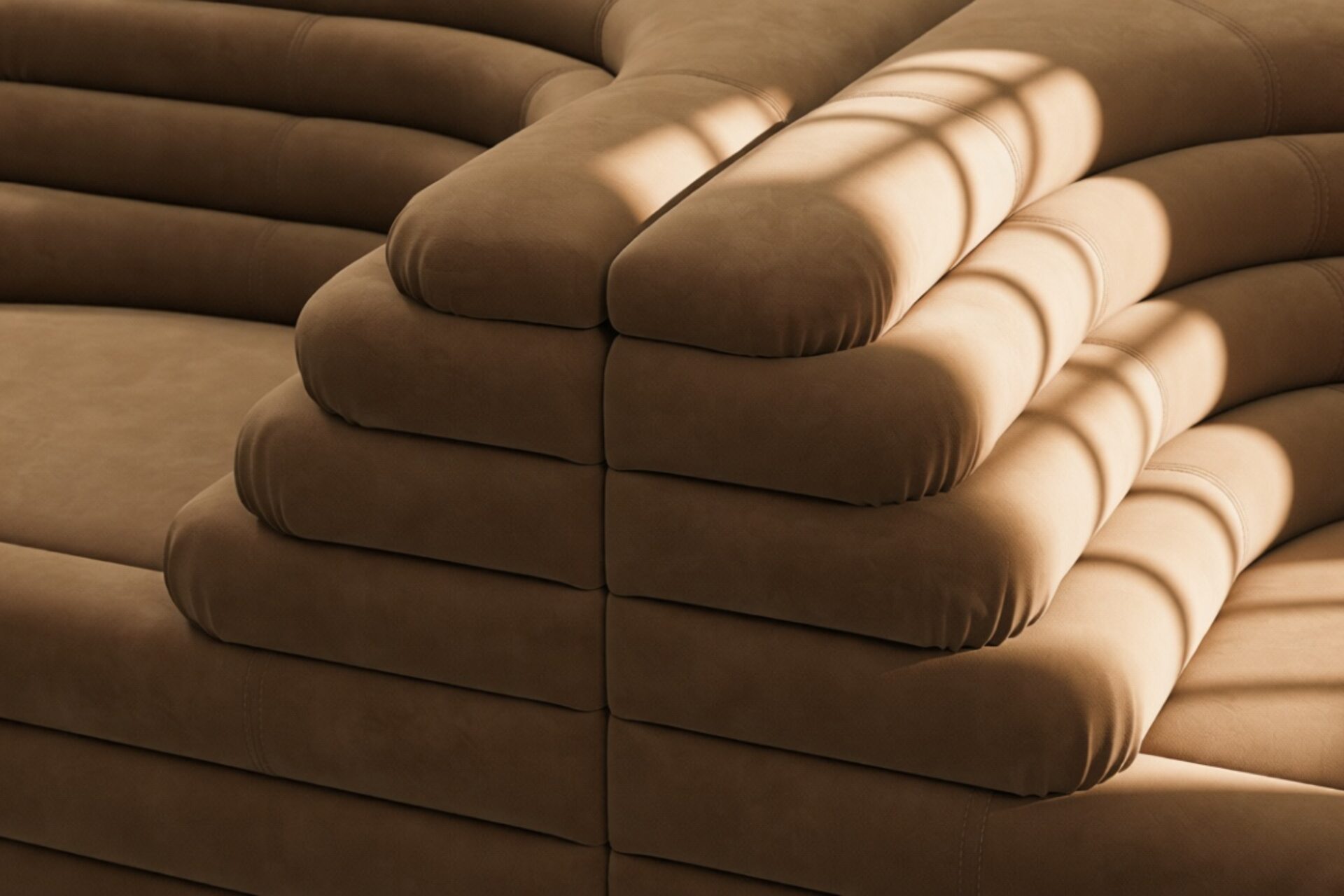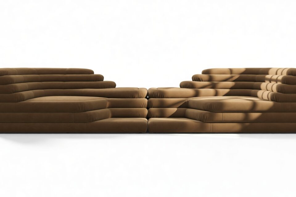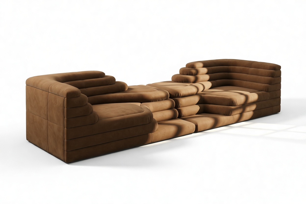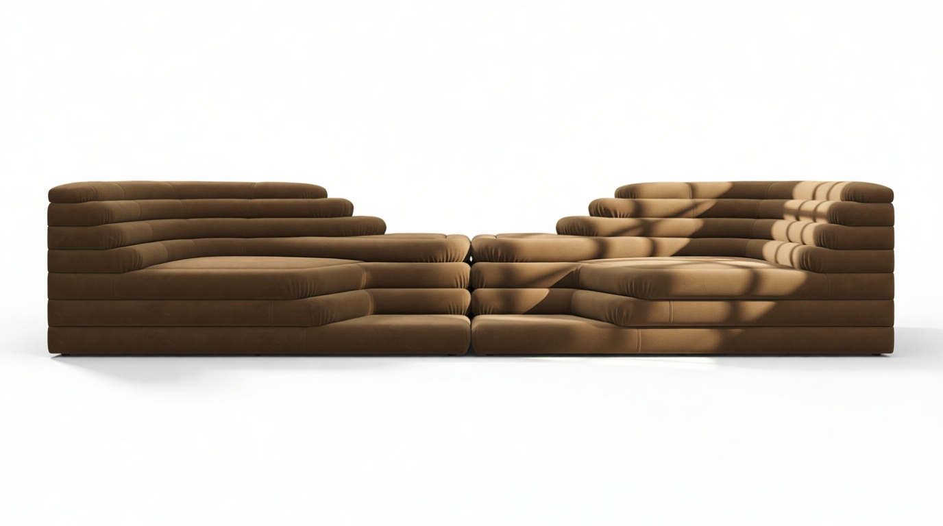Introducing the Terrazza Sofa, a luxurious masterpiece crafted with precision and opulent comfort in mind. This sofa boasts a captivating blend of geometric shapes and textural contrasts, highlighted by its sleek contours and daring angles, all wrapped in sumptuous brown vegan suede upholstery. Elevate your living space with the Terrazza Sofa, a perfect balance of style and comfort, promising a truly exceptional seating experience.