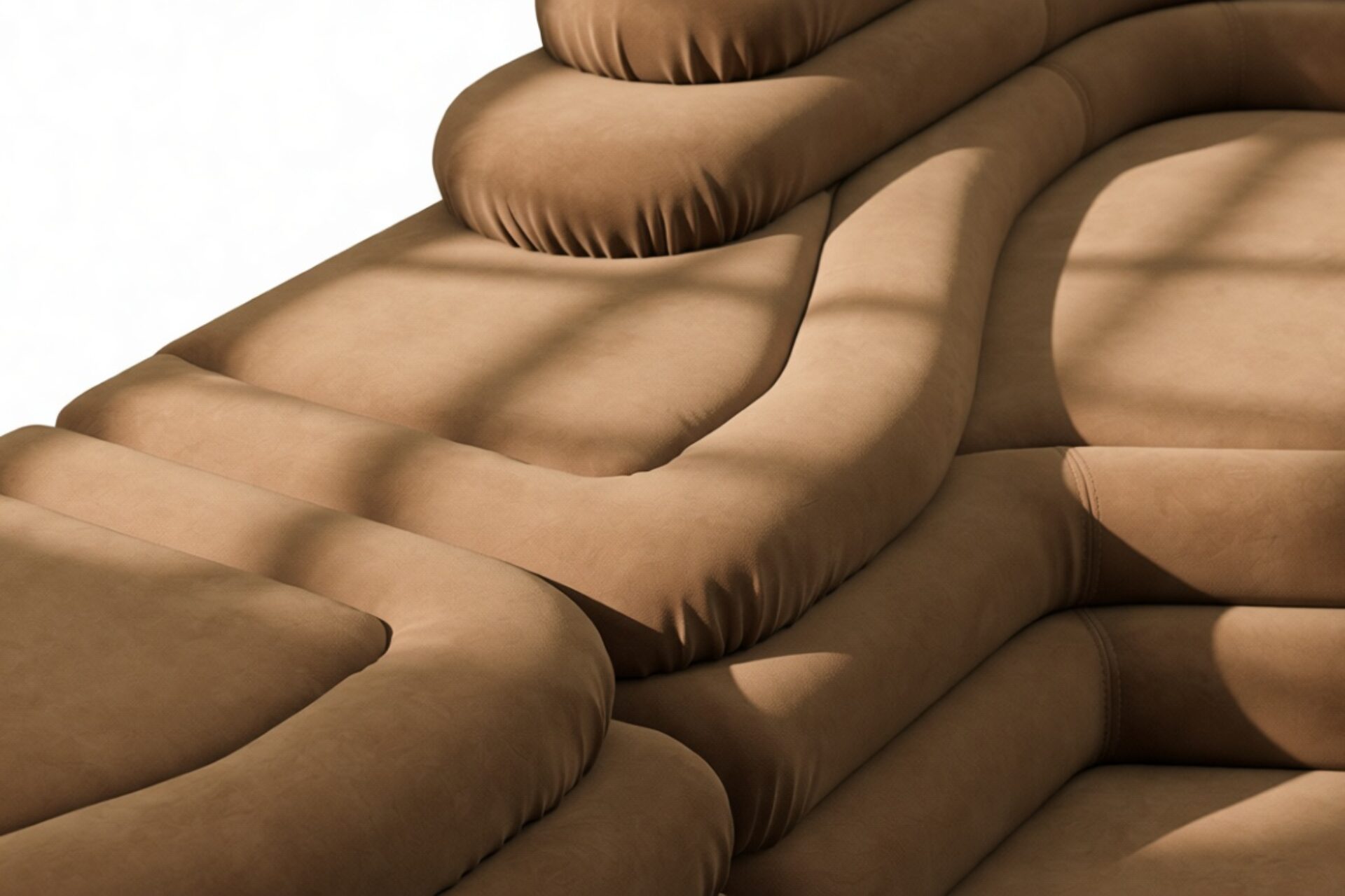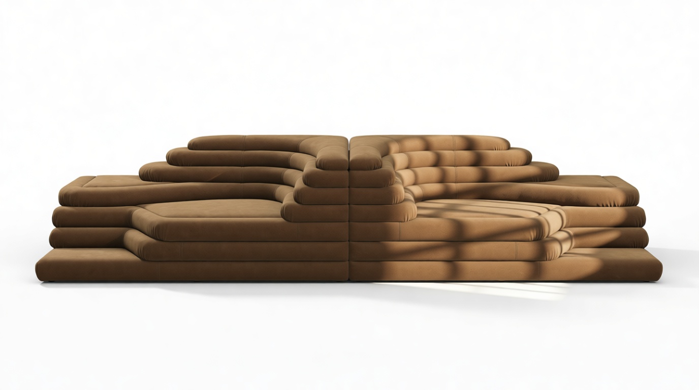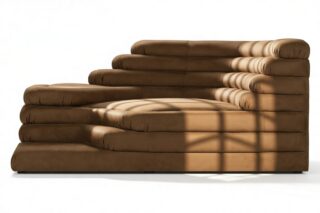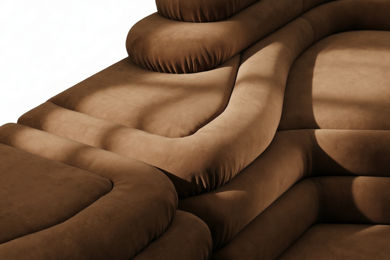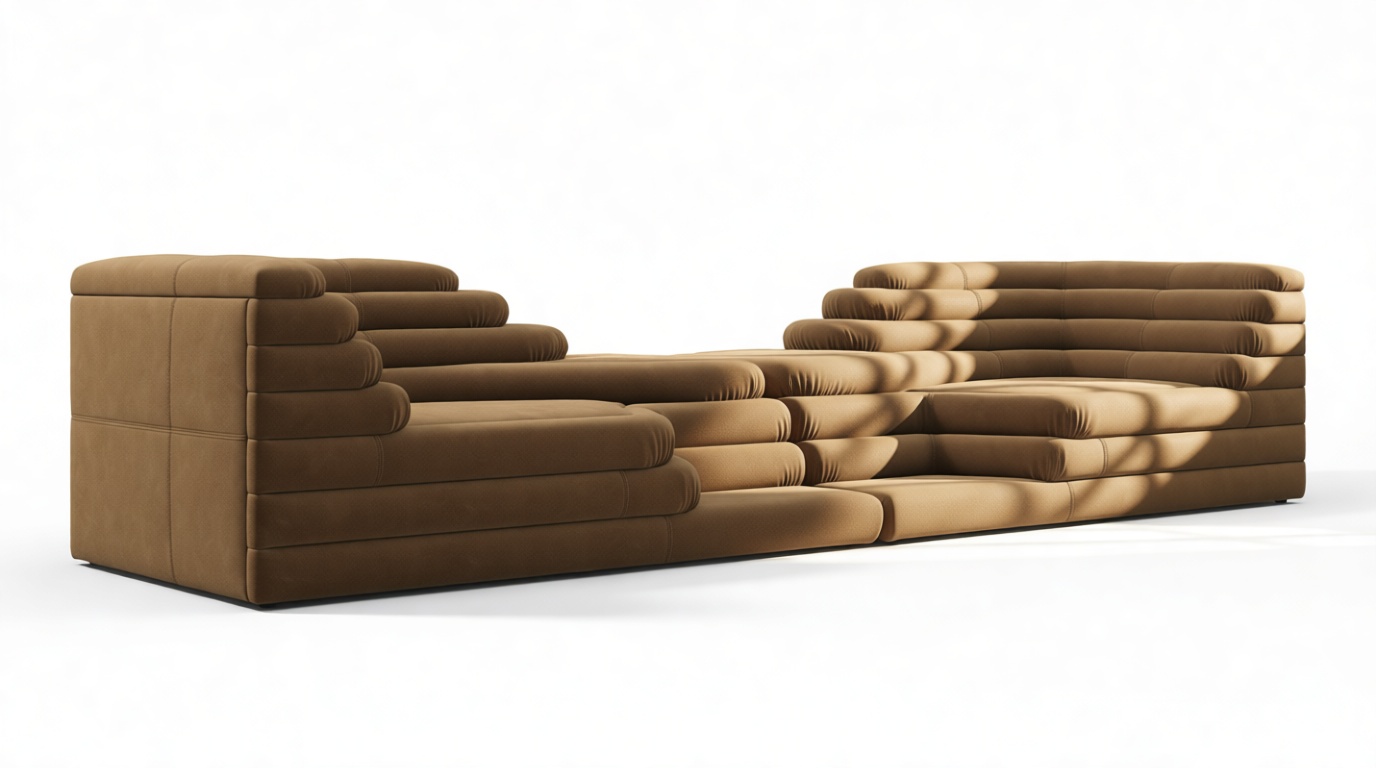 Introducing the Terrazza Sofa, a luxurious masterpiece crafted with precision and opulent comfort in mind. This sofa boasts a captivating blend of geometric shapes and textural contrasts, highlighted by its sleek contours and daring angles, all wrapped in sumptuous brown vegan suede upholstery. Elevate your living space with the Terrazza Sofa, a perfect balance of style and comfort, promising a truly exceptional seating experience.