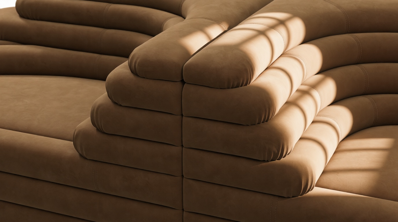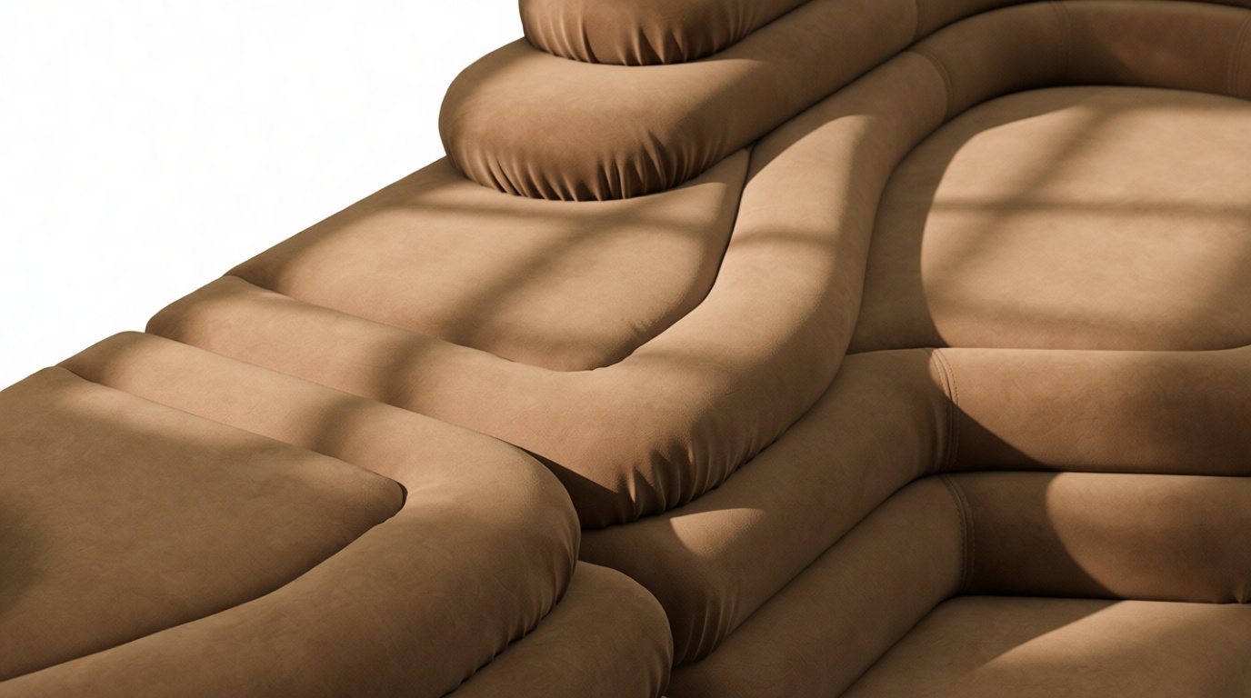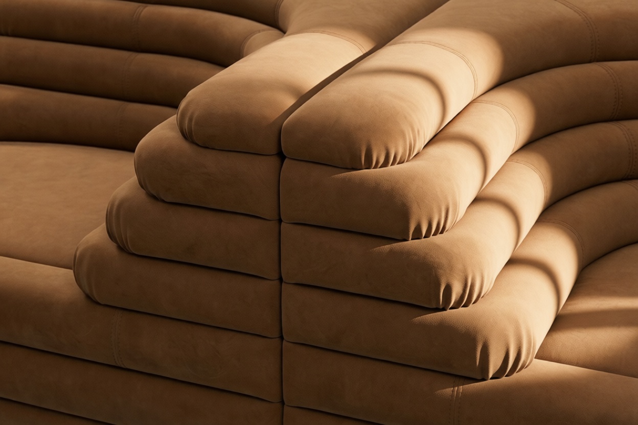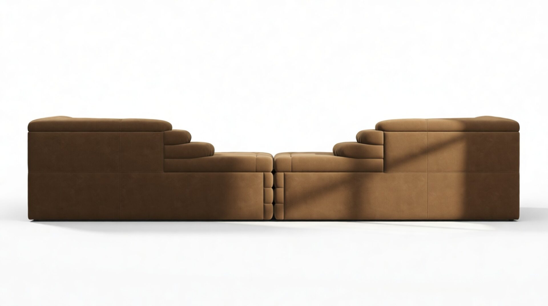 Introducing the Terrazza Sofa, a luxurious masterpiece crafted with precision and opulent comfort in mind. This sofa boasts a captivating blend of geometric shapes and textural contrasts, highlighted by its sleek contours and daring angles, all wrapped in sumptuous brown vegan suede upholstery. Elevate your living space with the Terrazza Sofa, a perfect balance of style and comfort, promising a truly exceptional seating experience.