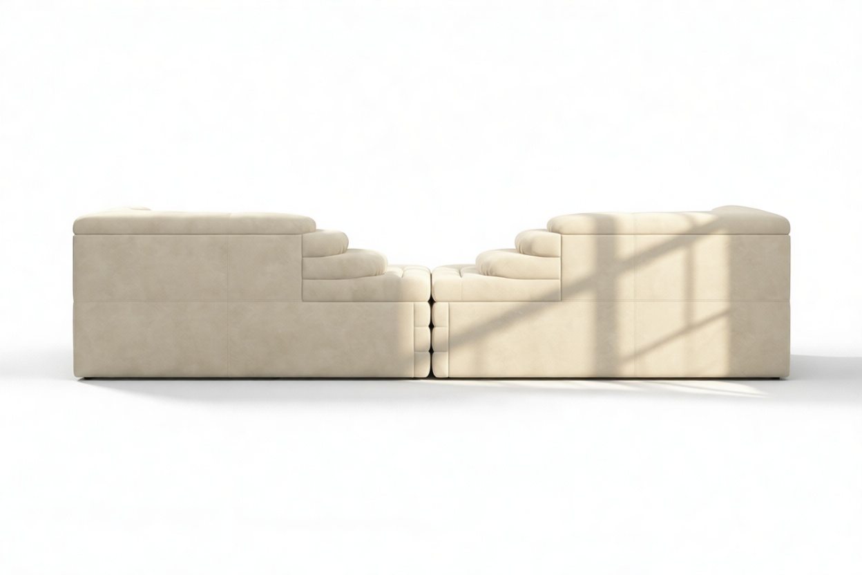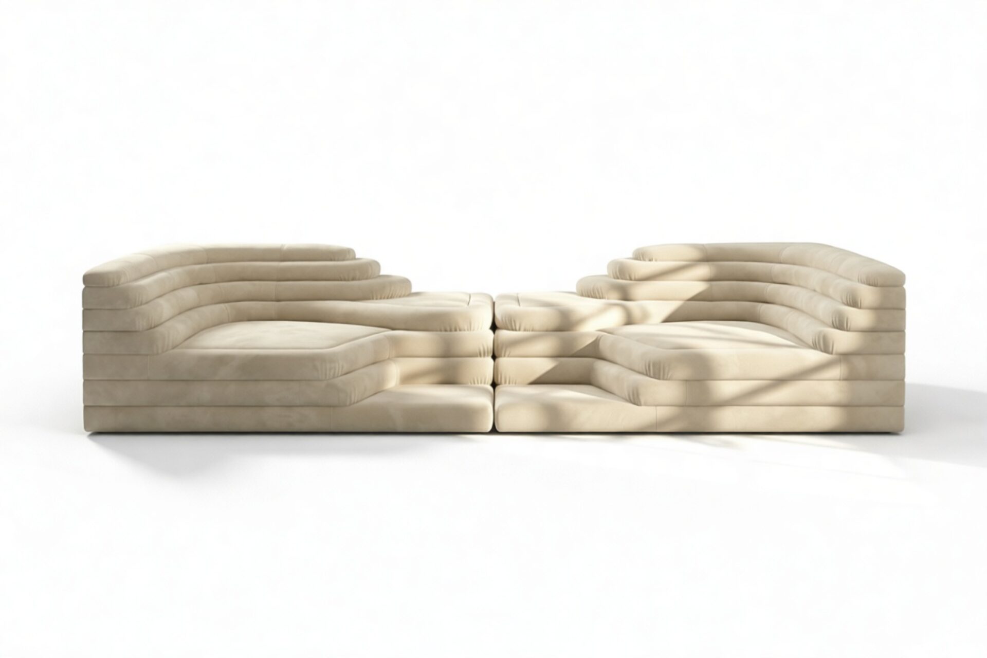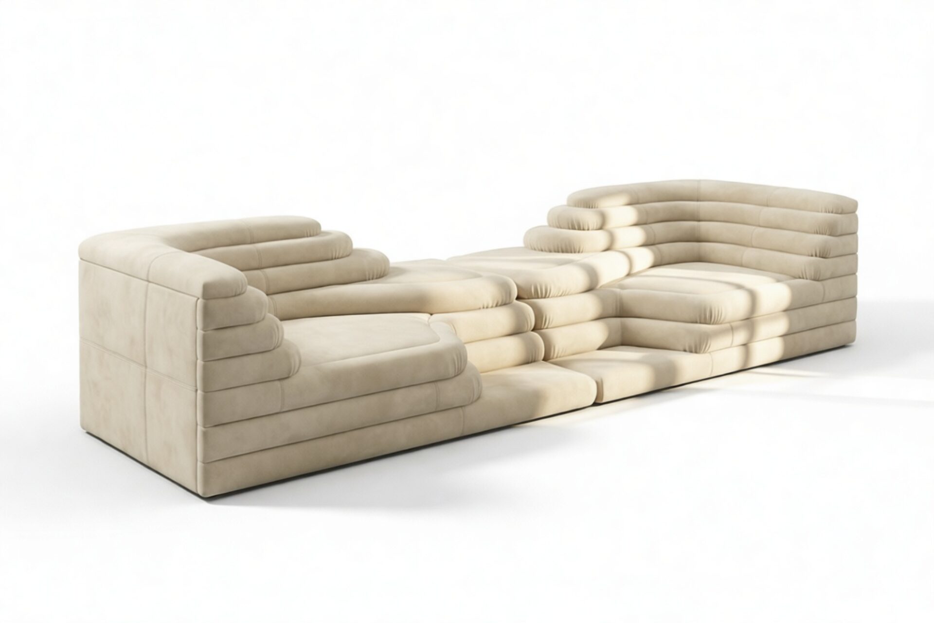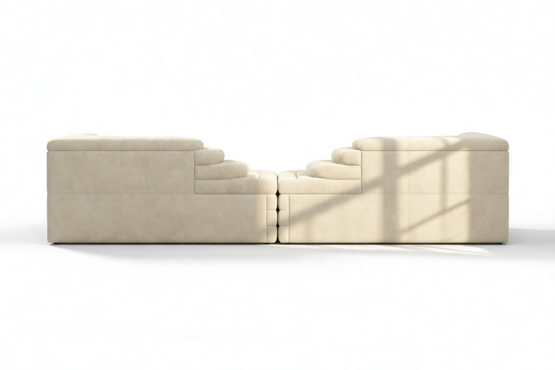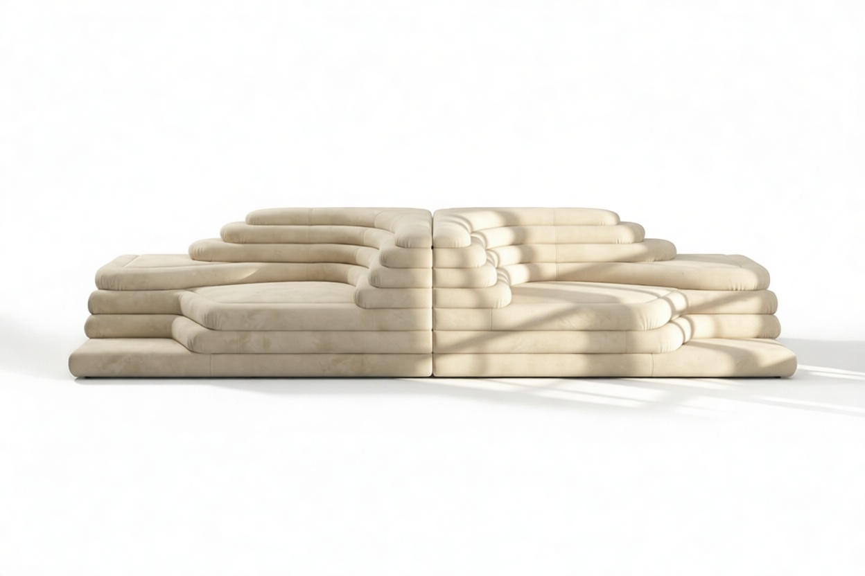 Introducing the Terrazza Sofa, a masterpiece of opulent comfort and superb artistry that surpasses design norms. Crafted with precision, it features geometric shapes and daring angles in Eggshell Vegan Suede, exuding lavishness. Meticulous handcrafted details ensure quality, creating a visually stunning piece that offers unmatched seating experience and adds sophisticated luxury to any space.