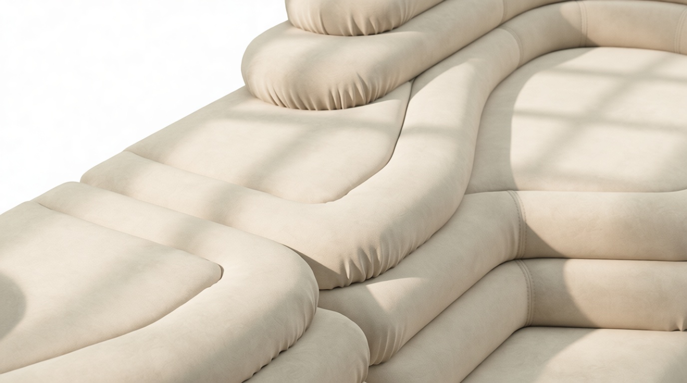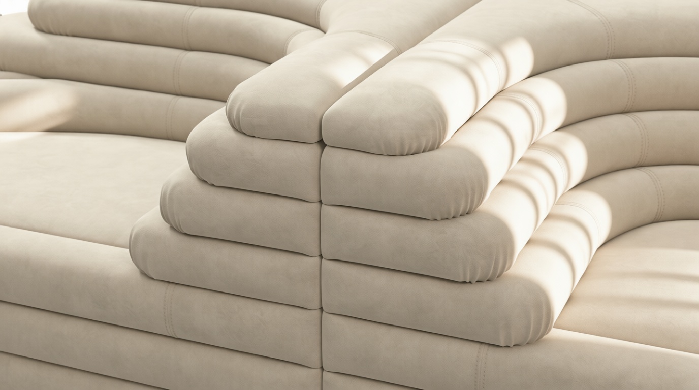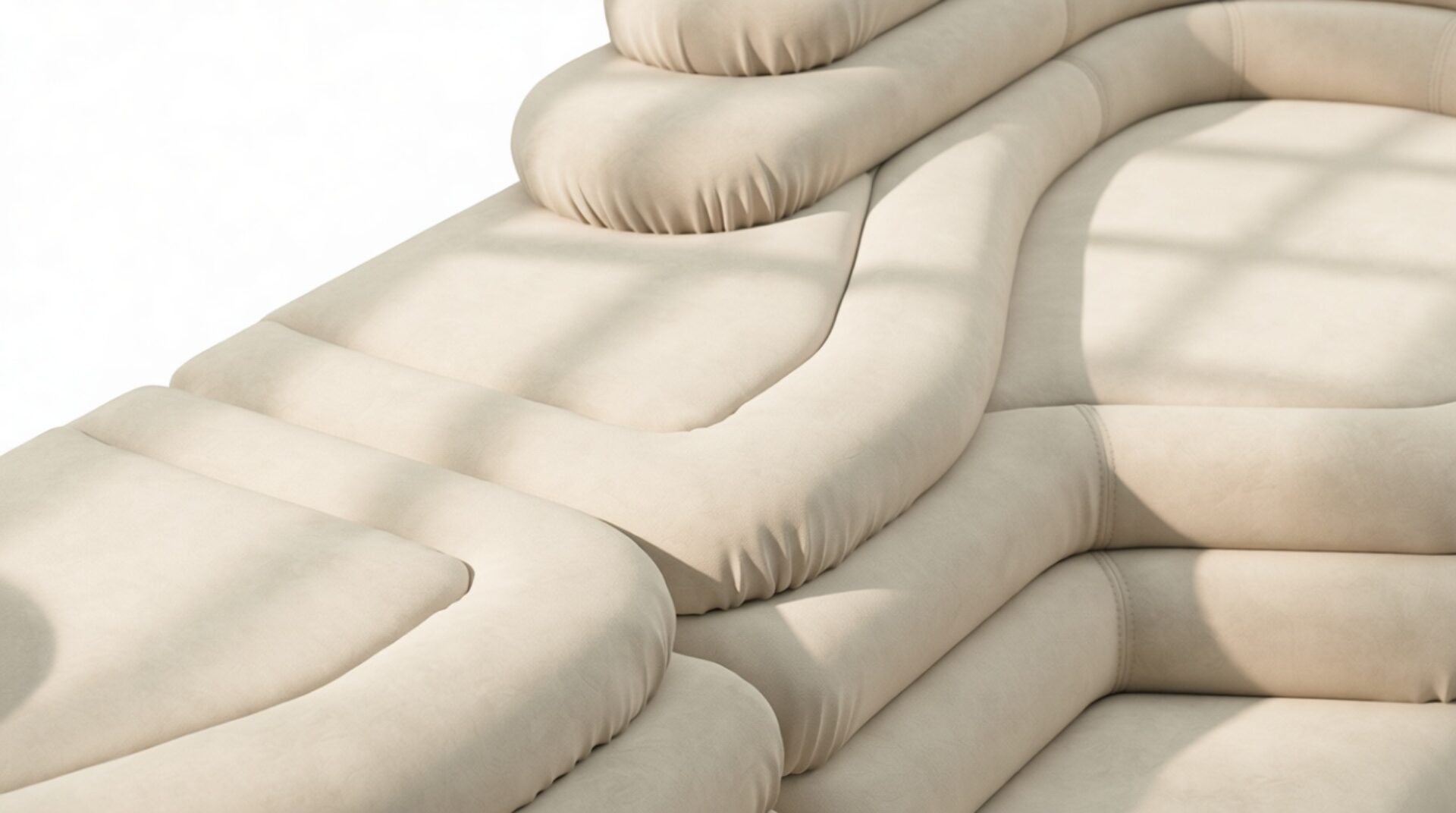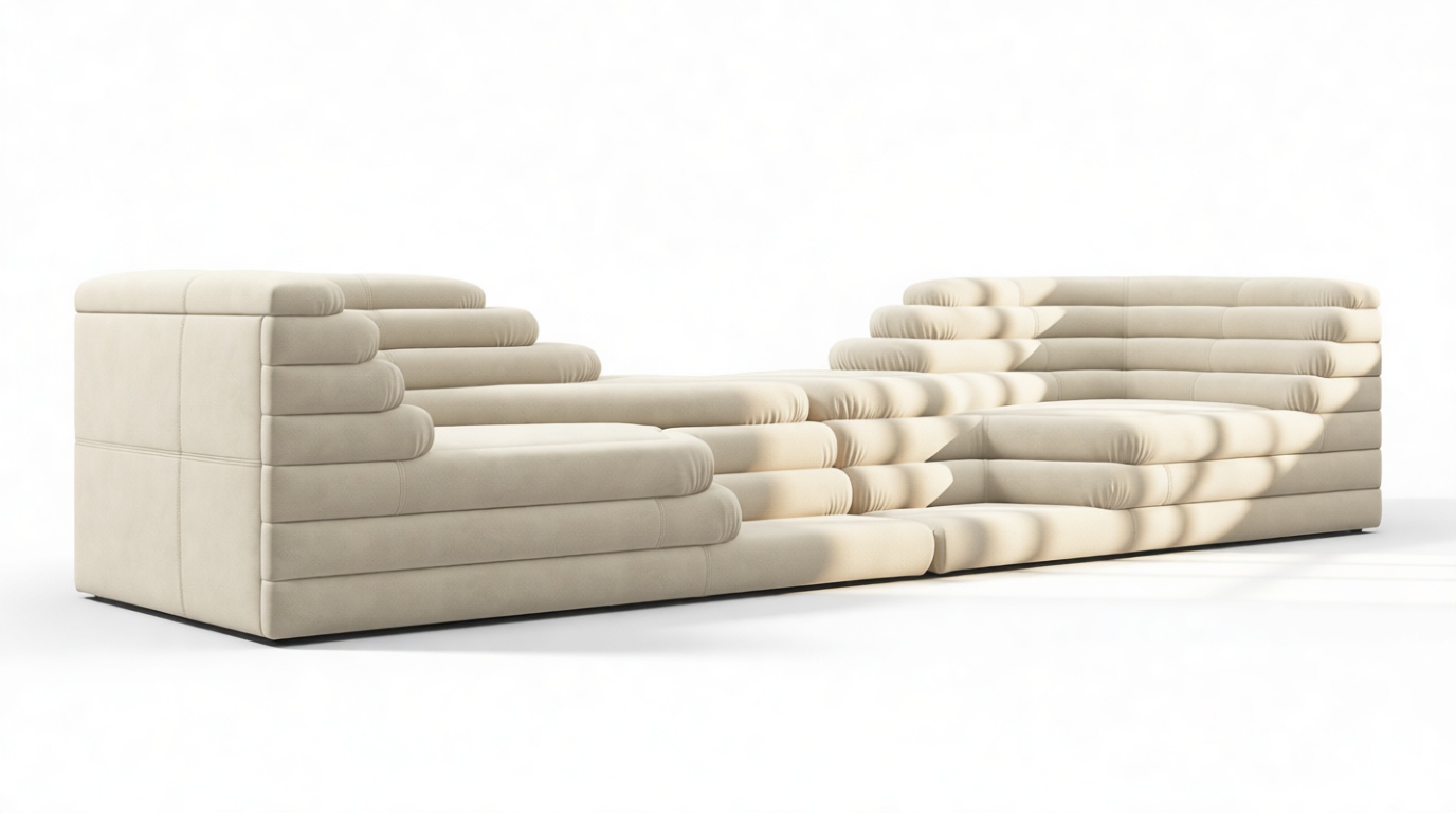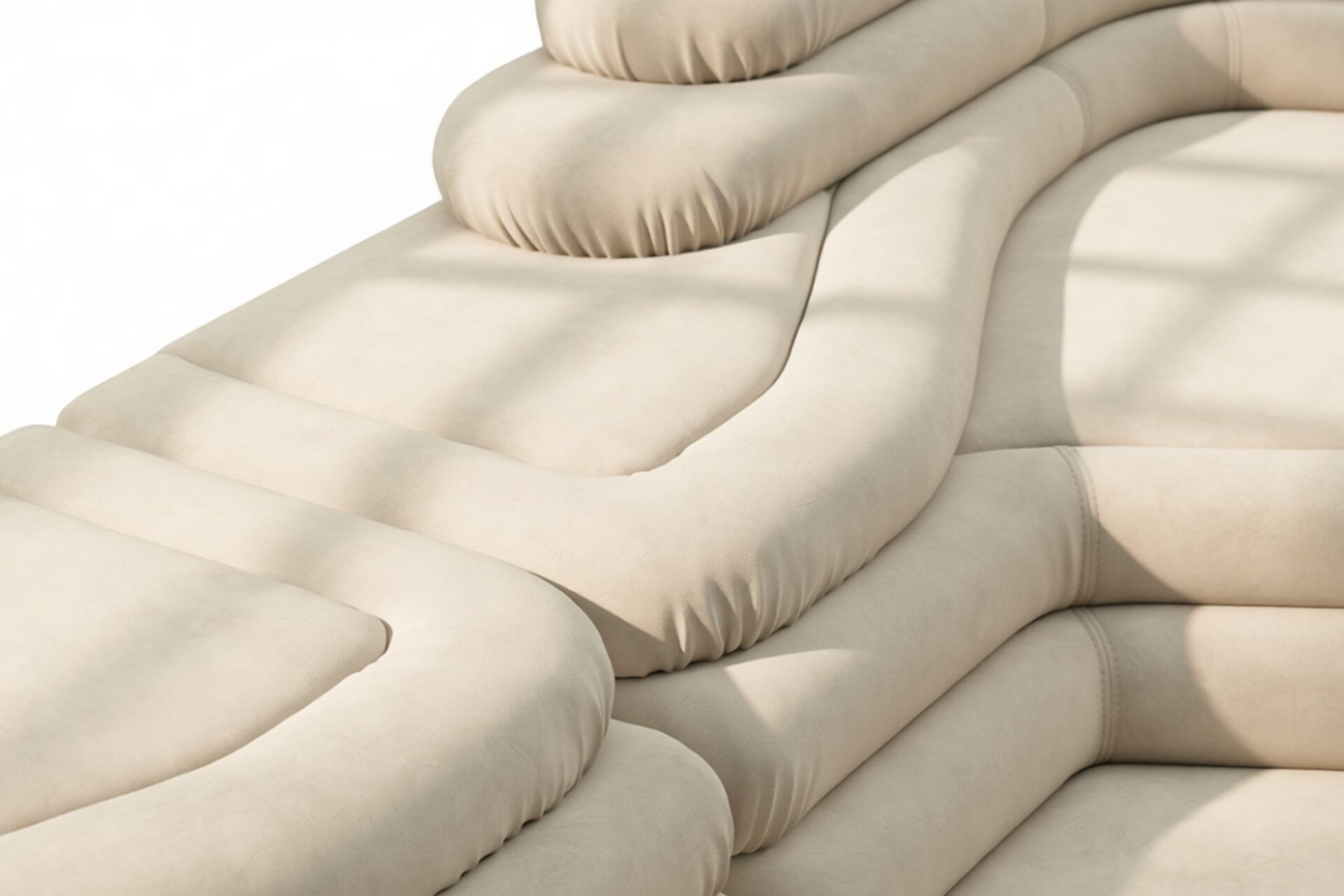 Introducing the Terrazza Sofa, a masterpiece of opulent comfort and superb artistry that surpasses design norms. Crafted with precision, it features geometric shapes and daring angles in Eggshell Vegan Suede, exuding lavishness. Meticulous handcrafted details ensure quality, creating a visually stunning piece that offers unmatched seating experience and adds sophisticated luxury to any space.