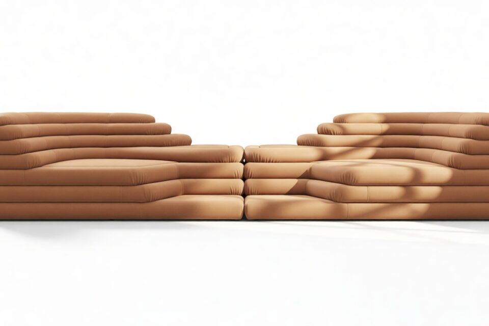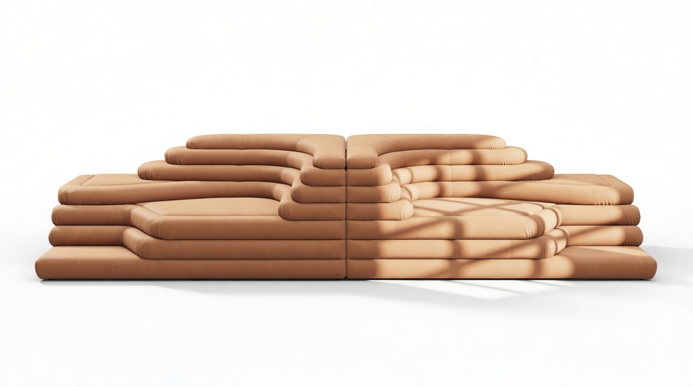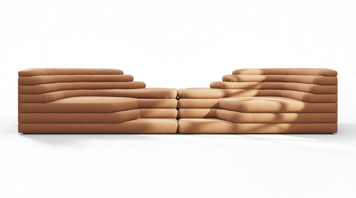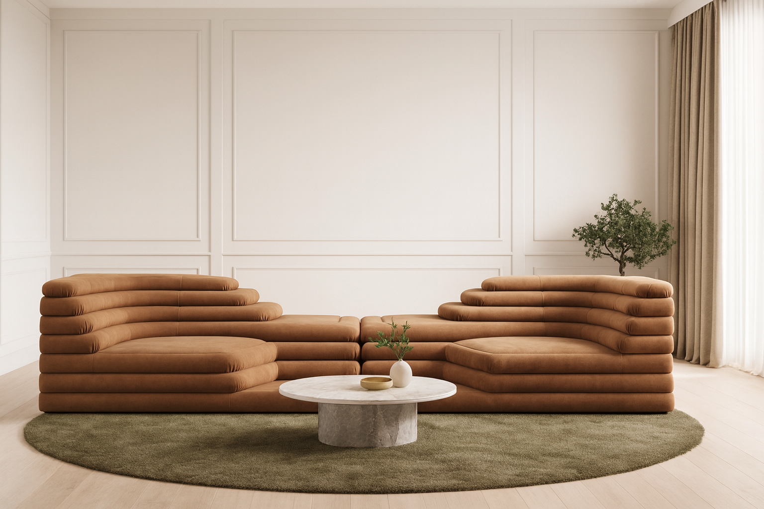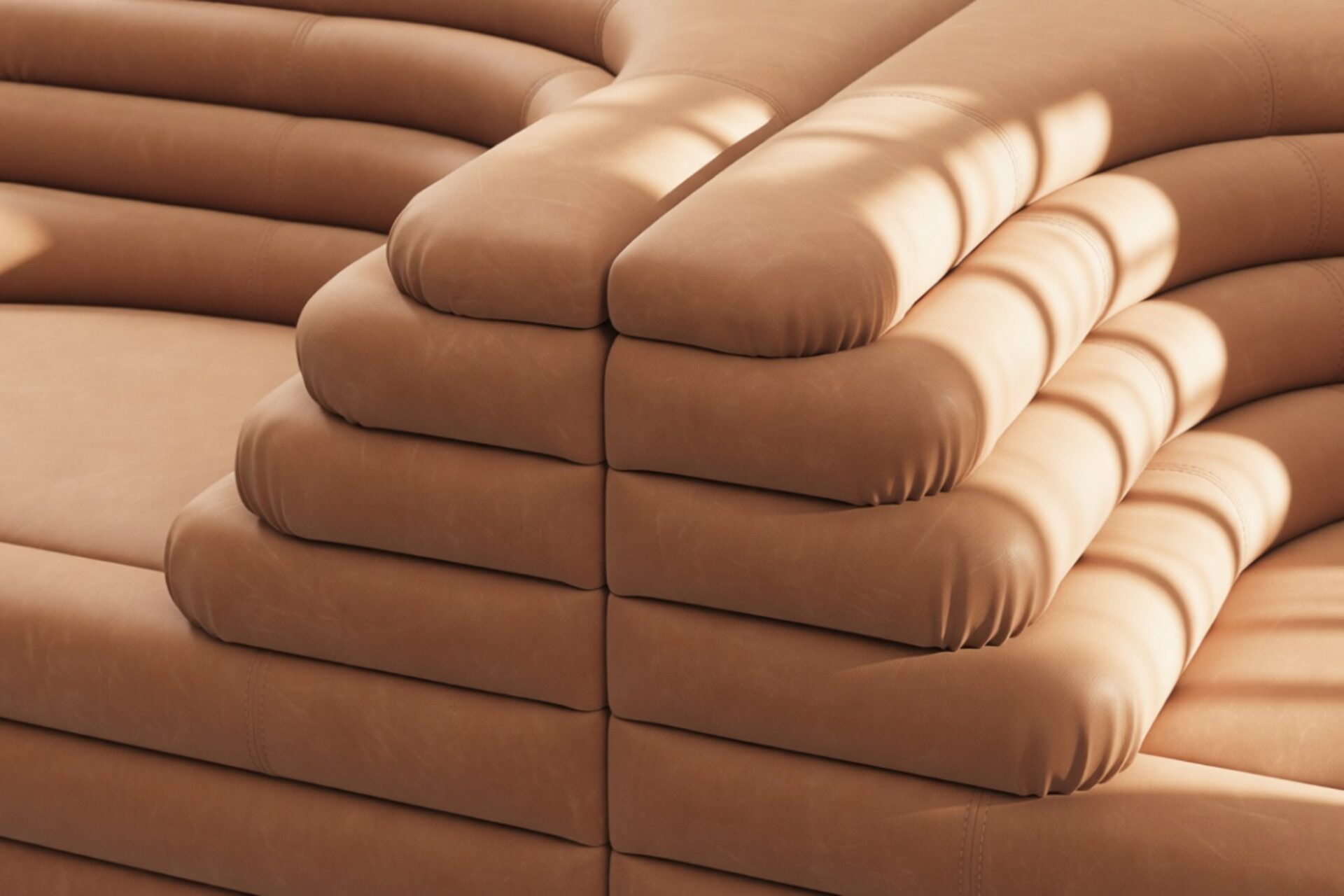 Unveiling the Terrazza Sofa, an exquisite masterpiece blending opulent comfort with superb artistry. This exceptional sofa transcends conventional design norms, offering a singular addition for discerning connoisseurs. Crafted with precision, featuring geometric shapes and textural contrasts, the sofa boasts sleek contours and daring angles. Upholstered in sumptuous Tan Vegan Leather, it exudes lavishness and refinement, promising a visual delight and unmatched seating experience. Truly an artistic statement and a pinnacle of sophisticated luxury for your living space.
