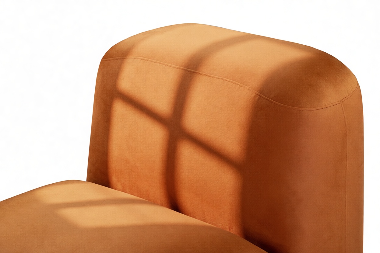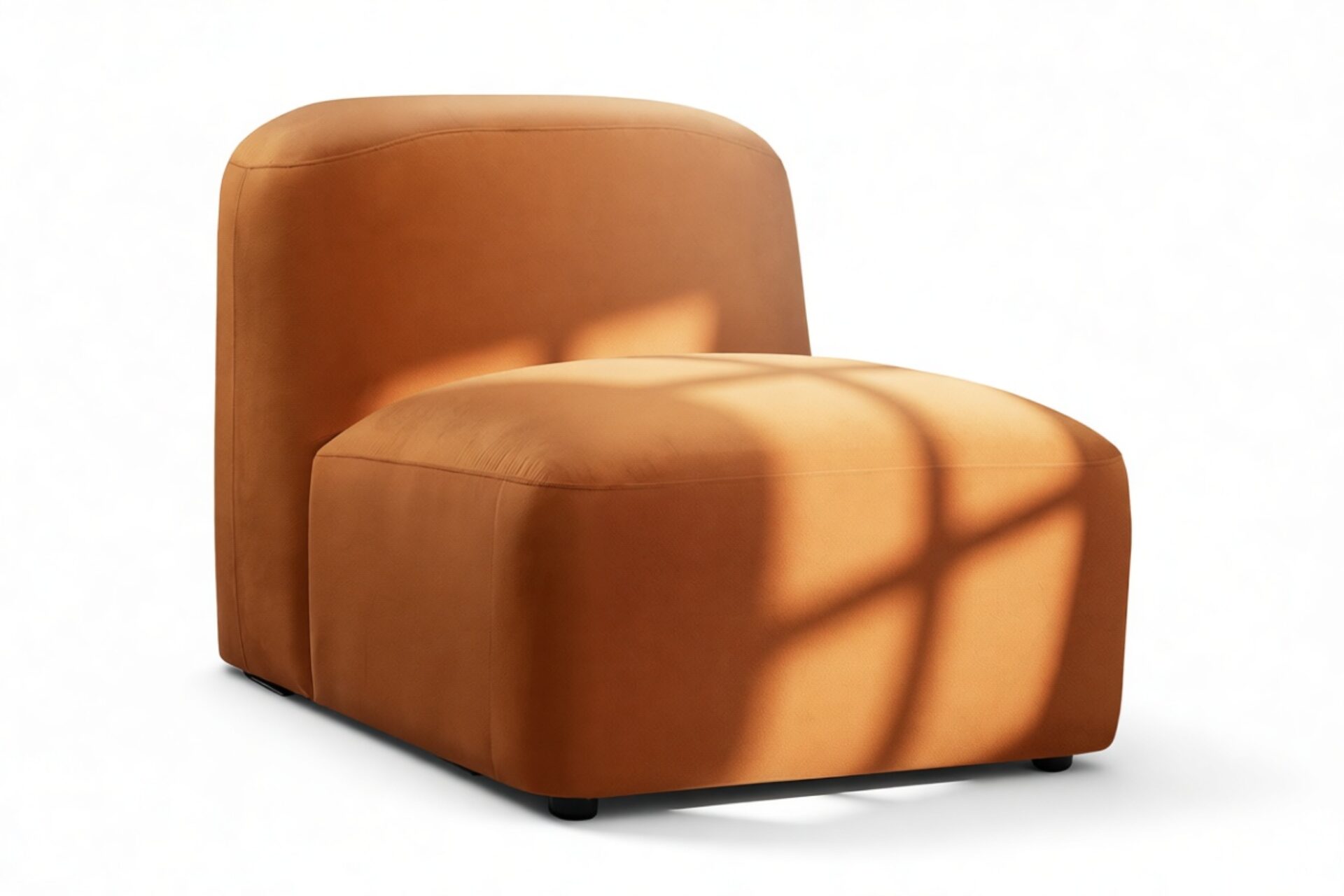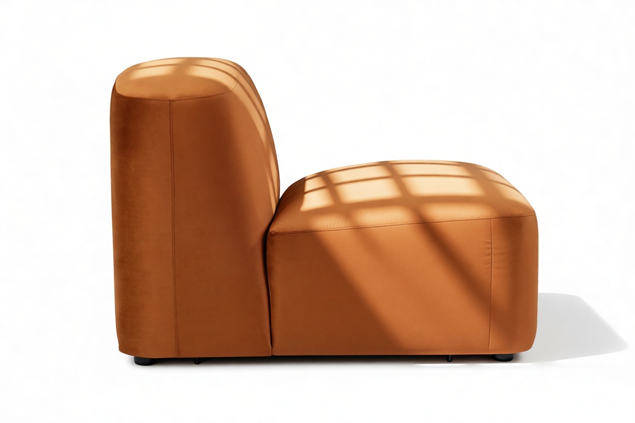 Sleek and eye-catching, the modules showcase plush velvet upholstery, sturdy arms, curved edges, and intricate stitching for both a tactile and visual allure. The burnt orange color infuses a hint of coziness and enduring elegance.