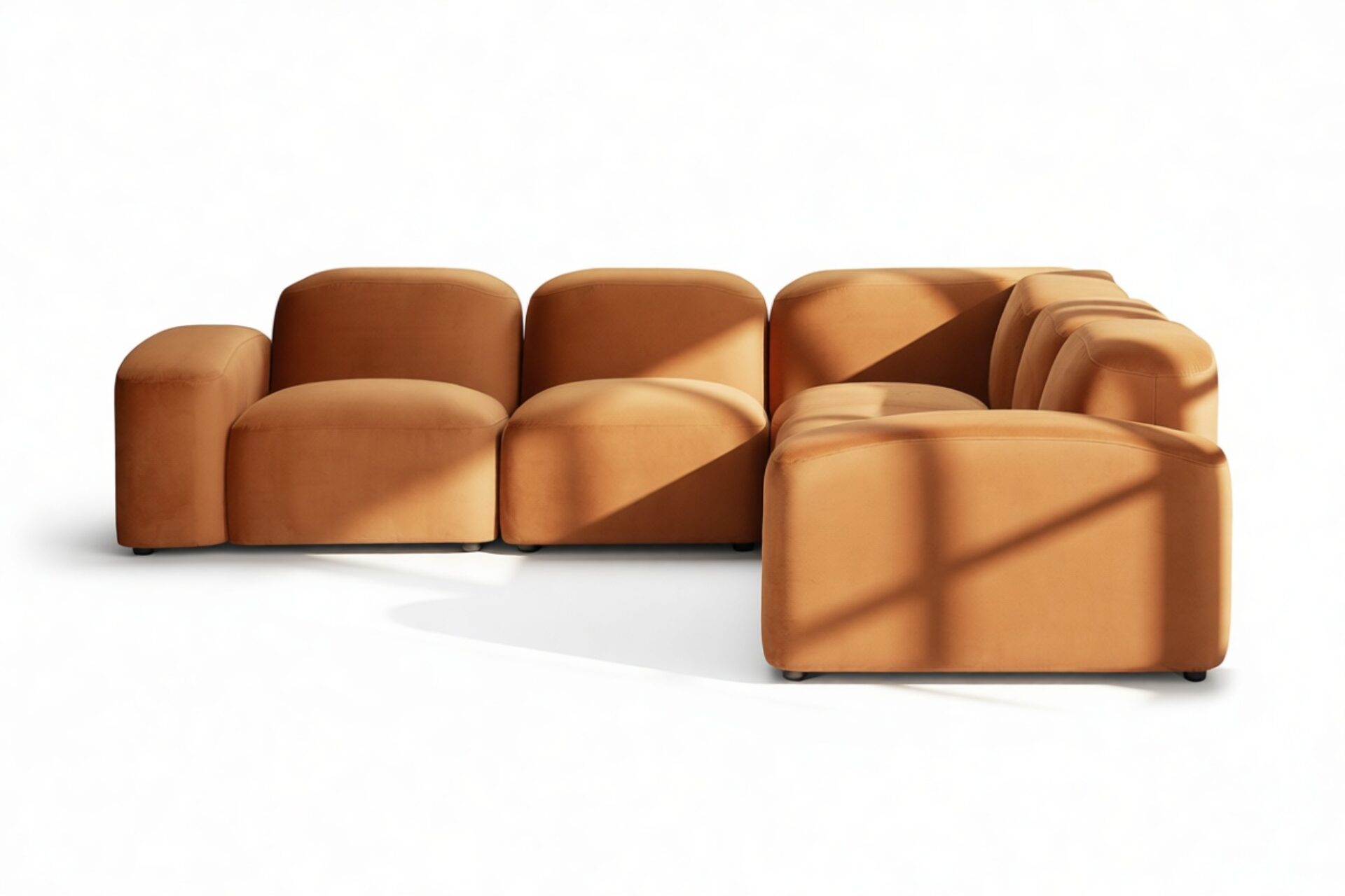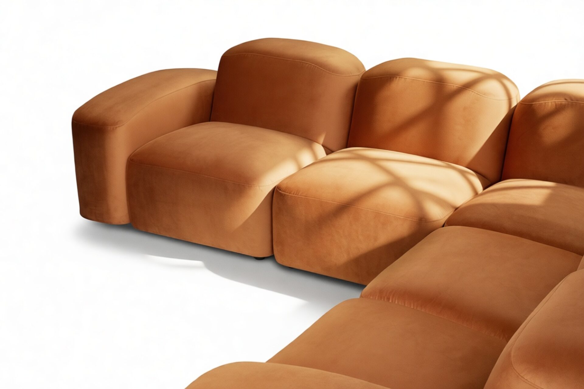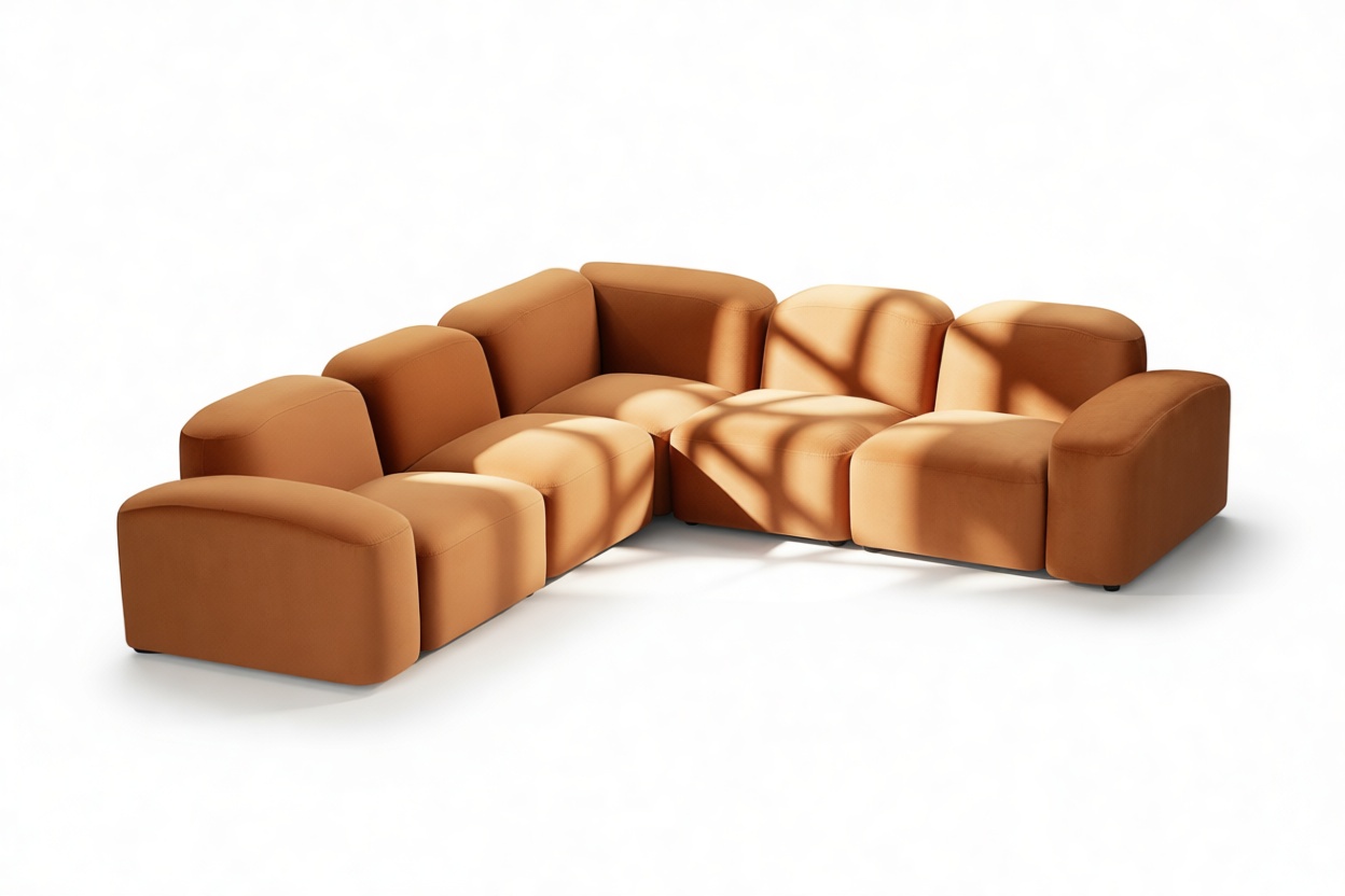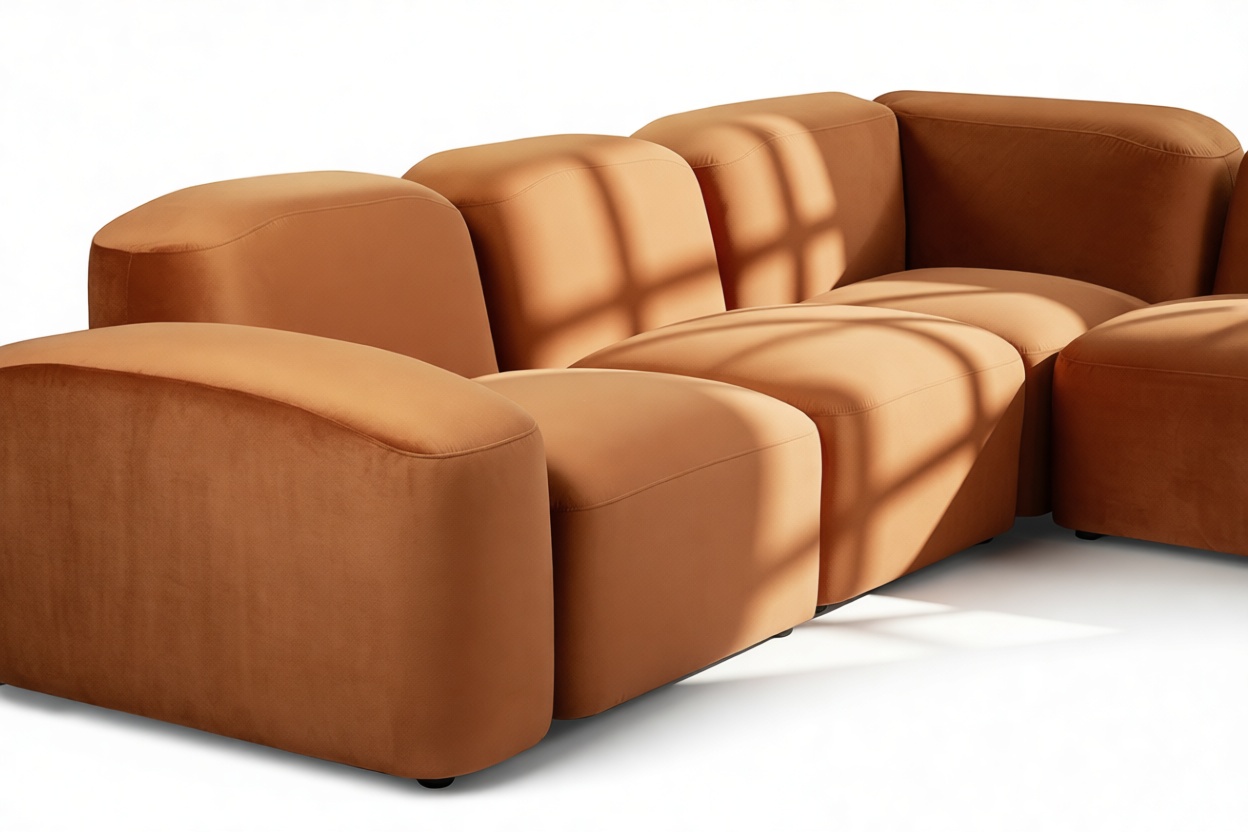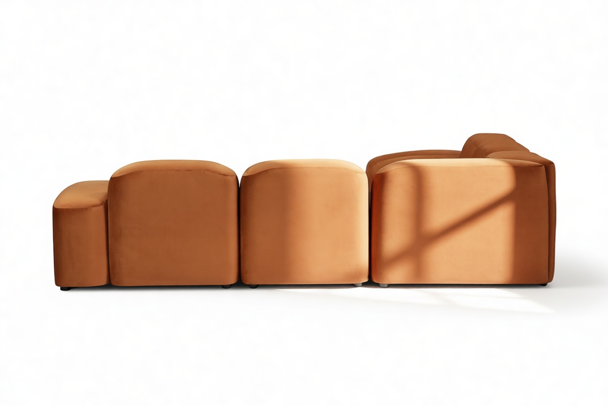 Sleek and eye-catching, the modules showcase plush velvet upholstery, sturdy arms, curved edges, and intricate stitching for both a tactile and visual allure. The burnt orange color infuses a hint of coziness and enduring elegance.