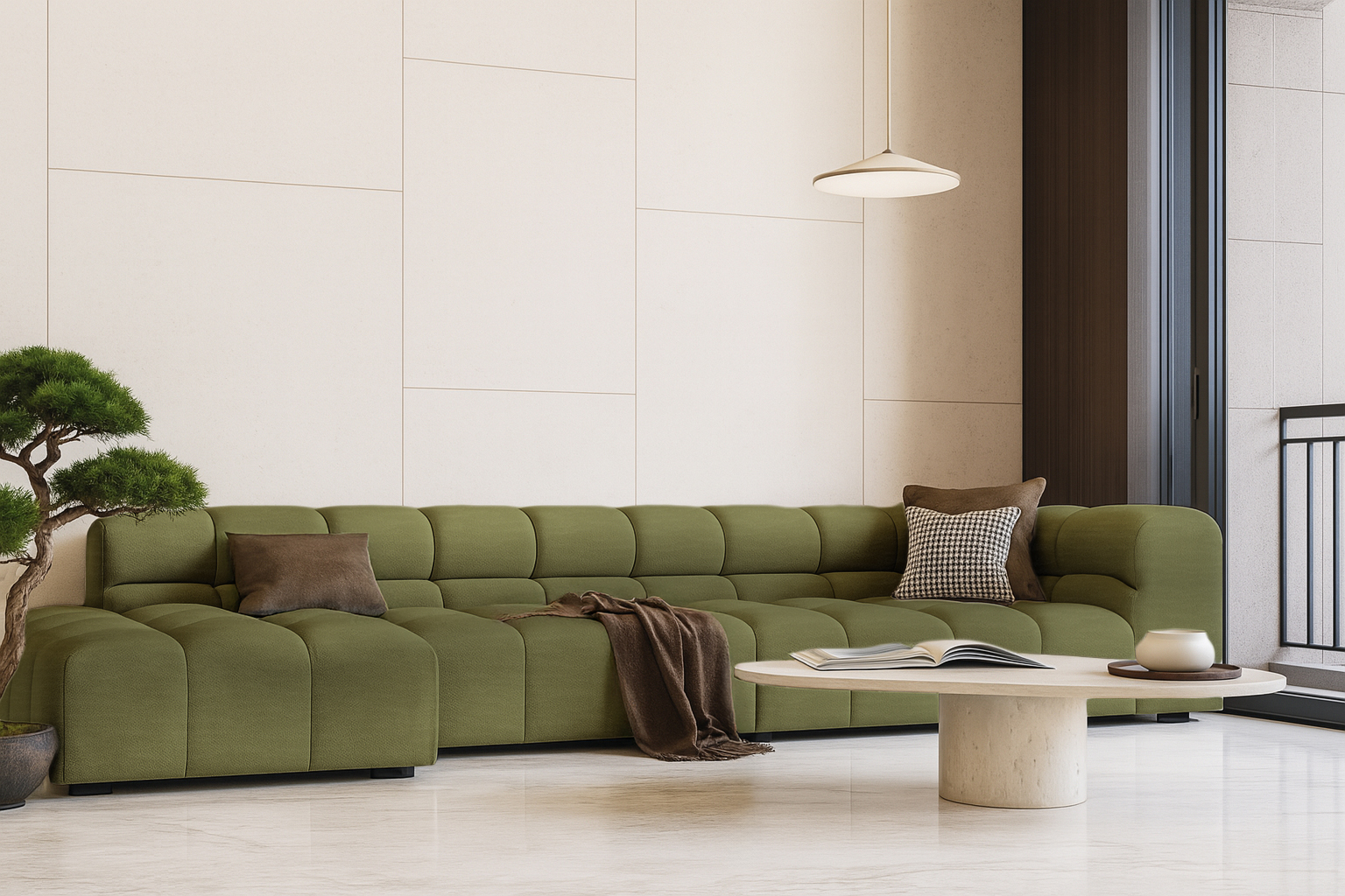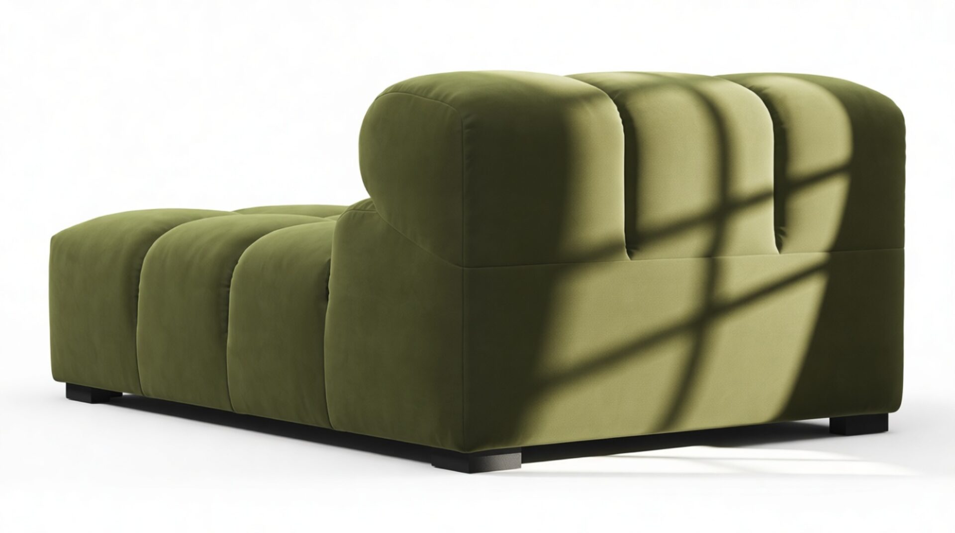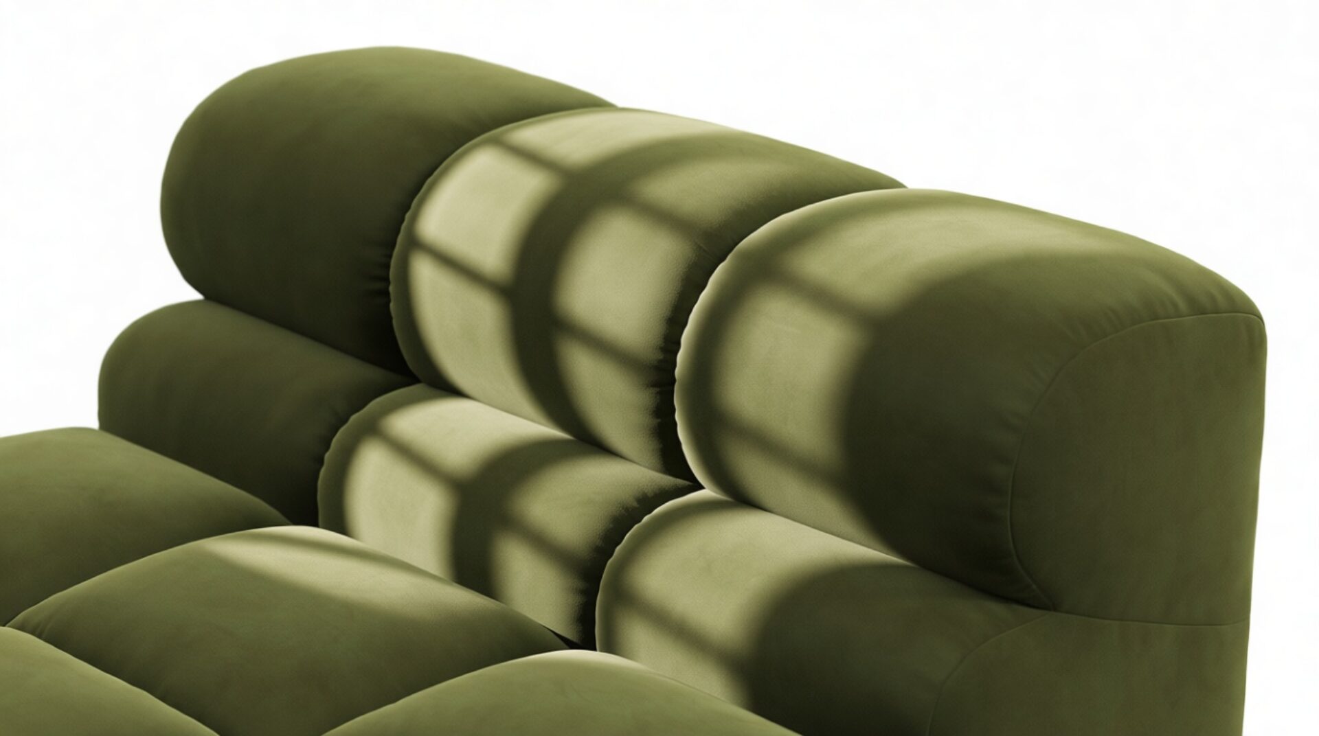 Introducing the Tufty sectional, a contemporary twist on the classic Chesterfield design infused with 70s vibes. This chic piece features a versatile modular layout, blending casual elegance with a playful aesthetic. Upholstered in Thyme Luxe Velvet, the Tufty's subtle curves and ample dimensions ensure a cozy and welcoming atmosphere in any setting, from modern lofts to spacious living spaces.