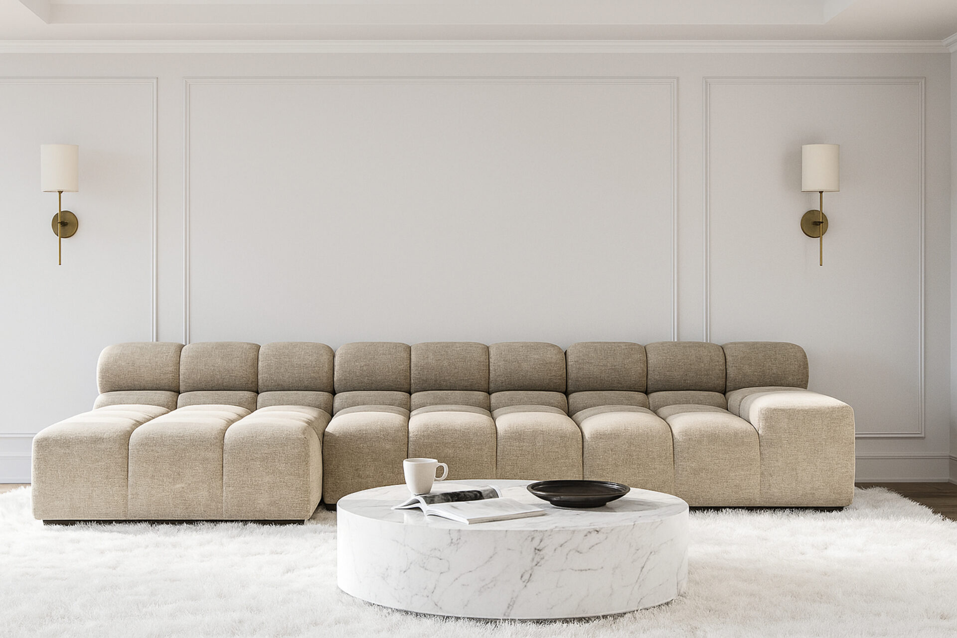Experience modern chic with the Tufty sectional, a contemporary interpretation of 70s design crafted in Beige Gray Chenille. This masterful modular furniture exudes an ultimate comfort with its relaxed and playful aesthetic, offering ample dimensions for lounging. Its chic outline, defined by subtle curves, ensures it seamlessly fits in various settings, welcoming you warmly.
