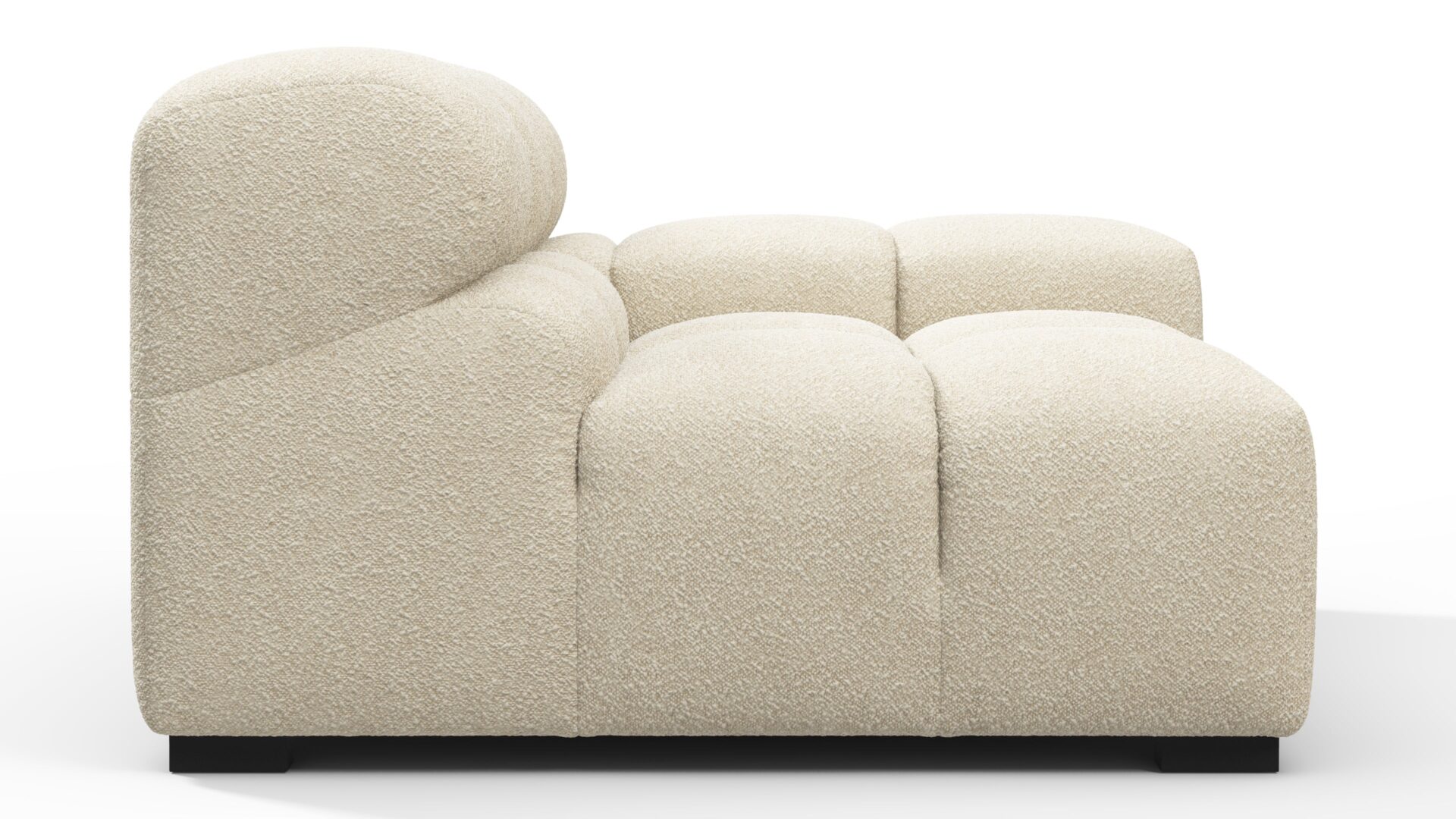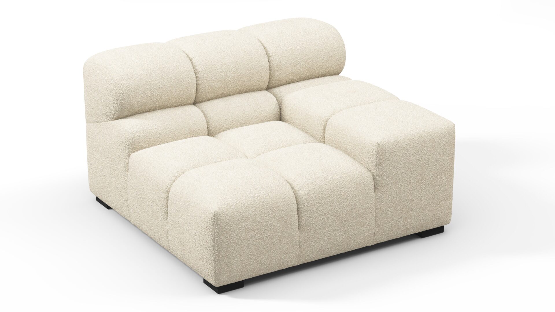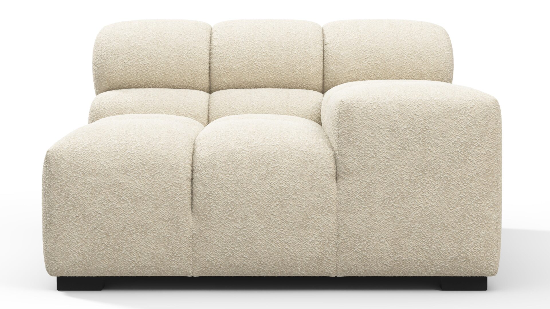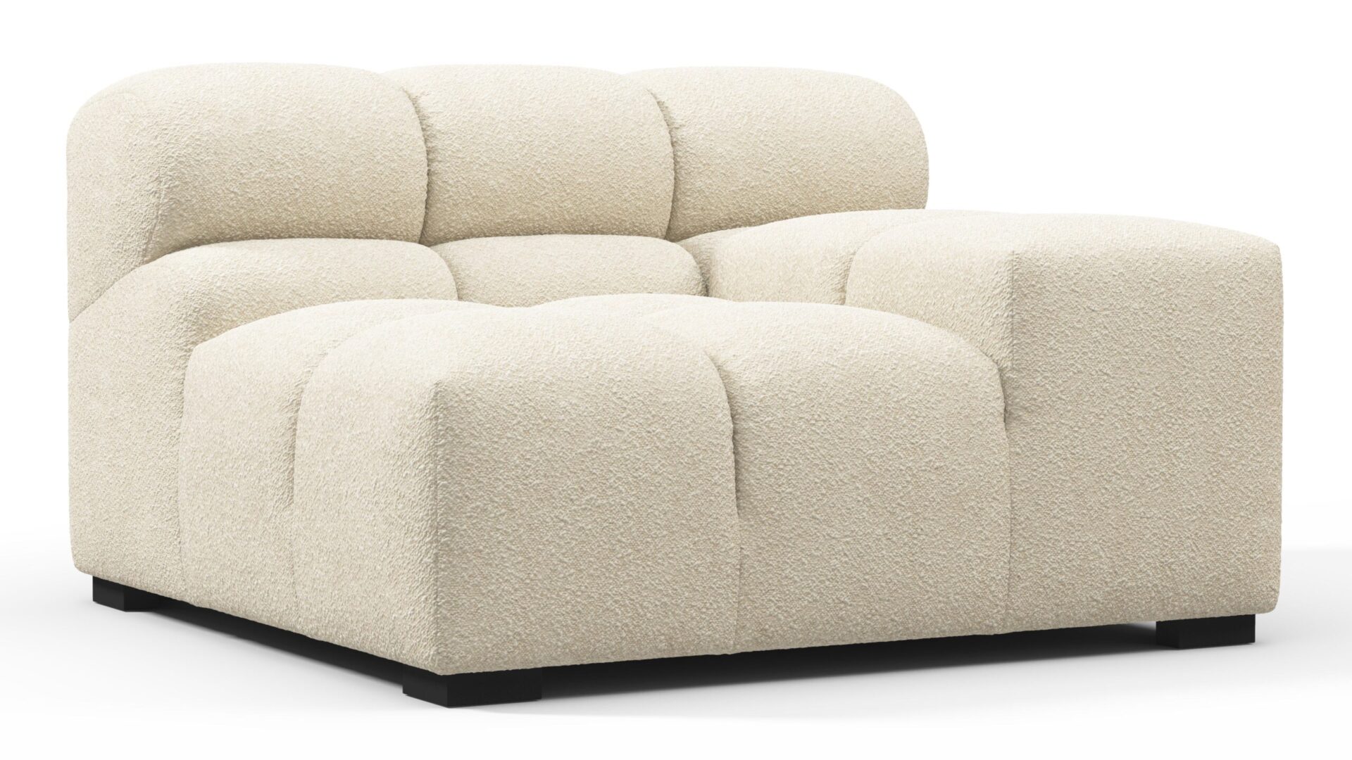 Introducing a modern twist on the classic Chesterfield style, the Tufty sectional exudes relaxed 70s vibes with its Eggshell Boucle material. This versatile piece embraces a simplistic modular design, effortlessly fitting into any space from city lofts to entertainment areas. With subtle curves and ample dimensions, it offers ultimate comfort while capturing attention with its casual yet elegant appeal, making it a chic addition to both modern and vintage interiors.