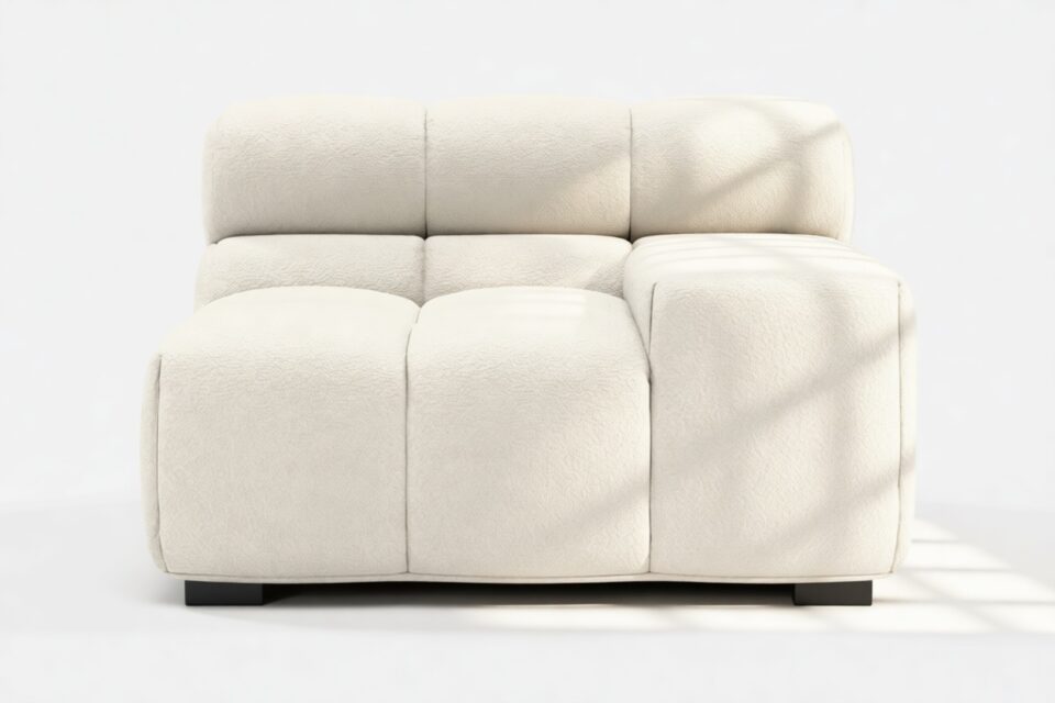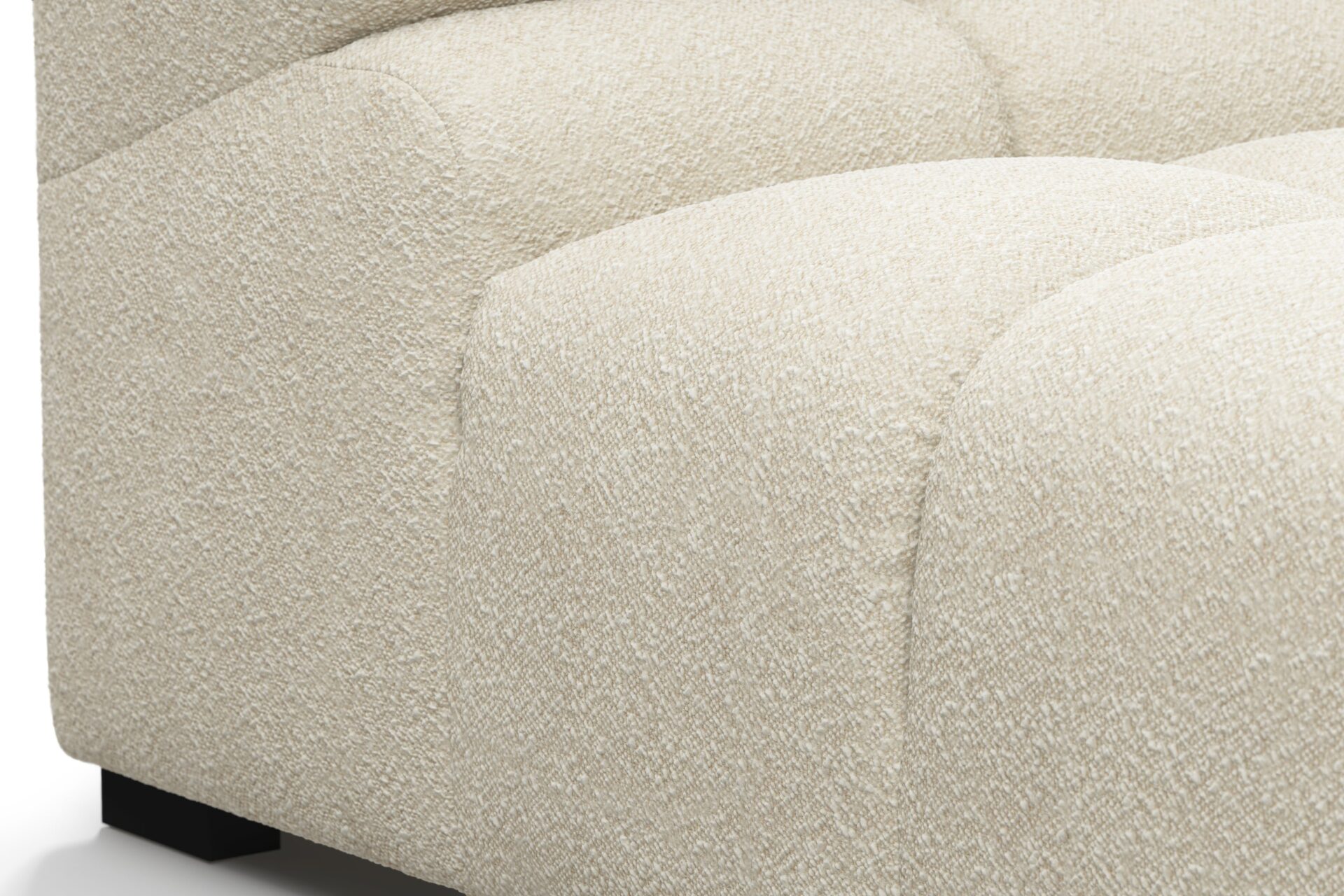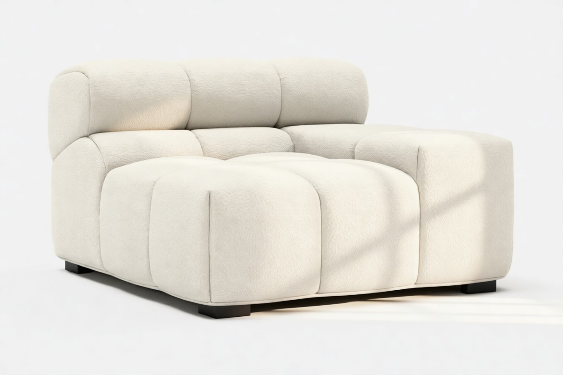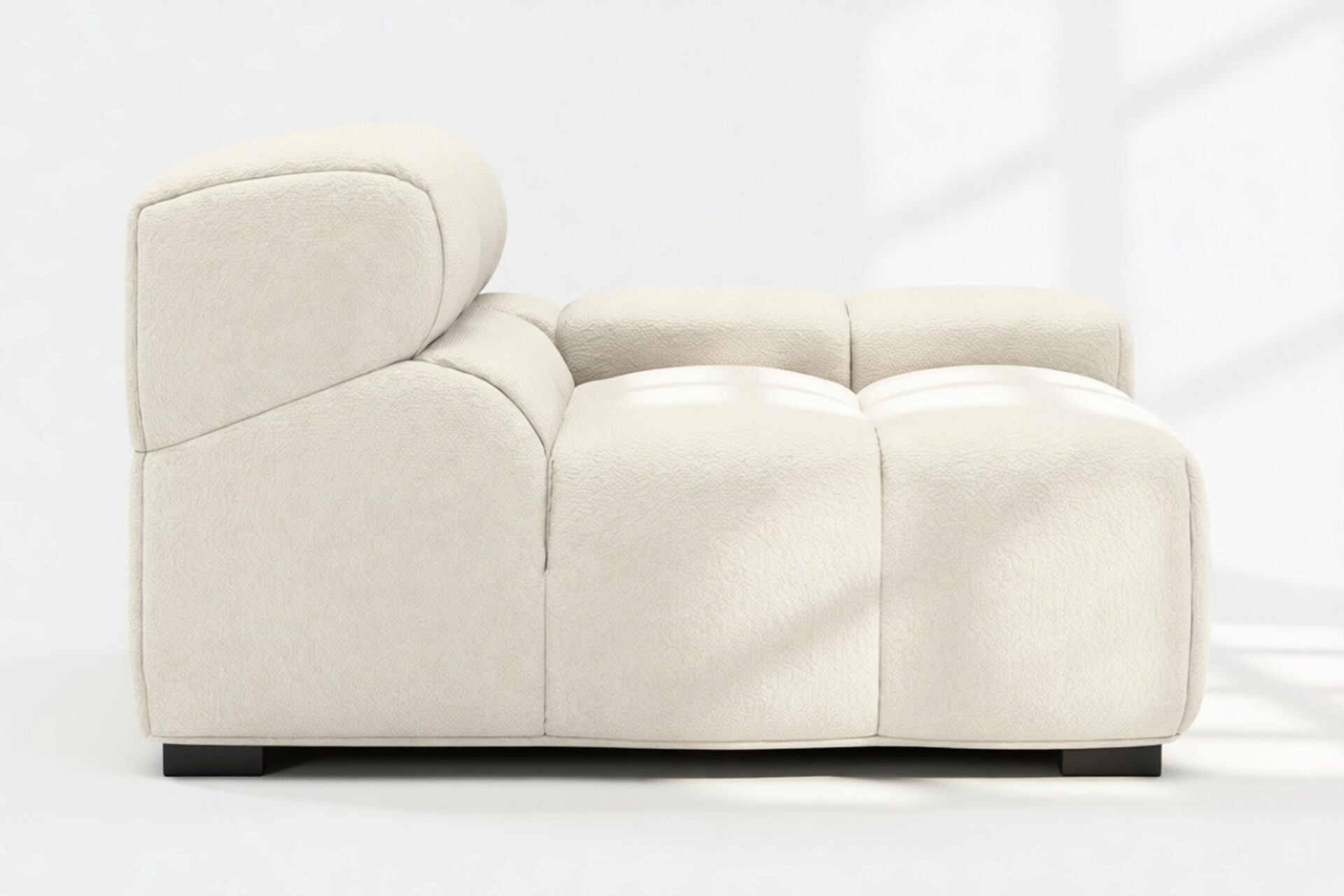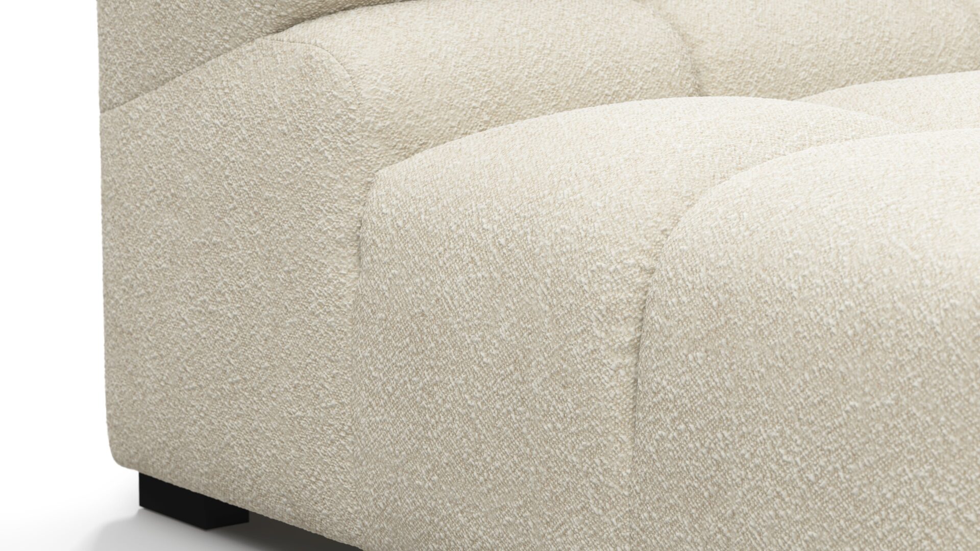 Introducing a modern twist on the classic Chesterfield style, the Tufty sectional exudes relaxed 70s vibes with its Eggshell Boucle material. This versatile piece embraces a simplistic modular design, effortlessly fitting into any space from city lofts to entertainment areas. With subtle curves and ample dimensions, it offers ultimate comfort while capturing attention with its casual yet elegant appeal, making it a chic addition to both modern and vintage interiors.