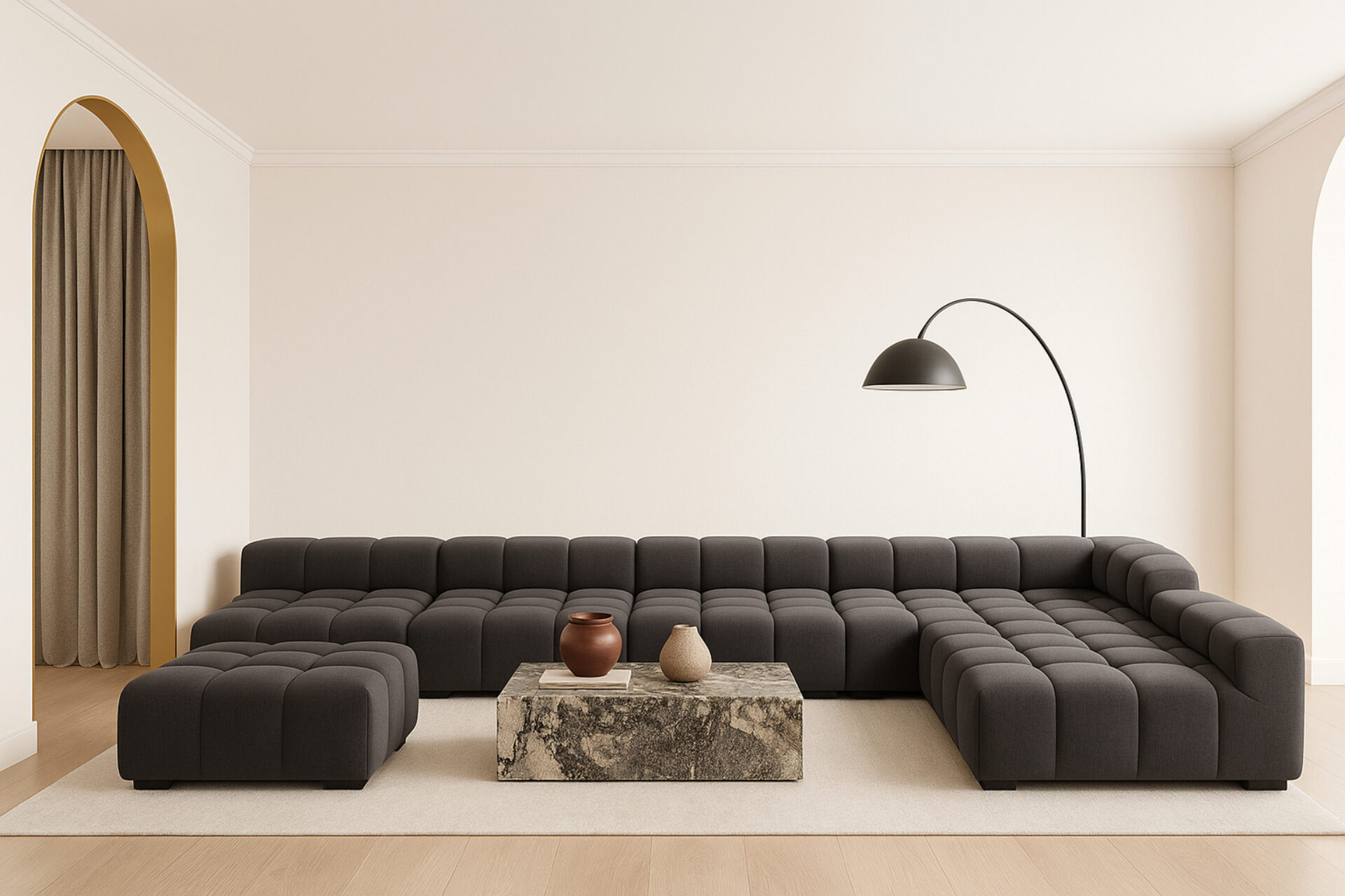 Embark on a modern twist of the classic Chesterfield design with the Tufty sectional. This 70s-inspired masterpiece seamlessly blends casual elegance and ultimate comfort, featuring subtle curves and shapes that set it apart. Crafted in Ink Brushed Weave, this versatile modular piece effortlessly enhances any setting, offering ample space for relaxation in style.