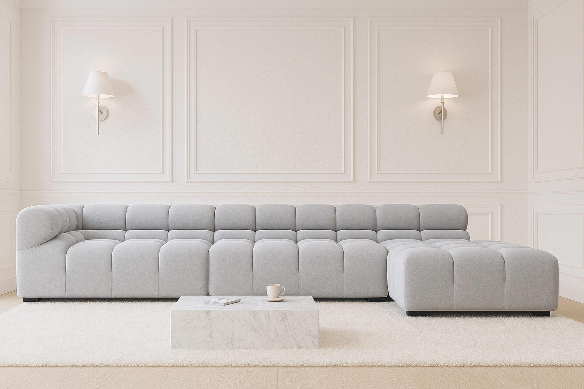 Experience a chic fusion of timeless elegance and relaxed 70s vibes with the Tufty sectional. This modern masterpiece boasts subtle curves and shapes that effortlessly blend into any modern or vintage setting, creating a welcoming ambiance. Crafted in light gray wool, this modular piece offers ultimate comfort and versatility, making it a democratic choice for diverse spaces.