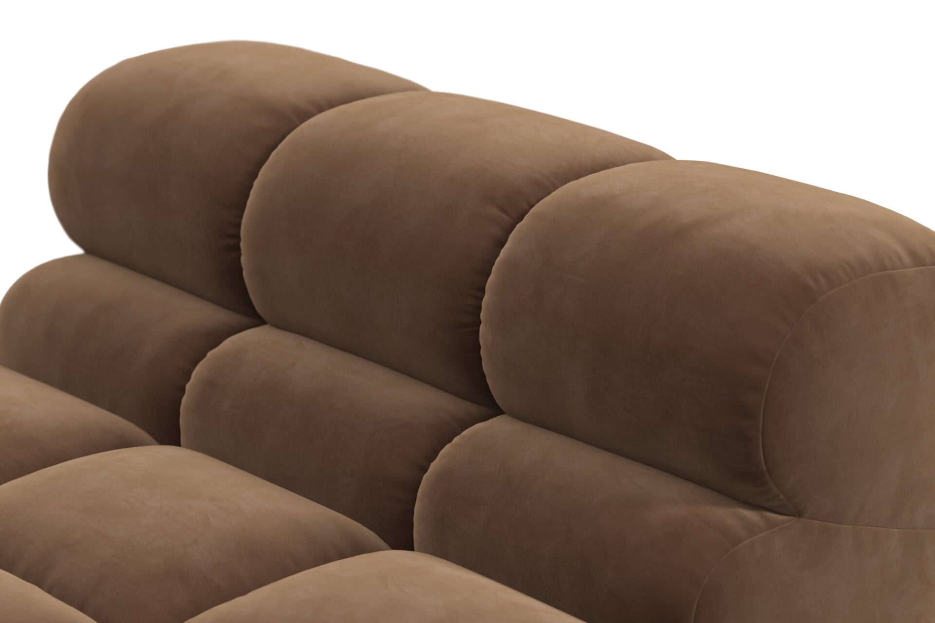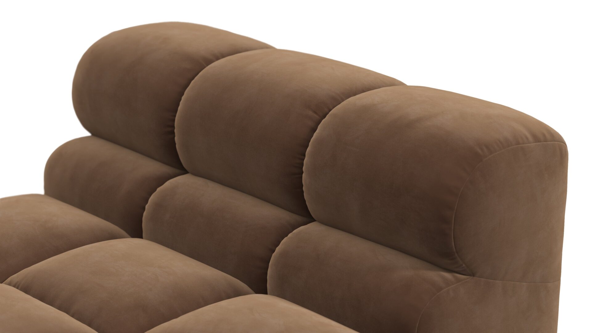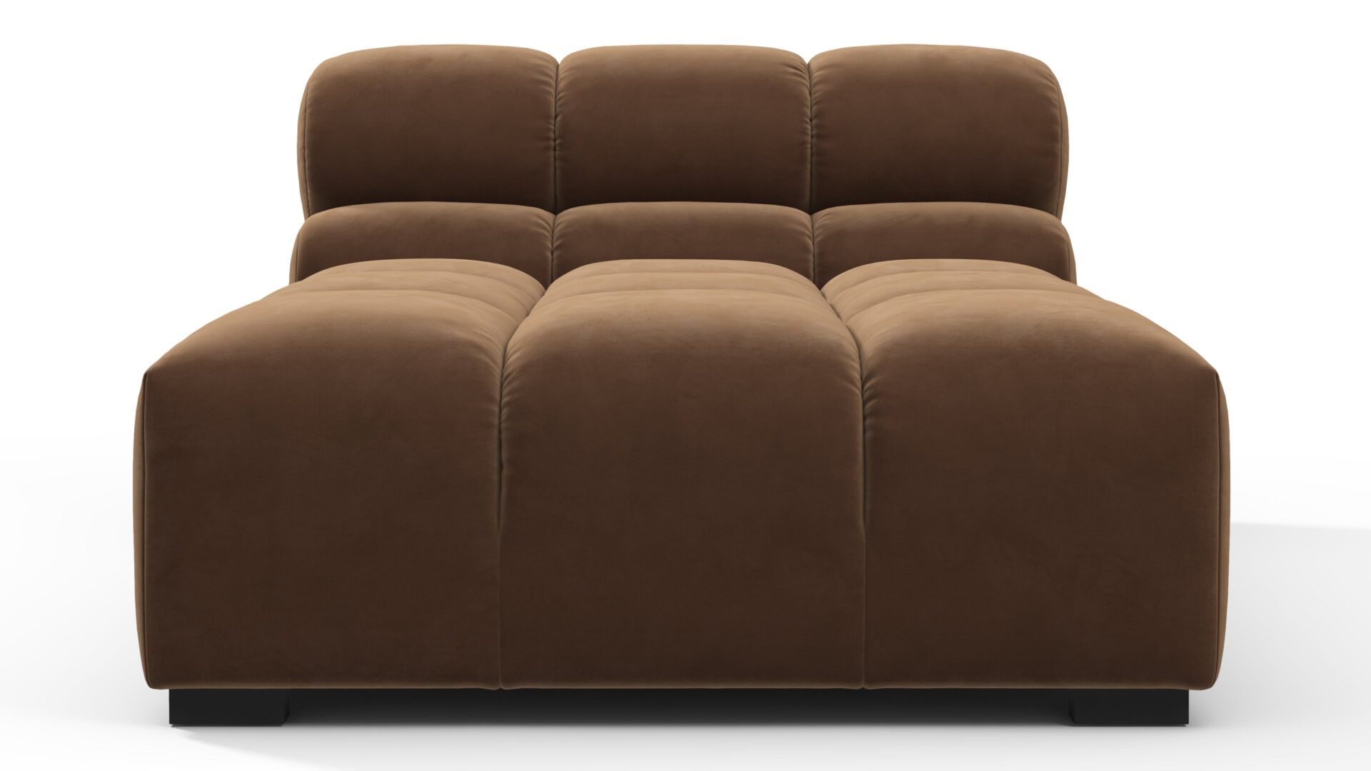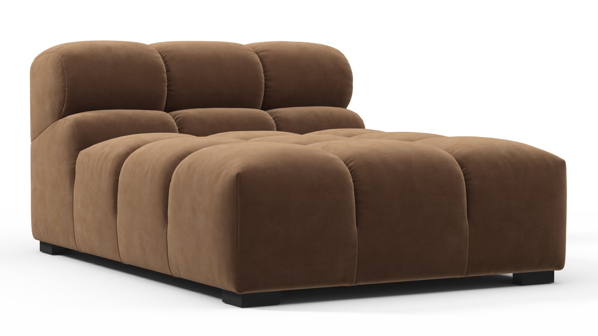 Introducing the Tufty sectional, a reinvented Chesterfield capitonné exuding 70s charm in Mocha Velvet. With its sleek, modular design, this contemporary masterpiece seamlessly blends into any setting, whether a chic city loft or expansive entertainment area. Its subtle curves and spacious bench-style foundation ensure ultimate comfort and a warm, inviting presence, perfect for modern or vintage interiors.