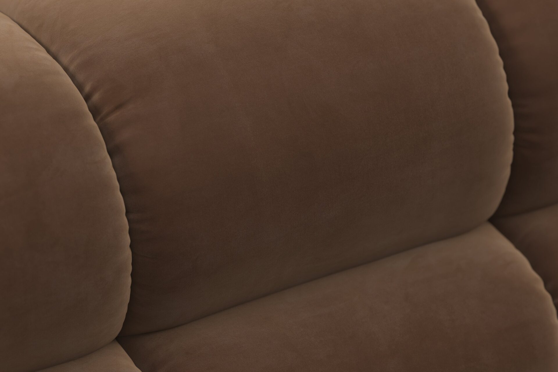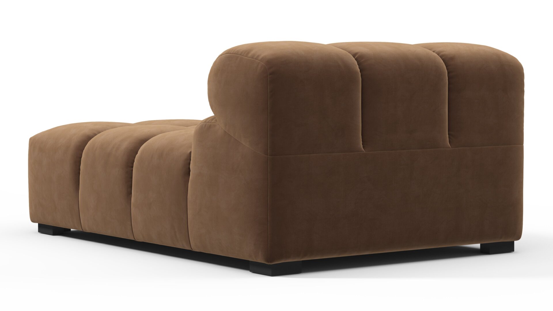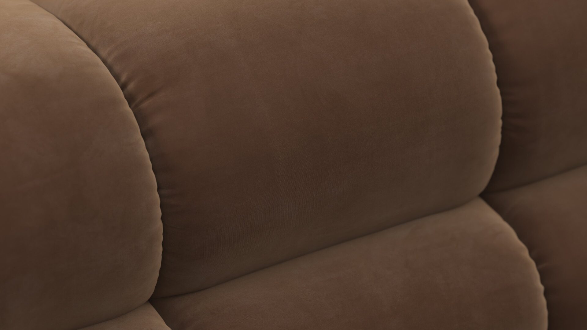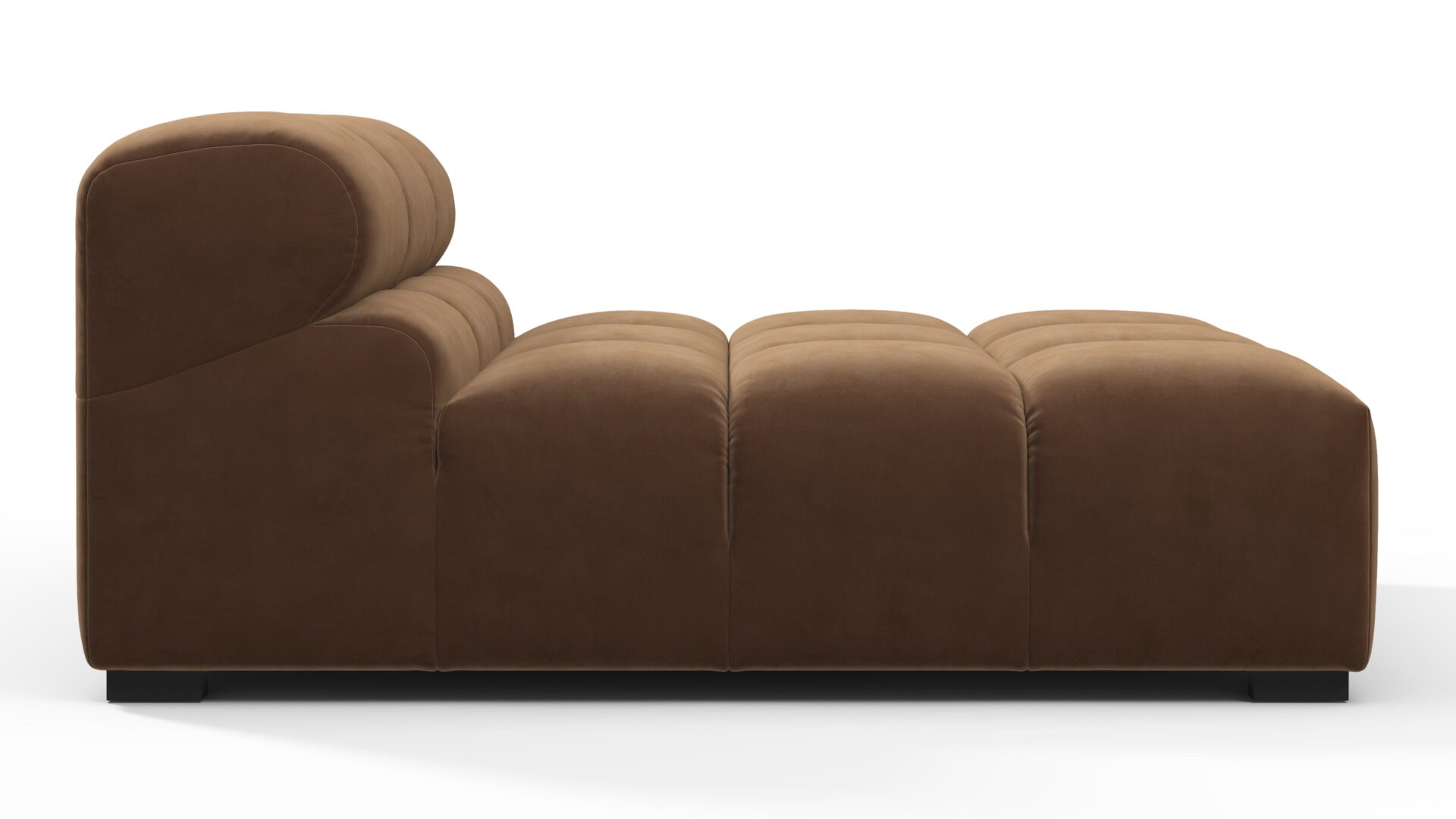 Introducing the Tufty sectional, a reinvented Chesterfield capitonné exuding 70s charm in Mocha Velvet. With its sleek, modular design, this contemporary masterpiece seamlessly blends into any setting, whether a chic city loft or expansive entertainment area. Its subtle curves and spacious bench-style foundation ensure ultimate comfort and a warm, inviting presence, perfect for modern or vintage interiors.