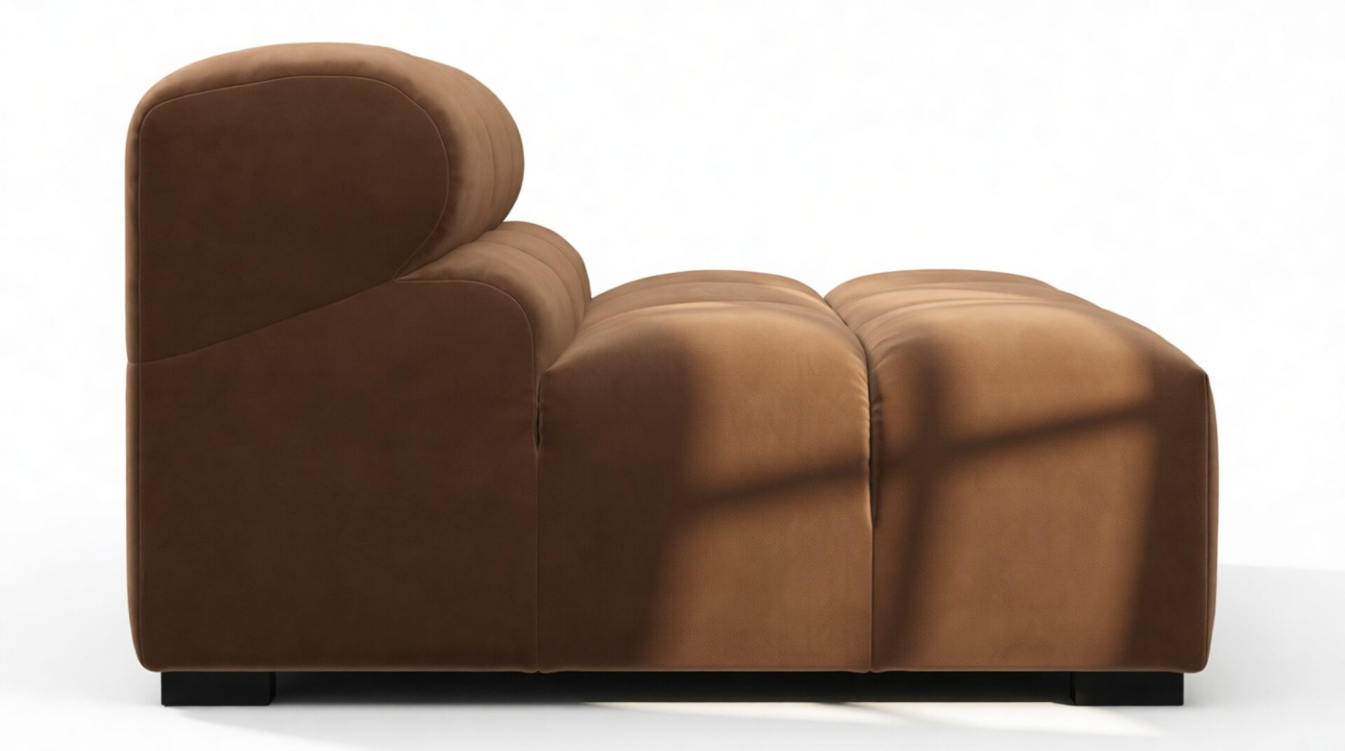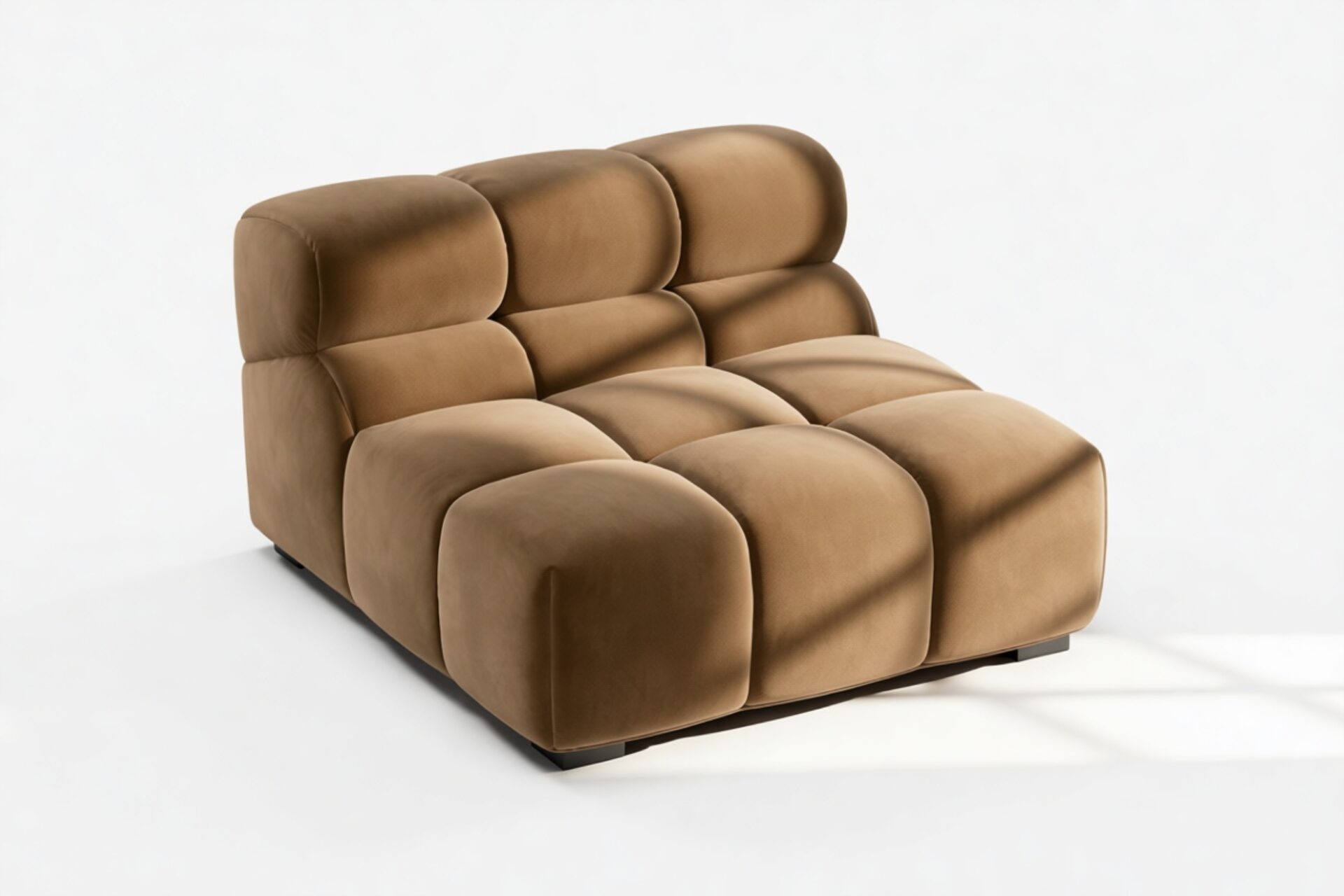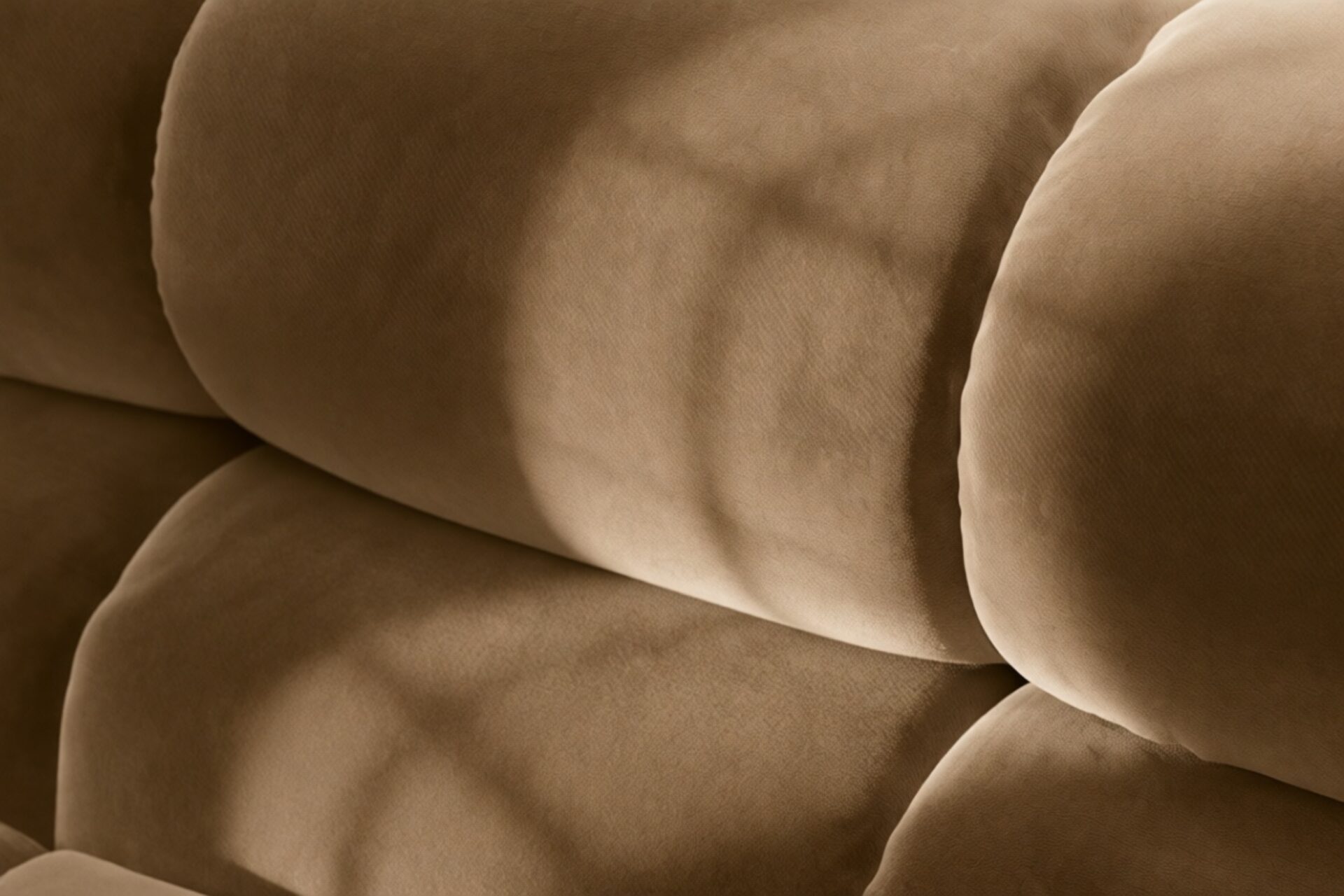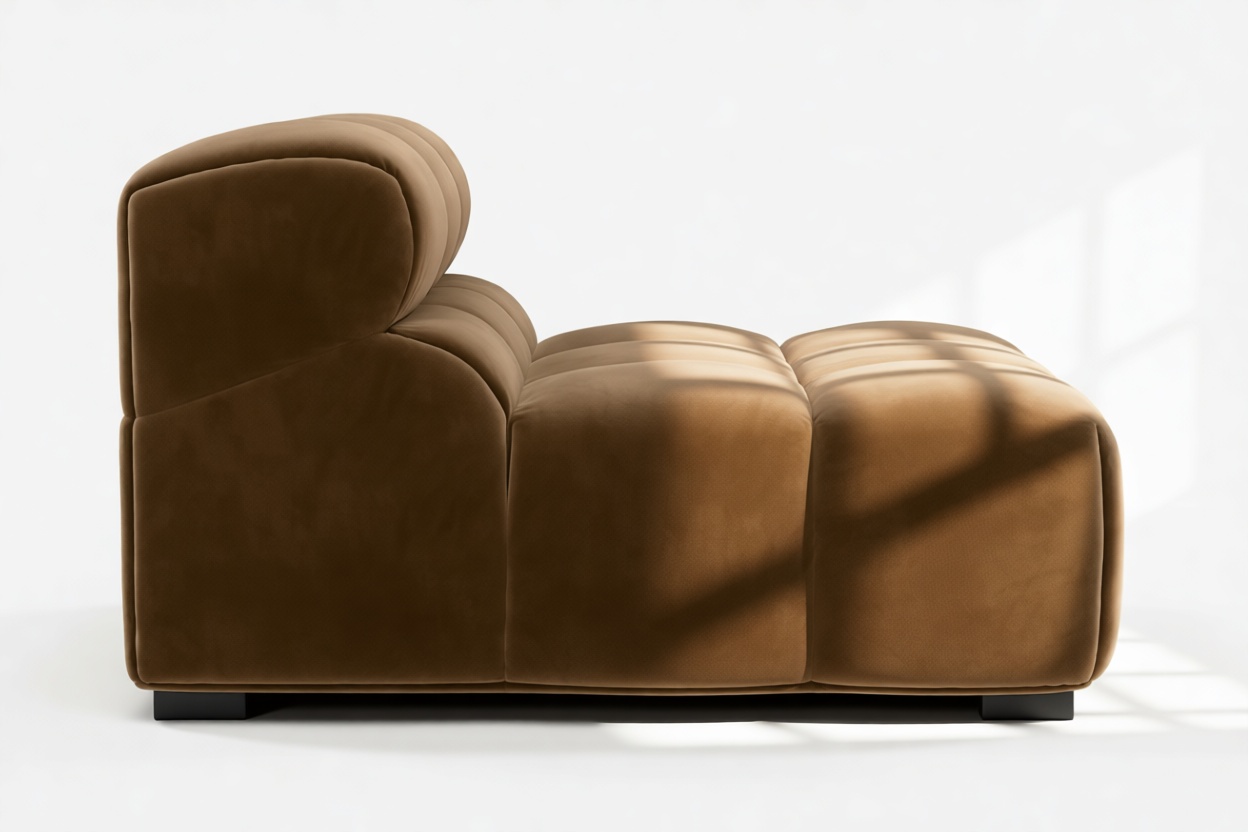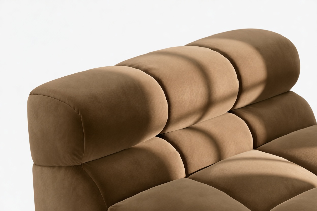Introducing the Tufty sectional, a modern twist on the classic Chesterfield capitonné infused with relaxed 70s vibes. Featuring a chic Mocha Velvet material, this versatile masterpiece boasts a modular design for easy adaptation to any space. With subtle curves and ample dimensions, it exudes casual elegance and ultimate comfort, perfect for modern or vintage interiors.