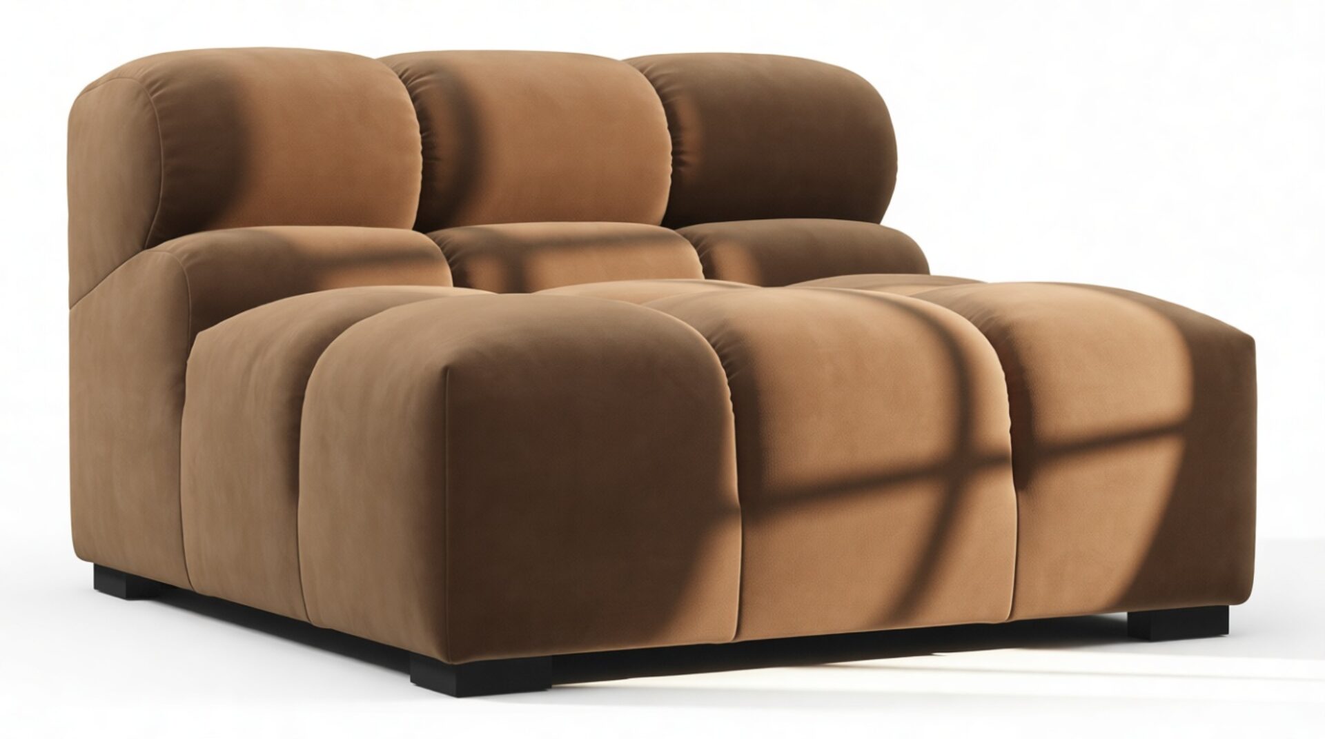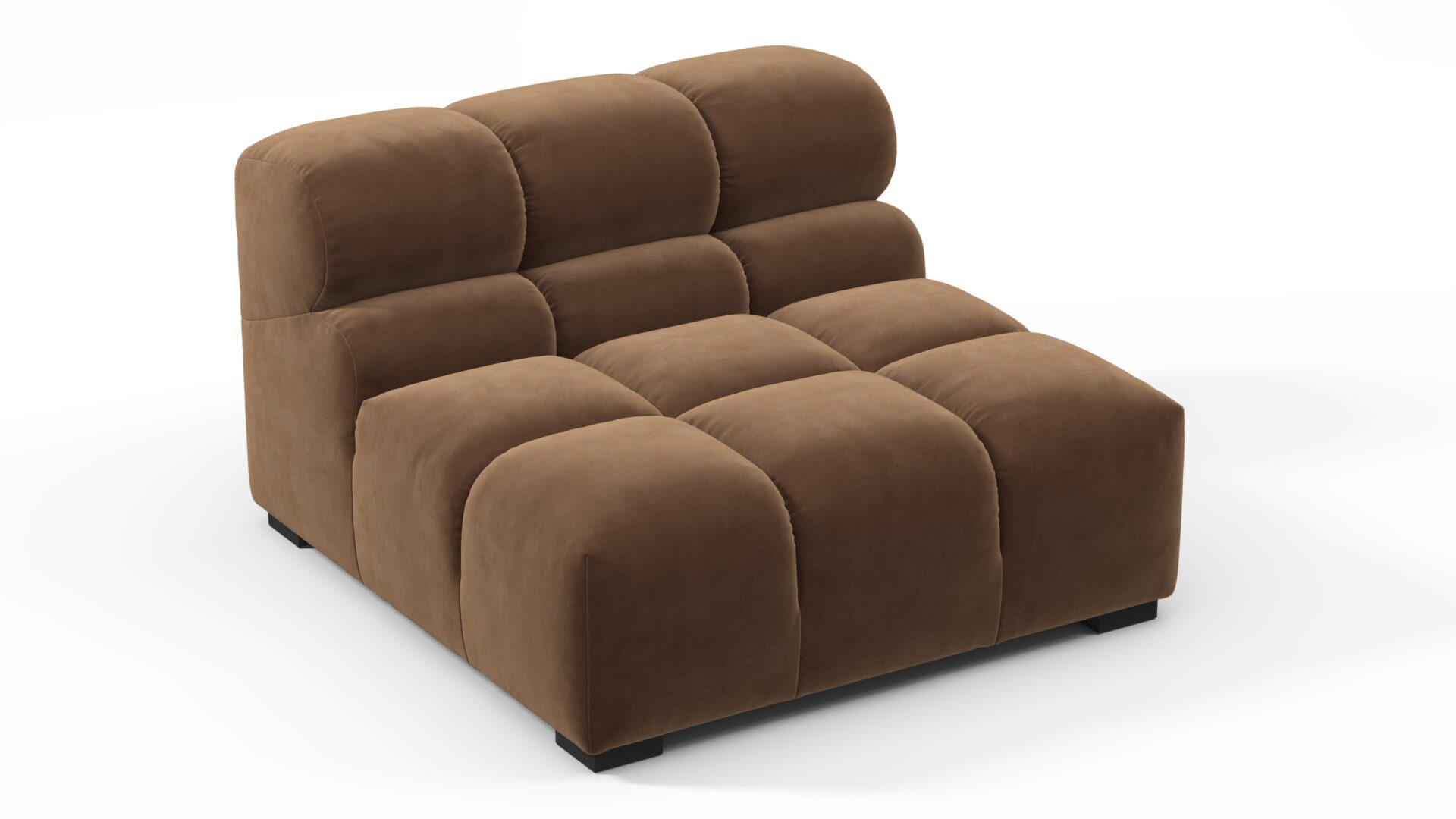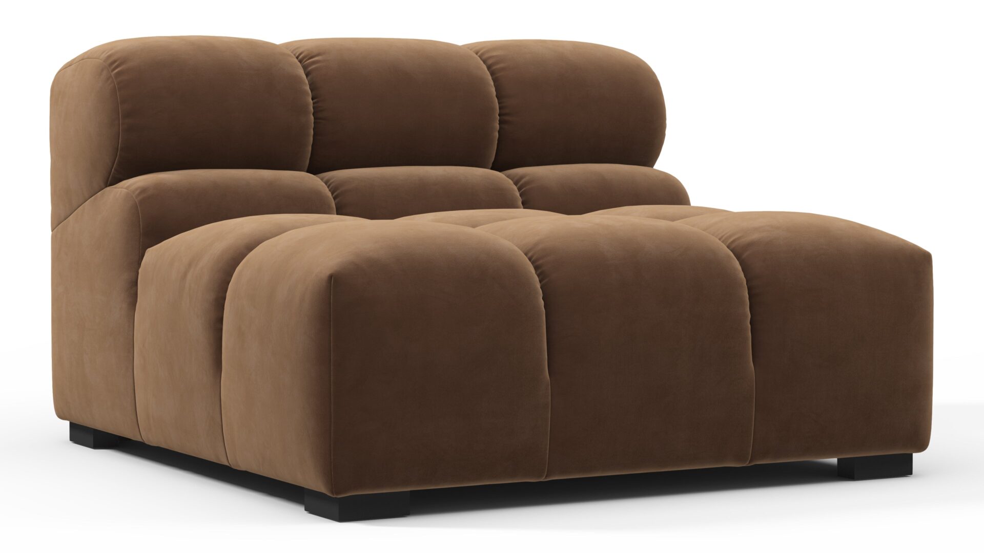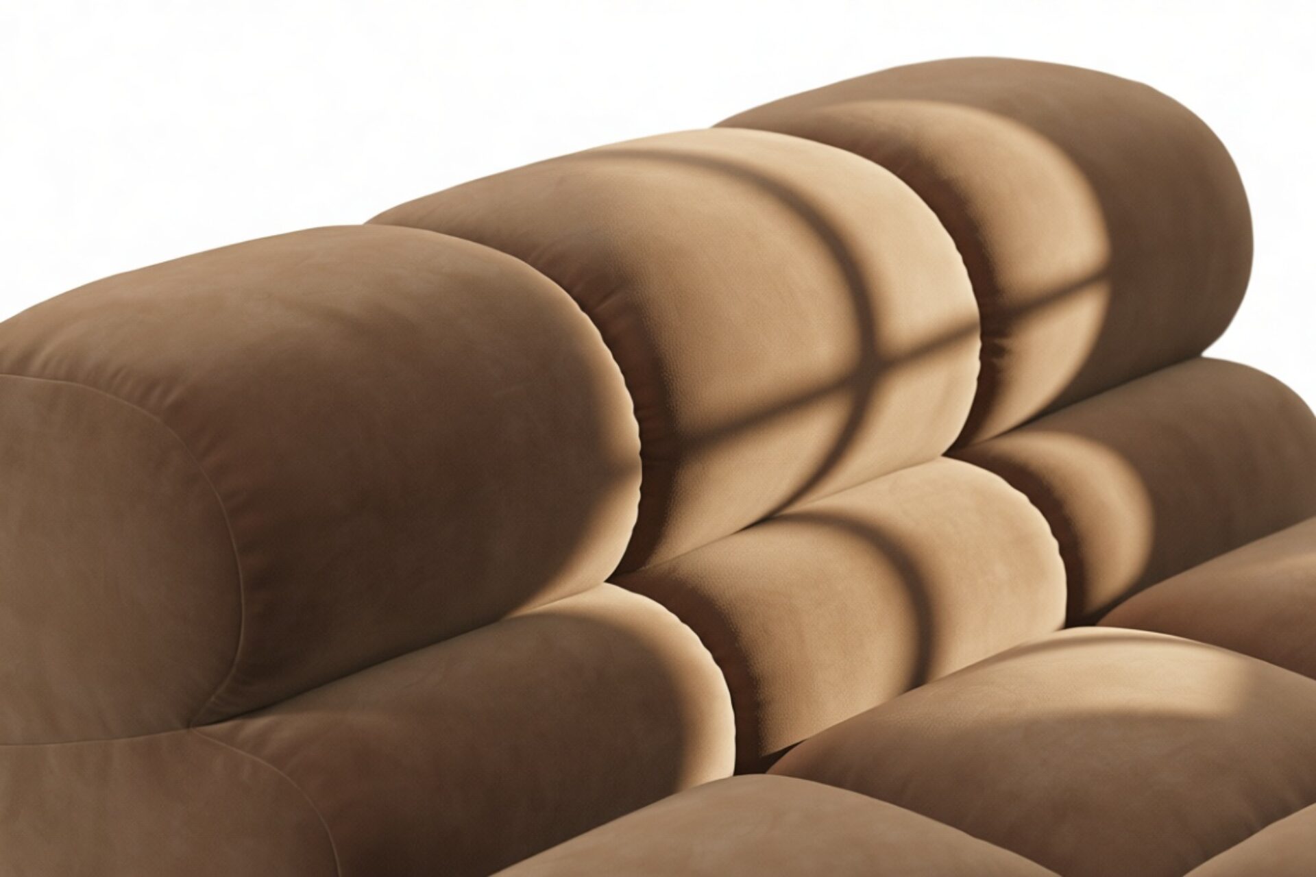 Introducing the Tufty sectional, a modern twist on the classic Chesterfield capitonné infused with relaxed 70s vibes. Featuring a chic Mocha Velvet material, this versatile masterpiece boasts a modular design for easy adaptation to any space. With subtle curves and ample dimensions, it exudes casual elegance and ultimate comfort, perfect for modern or vintage interiors.
