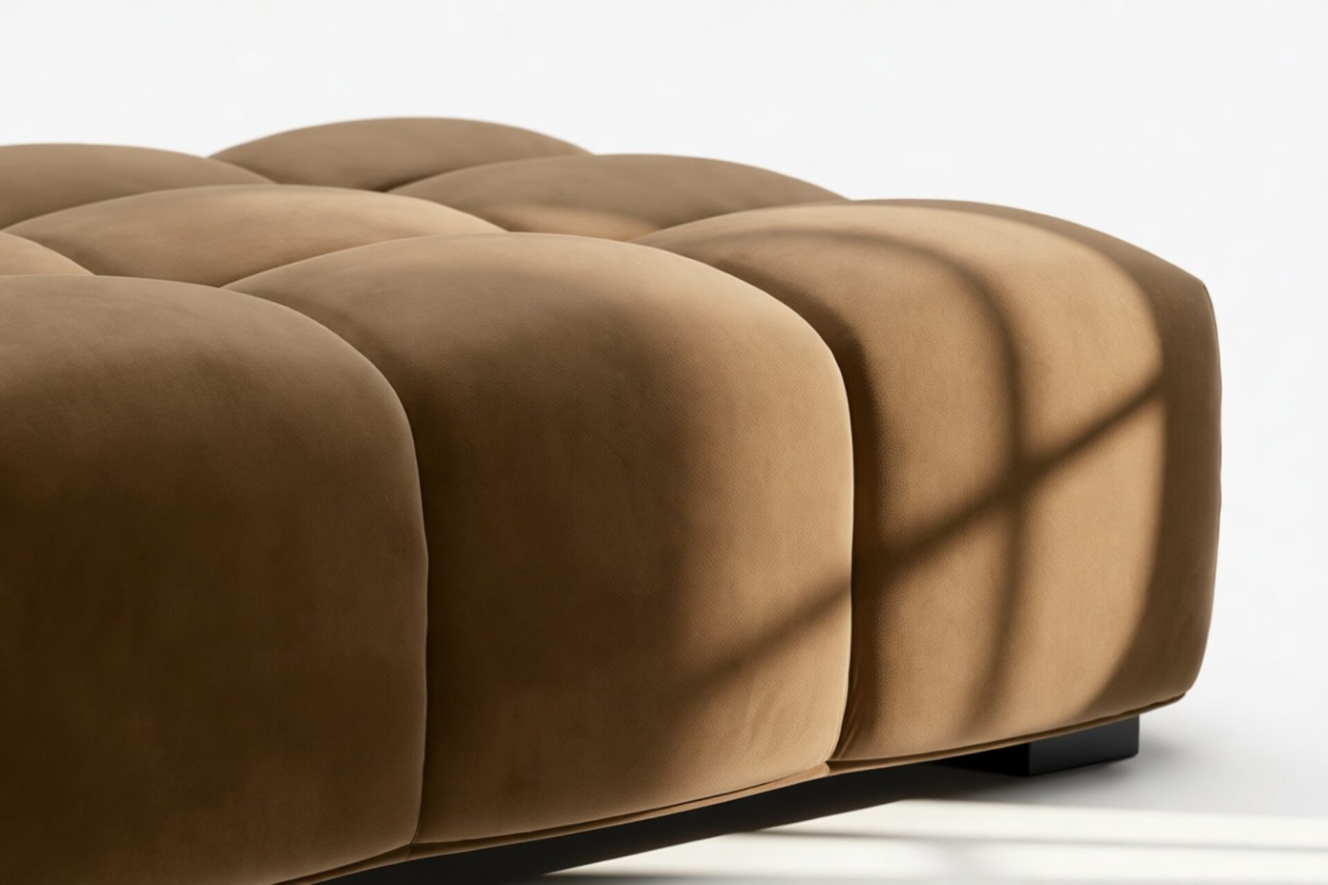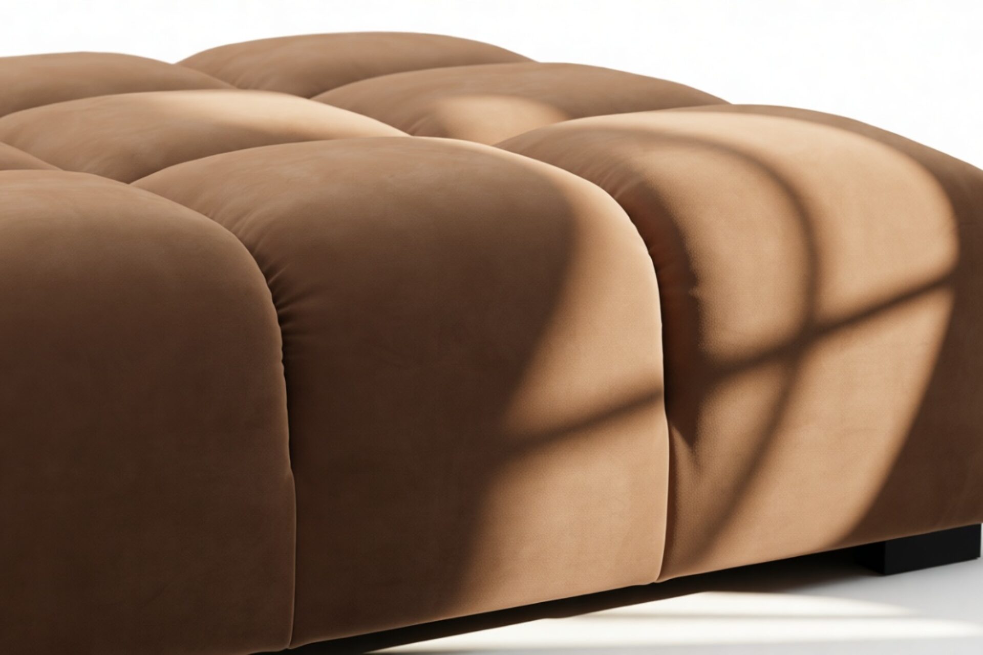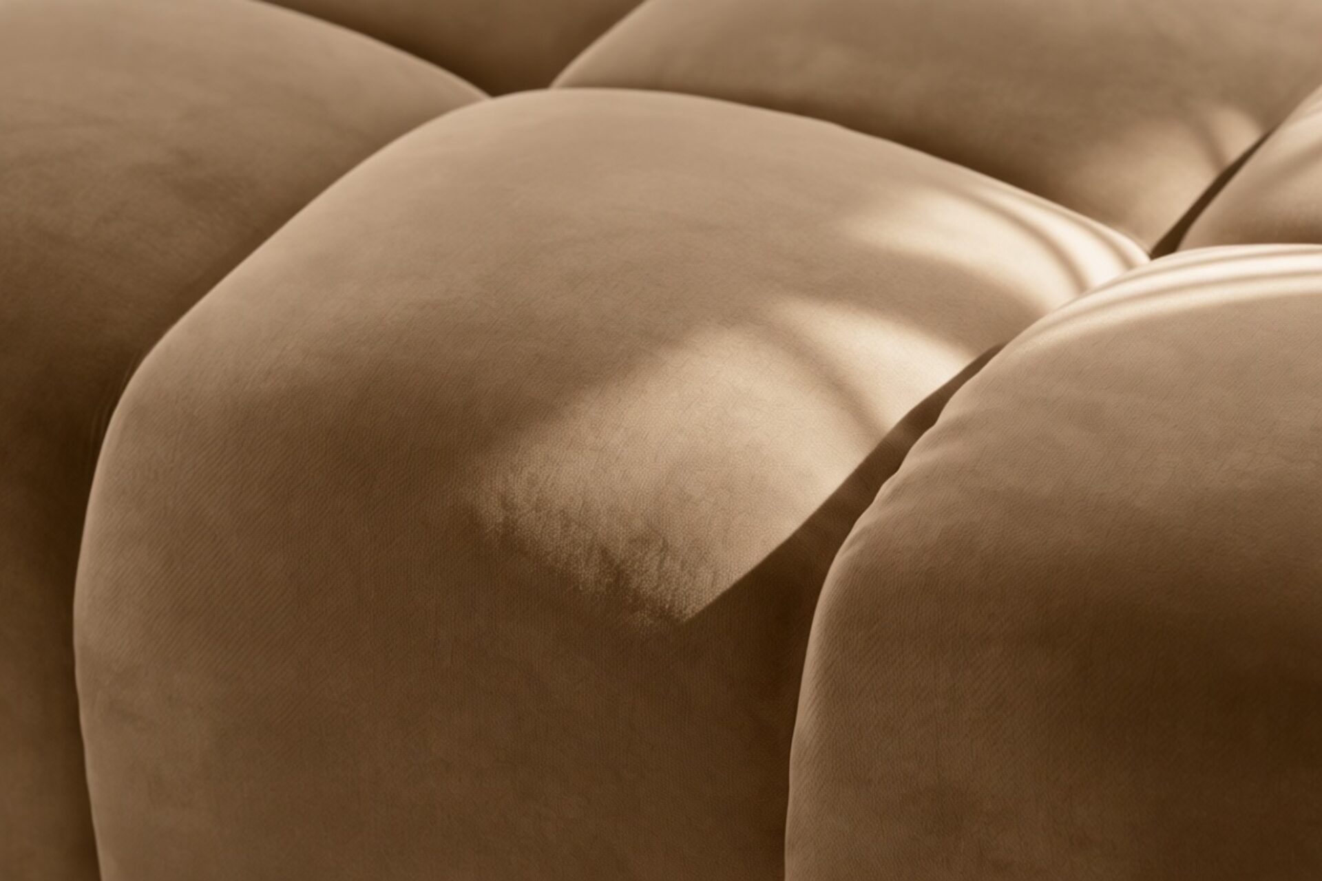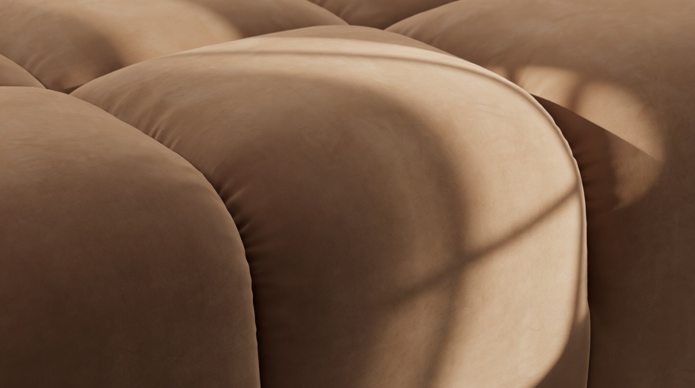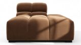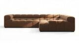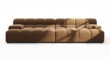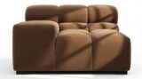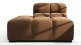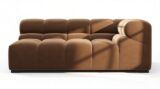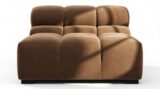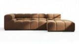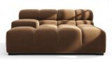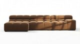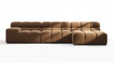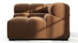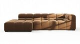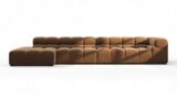 Introducing the Tufty sectional, a modern twist on the classic Chesterfield style, featuring the relaxed 70s vibe in Mocha Velvet. This chic piece embodies versatility with a playful design, making it a perfect fit for any space, from city lofts to entertainment areas. Its subtle curves and bench-style layout offer ultimate comfort and casual elegance, seamlessly blending into both modern and vintage interiors.