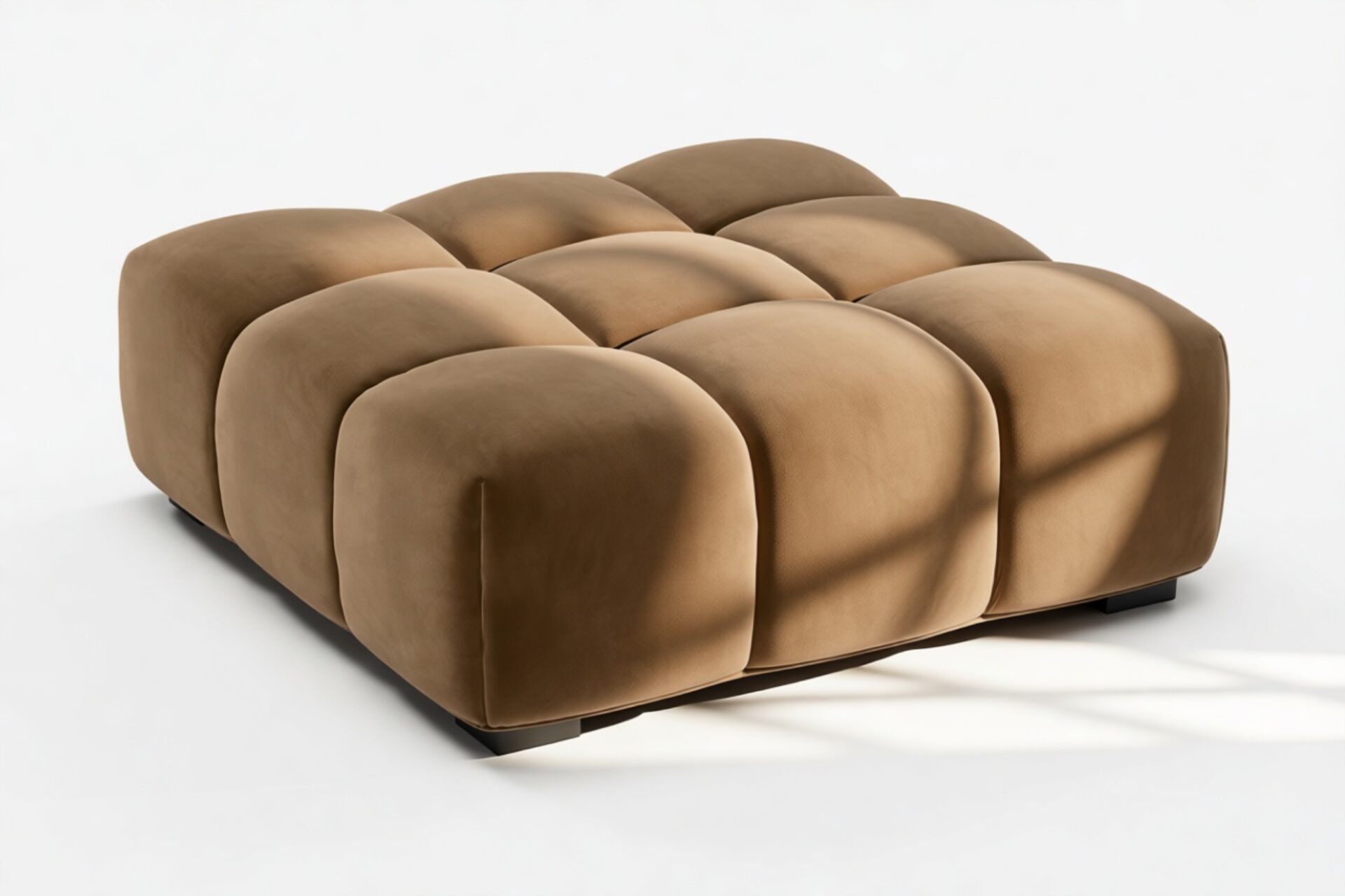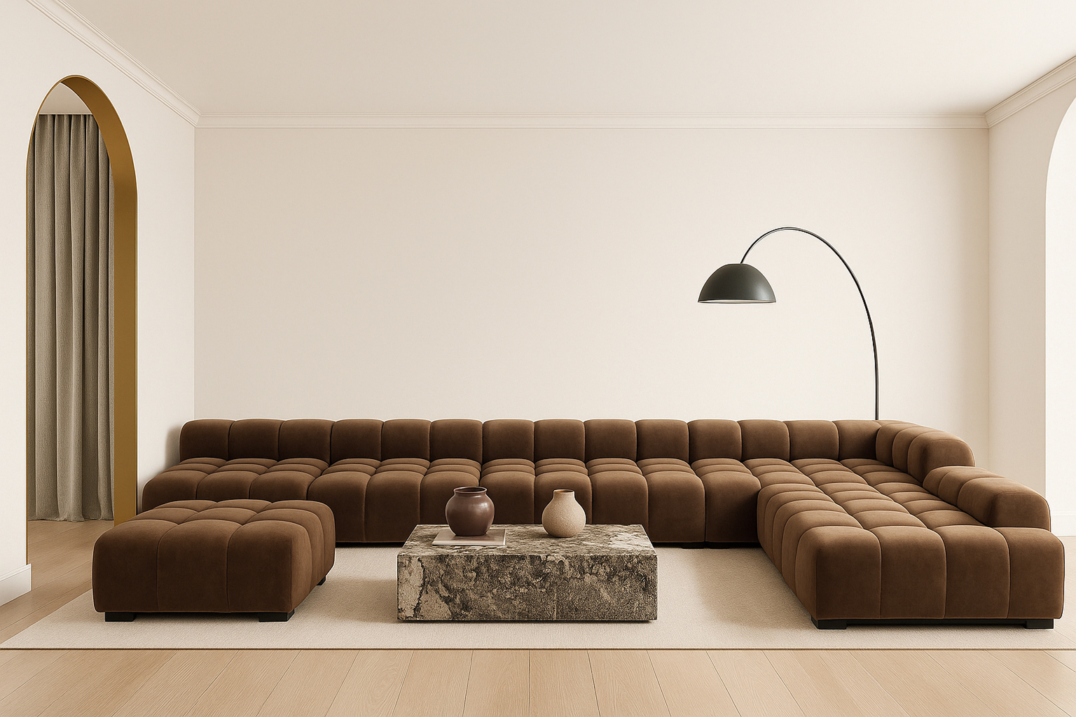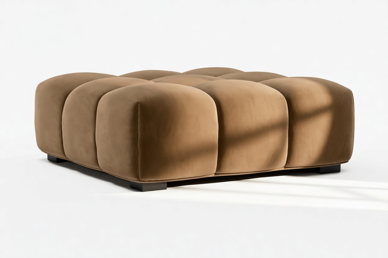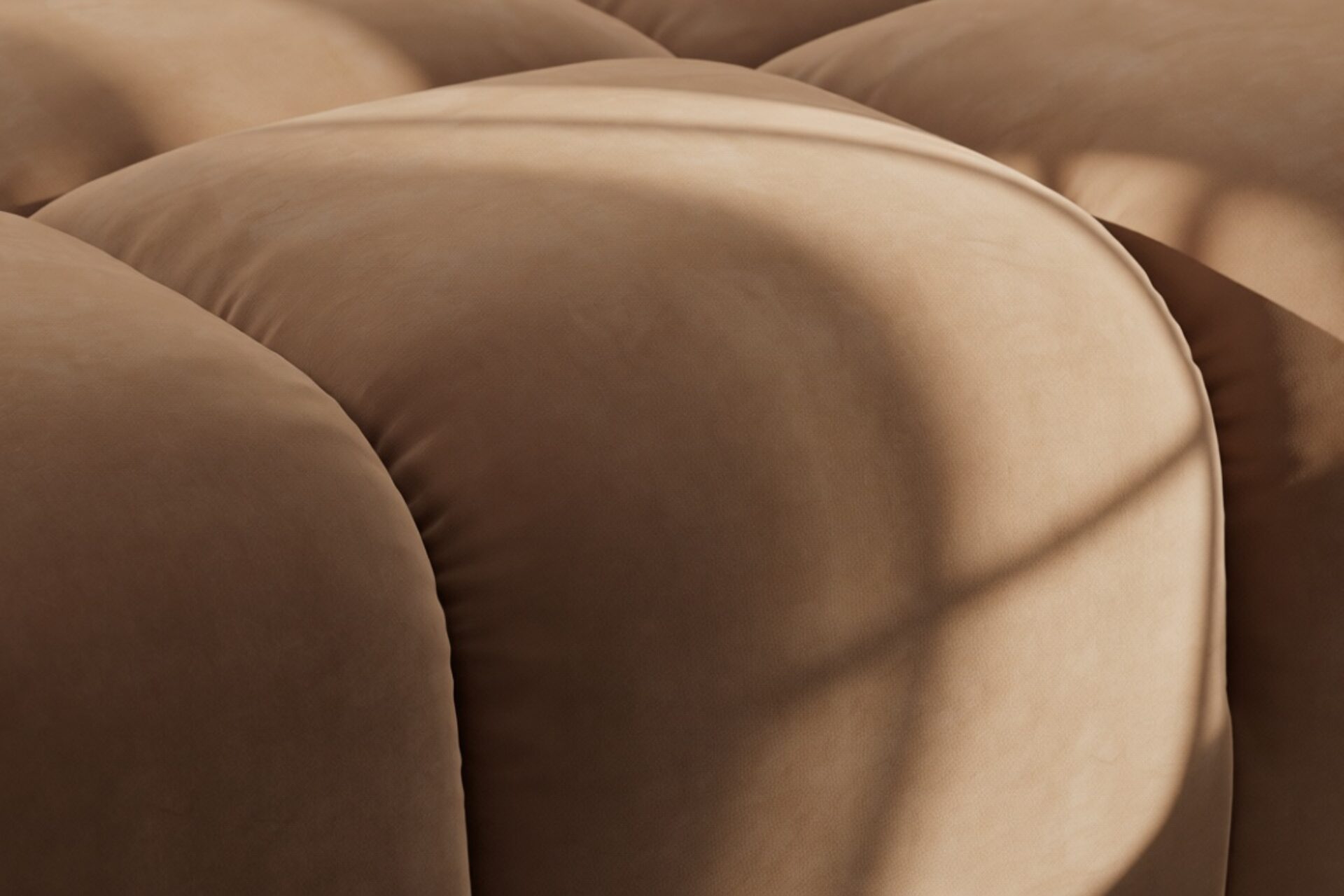 Introducing the Tufty sectional, a modern twist on the classic Chesterfield style, featuring the relaxed 70s vibe in Mocha Velvet. This chic piece embodies versatility with a playful design, making it a perfect fit for any space, from city lofts to entertainment areas. Its subtle curves and bench-style layout offer ultimate comfort and casual elegance, seamlessly blending into both modern and vintage interiors.