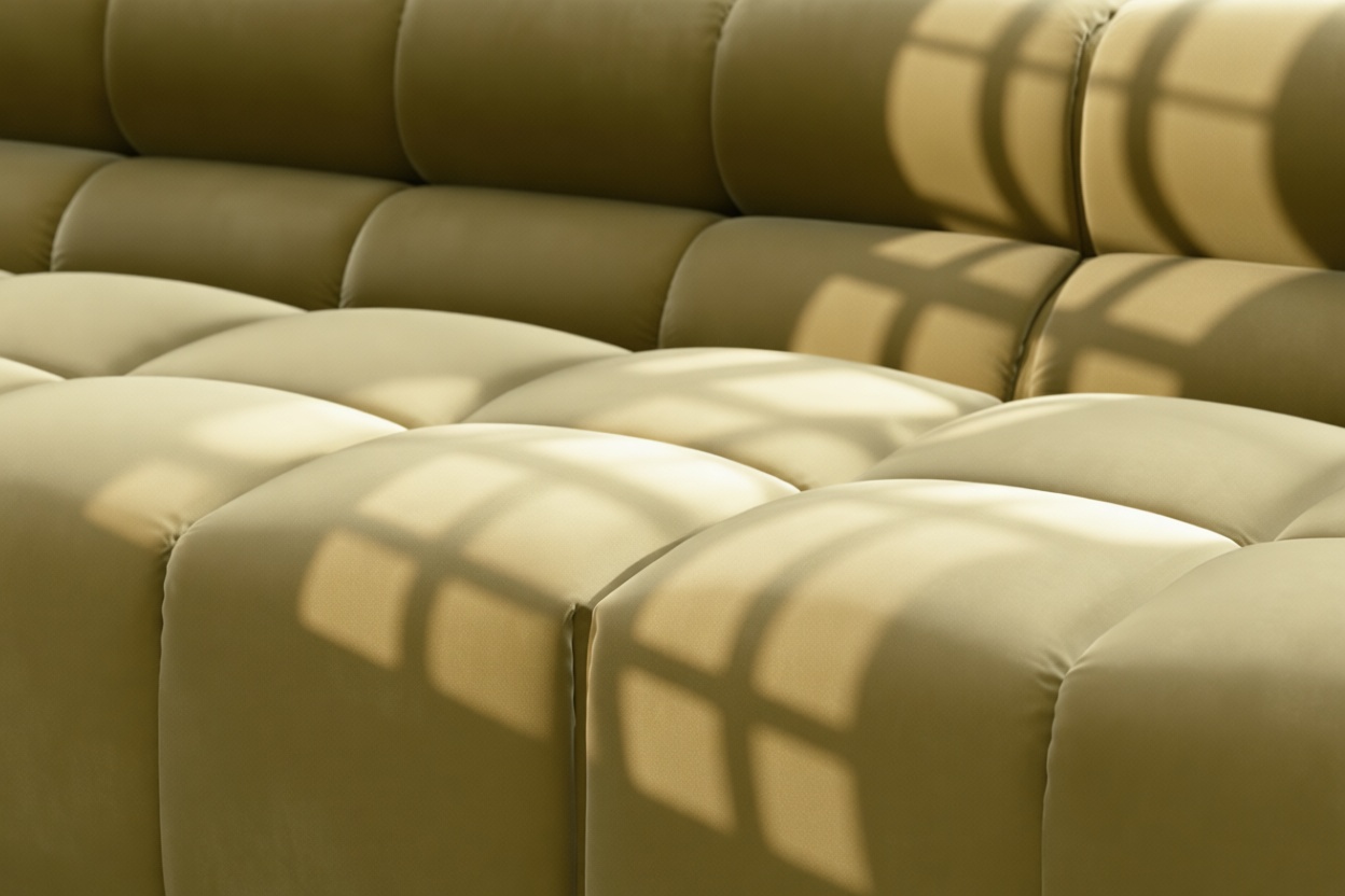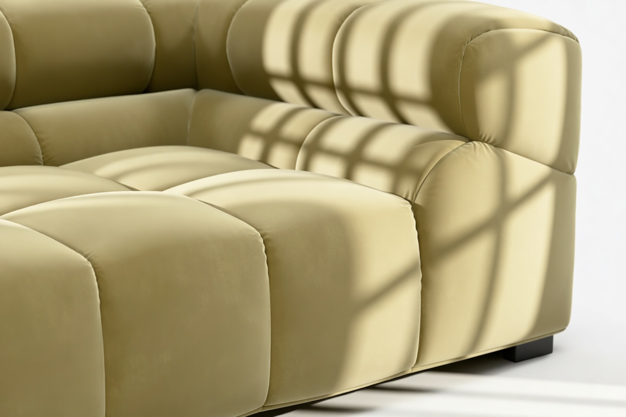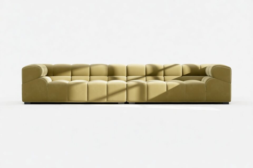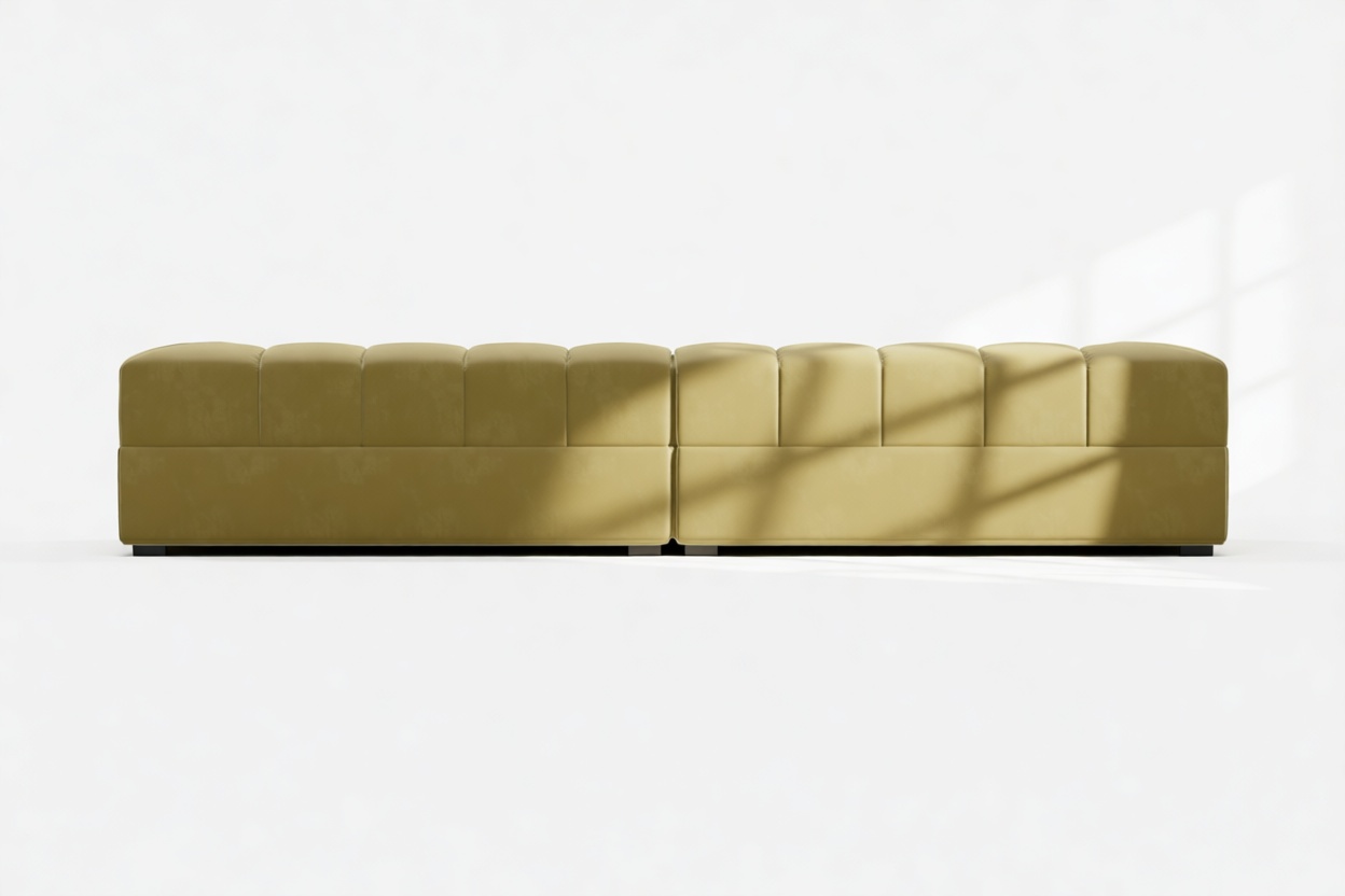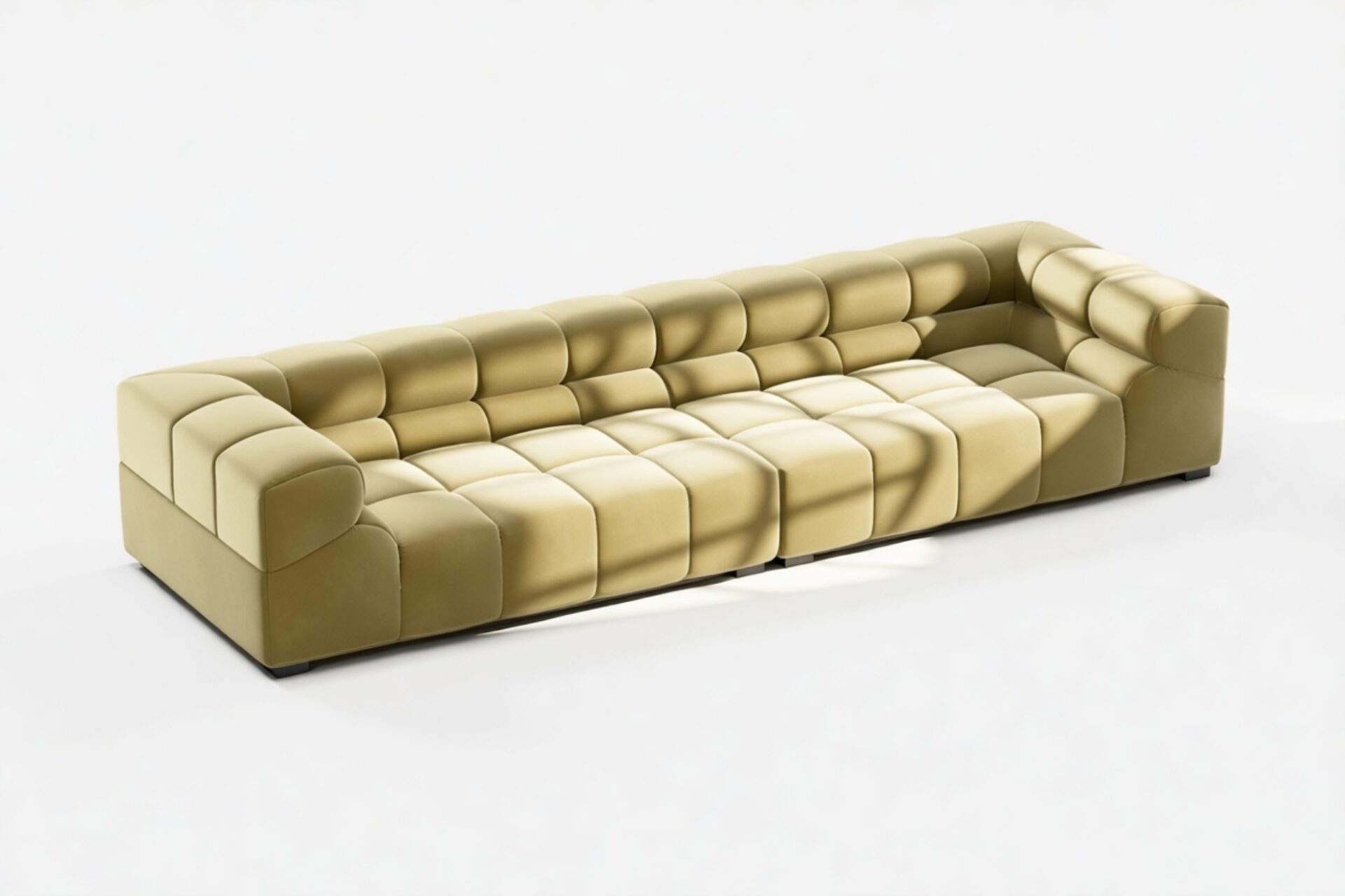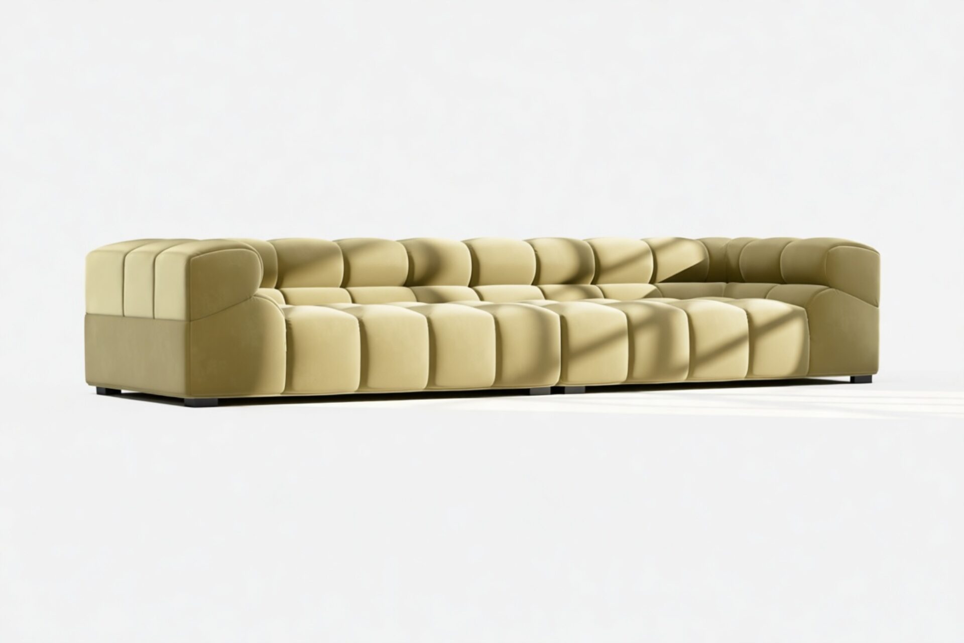 Introducing the Tufty sectional, a refreshing reinterpretation of the classic Chesterfield style infused with 70s flair in Olive Gold Velvet. This chic masterpiece blends casual elegance with playful aesthetics, featuring subtle curves and modular design for versatility in any setting. Embrace ultimate comfort with its spacious dimensions and cozy bench-style foundation, perfect for modern or vintage interiors.