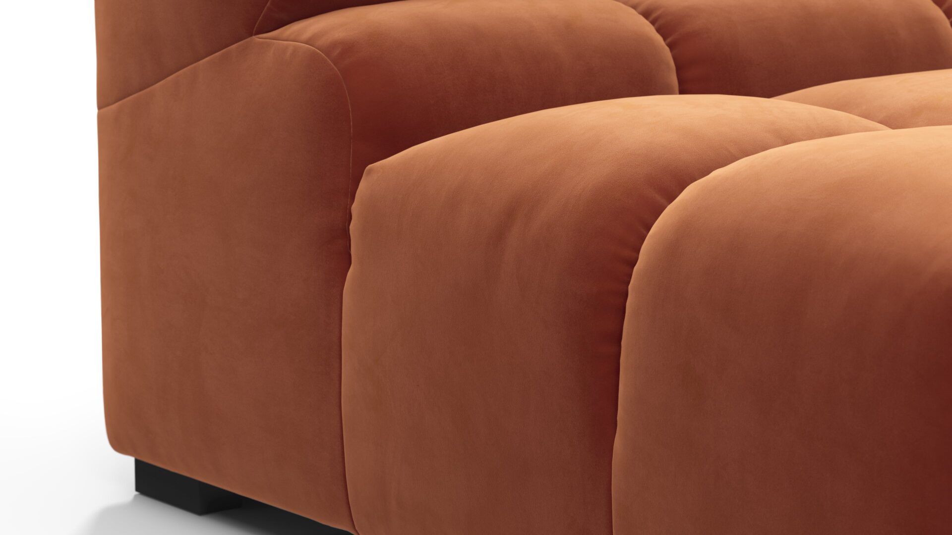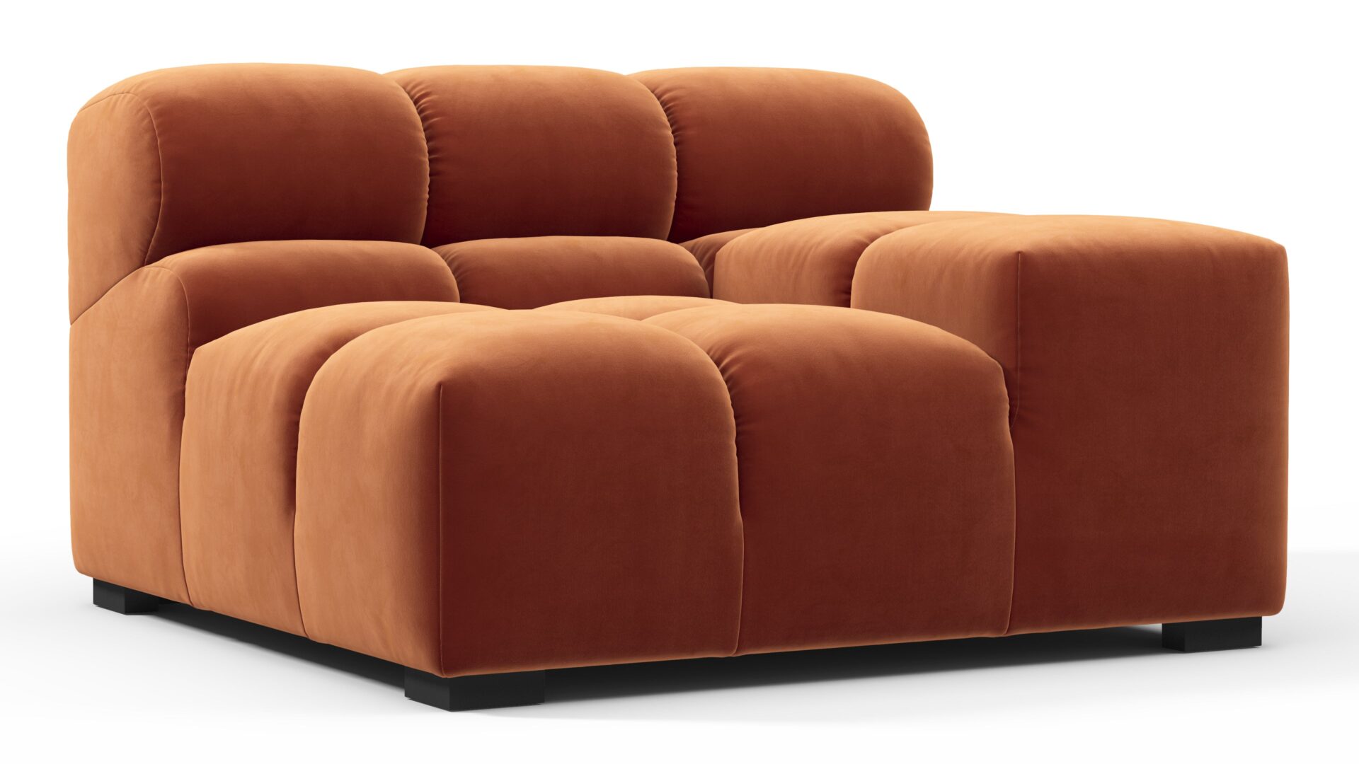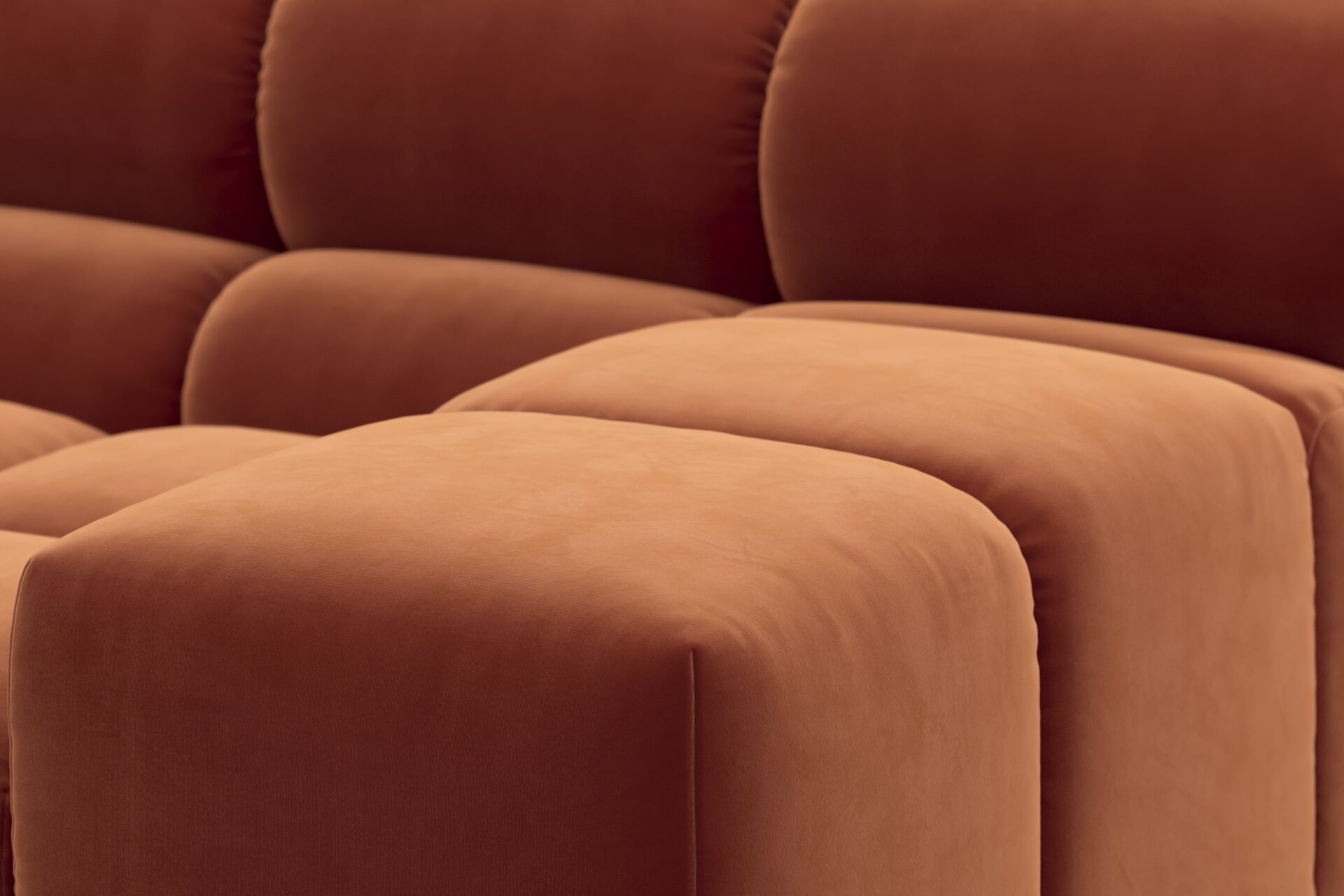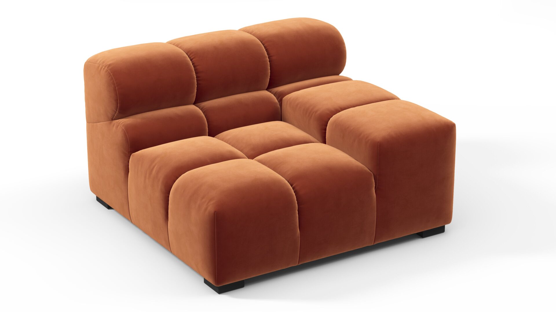Introducing the fresh and stylish Tufty sectional, a modern interpretation of a classic Chesterfield capitonné with a 70s vibe. Featuring a chic Spice Velvet option, this versatile piece boasts subtle curves and a playful aesthetic, perfect for both modern city lofts and spacious entertainment areas. Enjoy ultimate comfort with its relaxed and laid-back design, providing ample space to unwind and relax.
