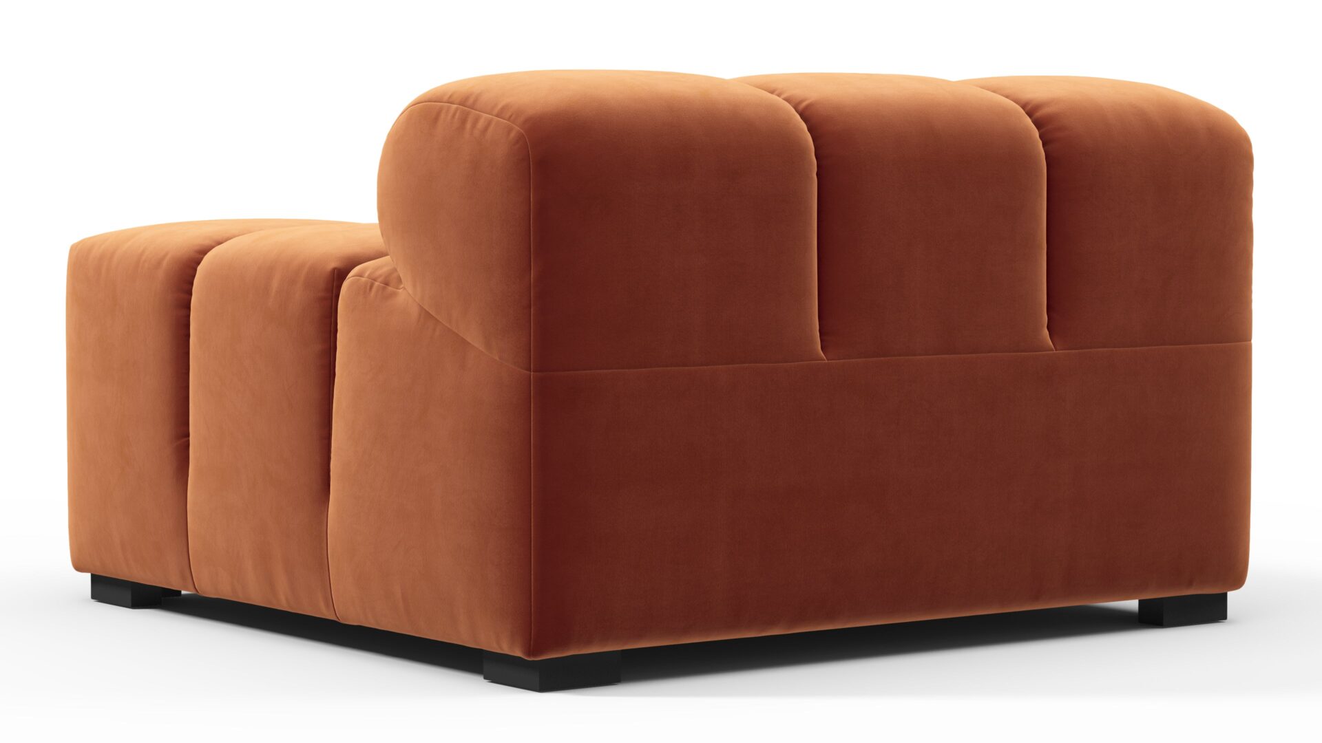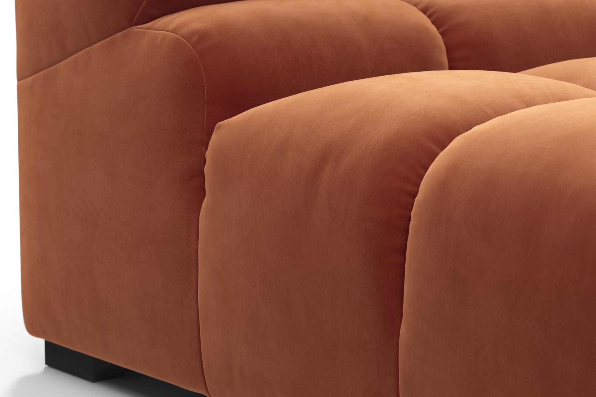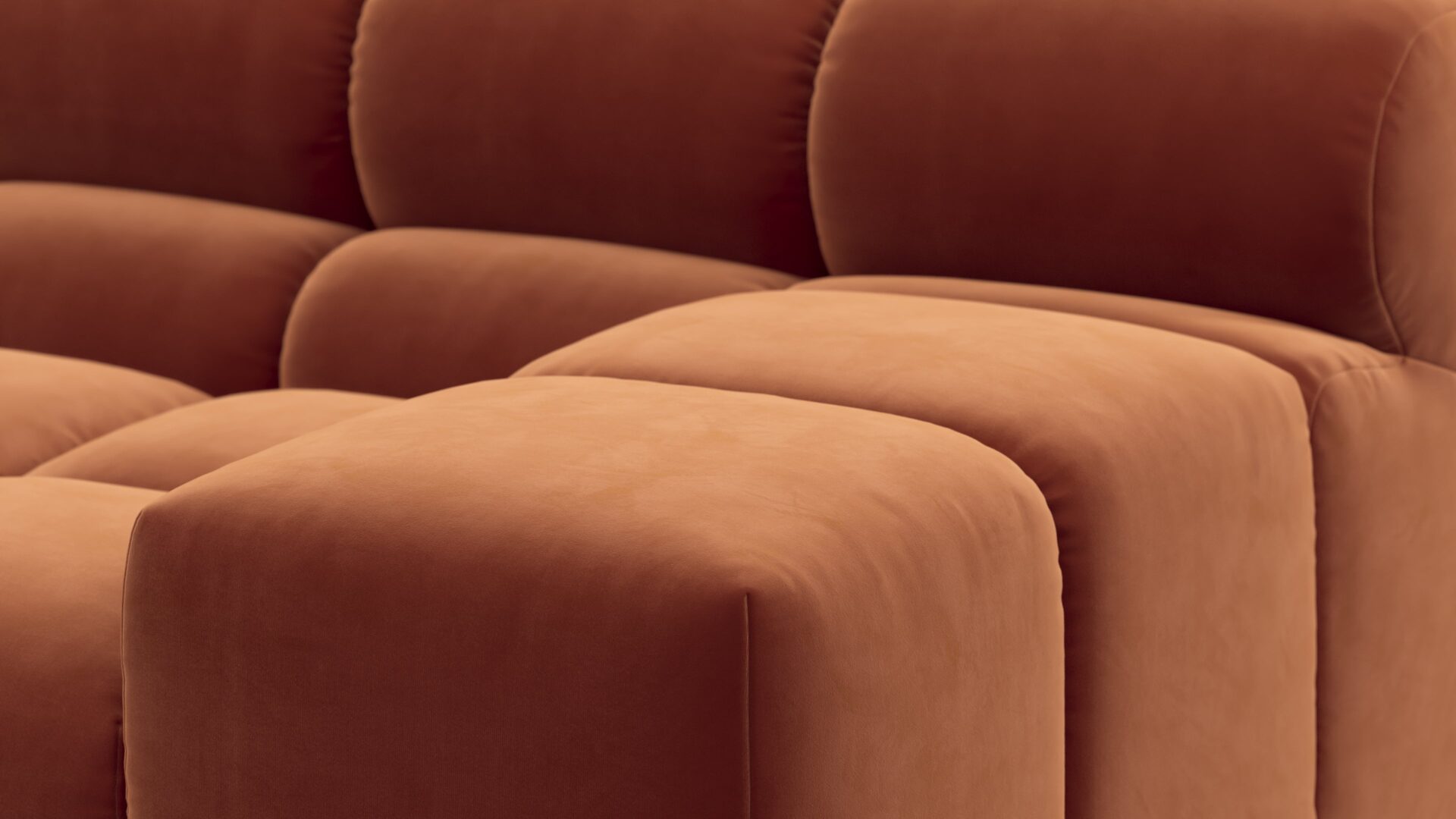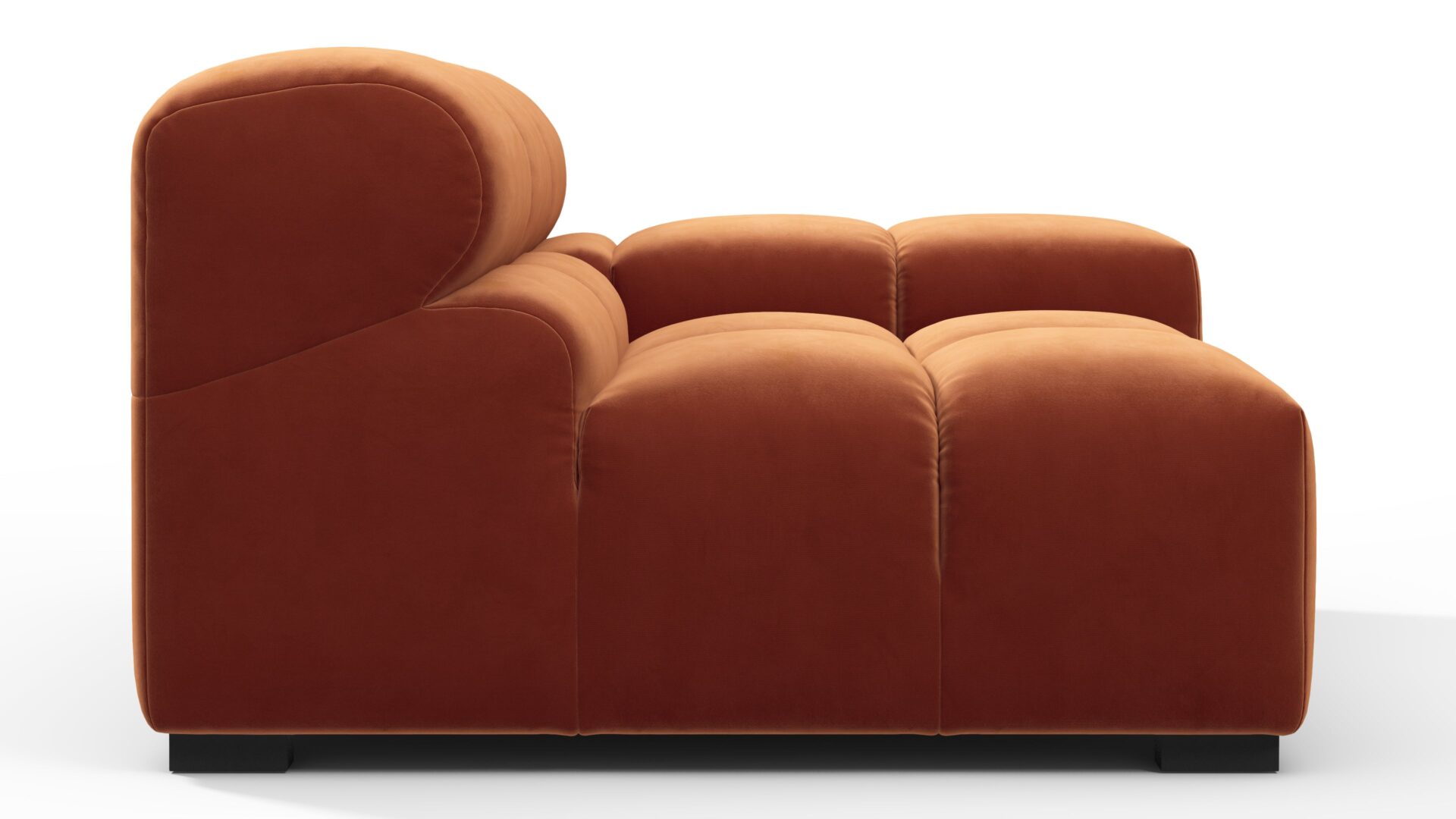 Introducing the fresh and stylish Tufty sectional, a modern interpretation of a classic Chesterfield capitonné with a 70s vibe. Featuring a chic Spice Velvet option, this versatile piece boasts subtle curves and a playful aesthetic, perfect for both modern city lofts and spacious entertainment areas. Enjoy ultimate comfort with its relaxed and laid-back design, providing ample space to unwind and relax.