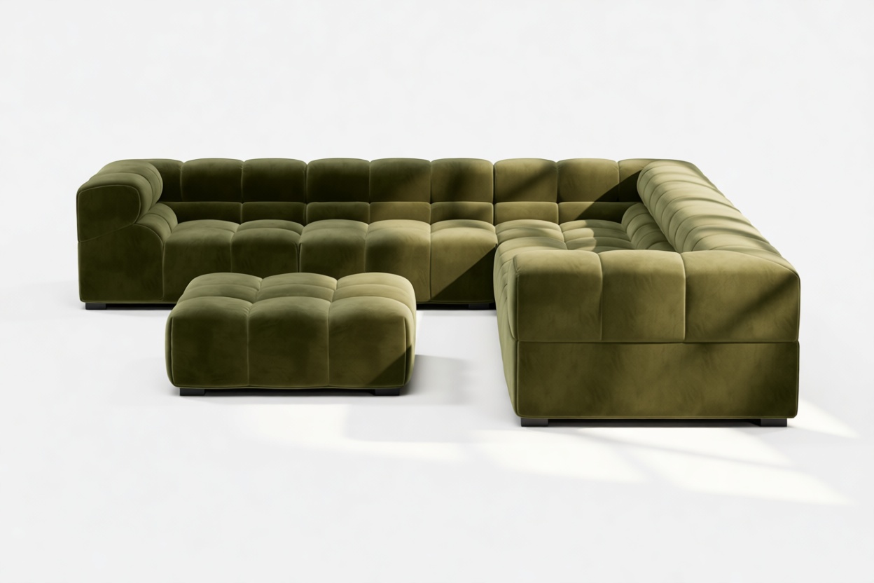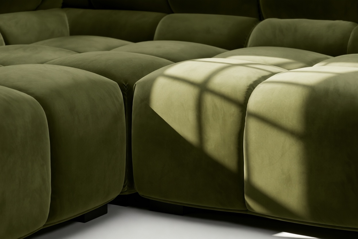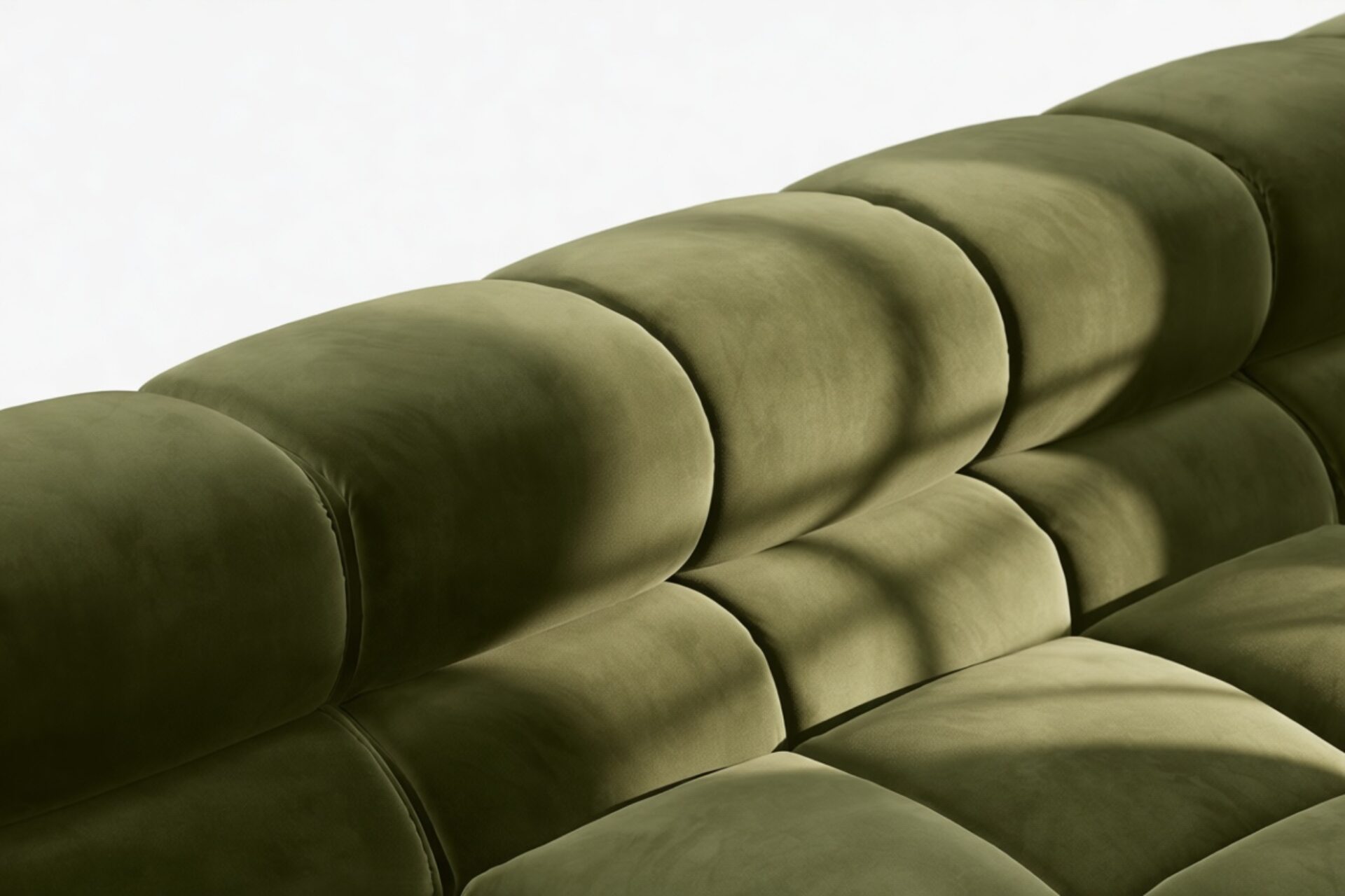 Introducing the Tufty sectional - a stylish reinterpretation of traditional Chesterfield design with a 70s flair, now available in Thyme Luxe Velvet. Its versatile and modular layout effortlessly blends modern charm with a playful aesthetic, making it a perfect fit for any setting, from cozy lofts to expansive entertainment spaces. The Tufty, with its subtle curves and ample dimensions, exudes casual elegance while ensuring ultimate comfort and a welcoming vibe in both modern and vintage interiors.