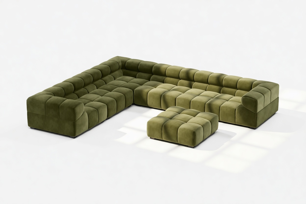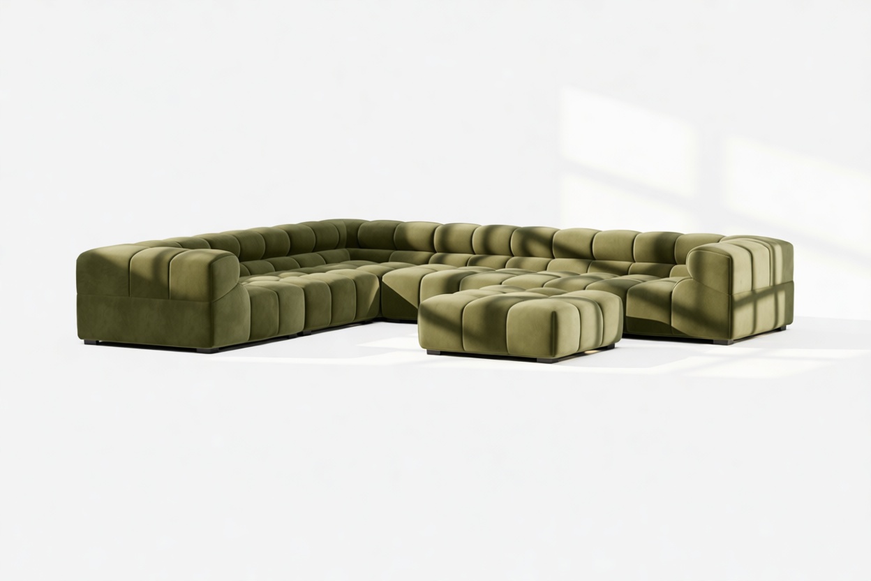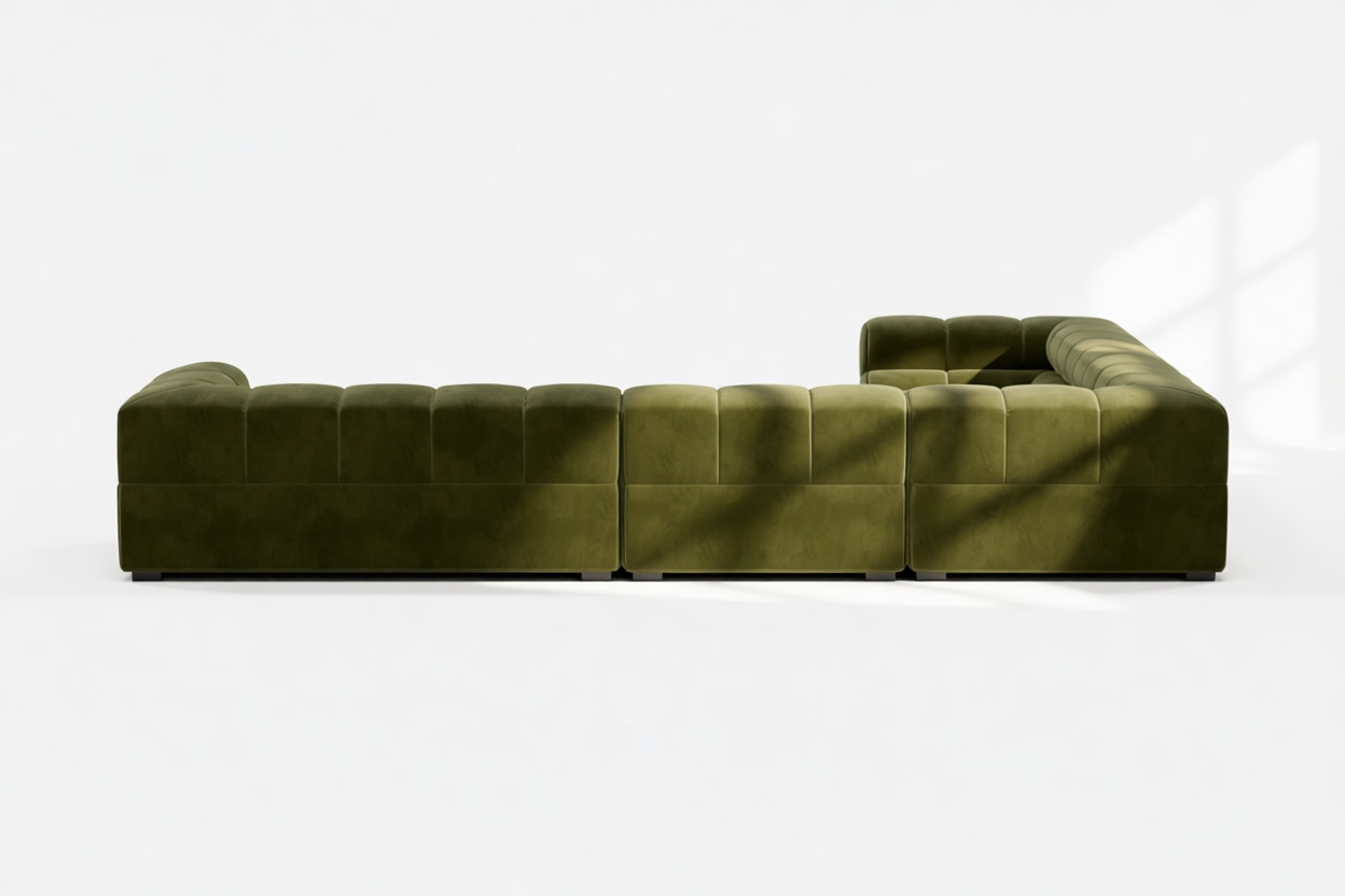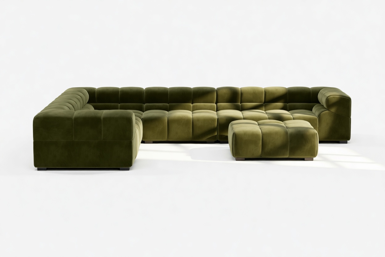 Introducing the Tufty sectional - a stylish reinterpretation of traditional Chesterfield design with a 70s flair, now available in Thyme Luxe Velvet. Its versatile and modular layout effortlessly blends modern charm with a playful aesthetic, making it a perfect fit for any setting, from cozy lofts to expansive entertainment spaces. The Tufty, with its subtle curves and ample dimensions, exudes casual elegance while ensuring ultimate comfort and a welcoming vibe in both modern and vintage interiors.