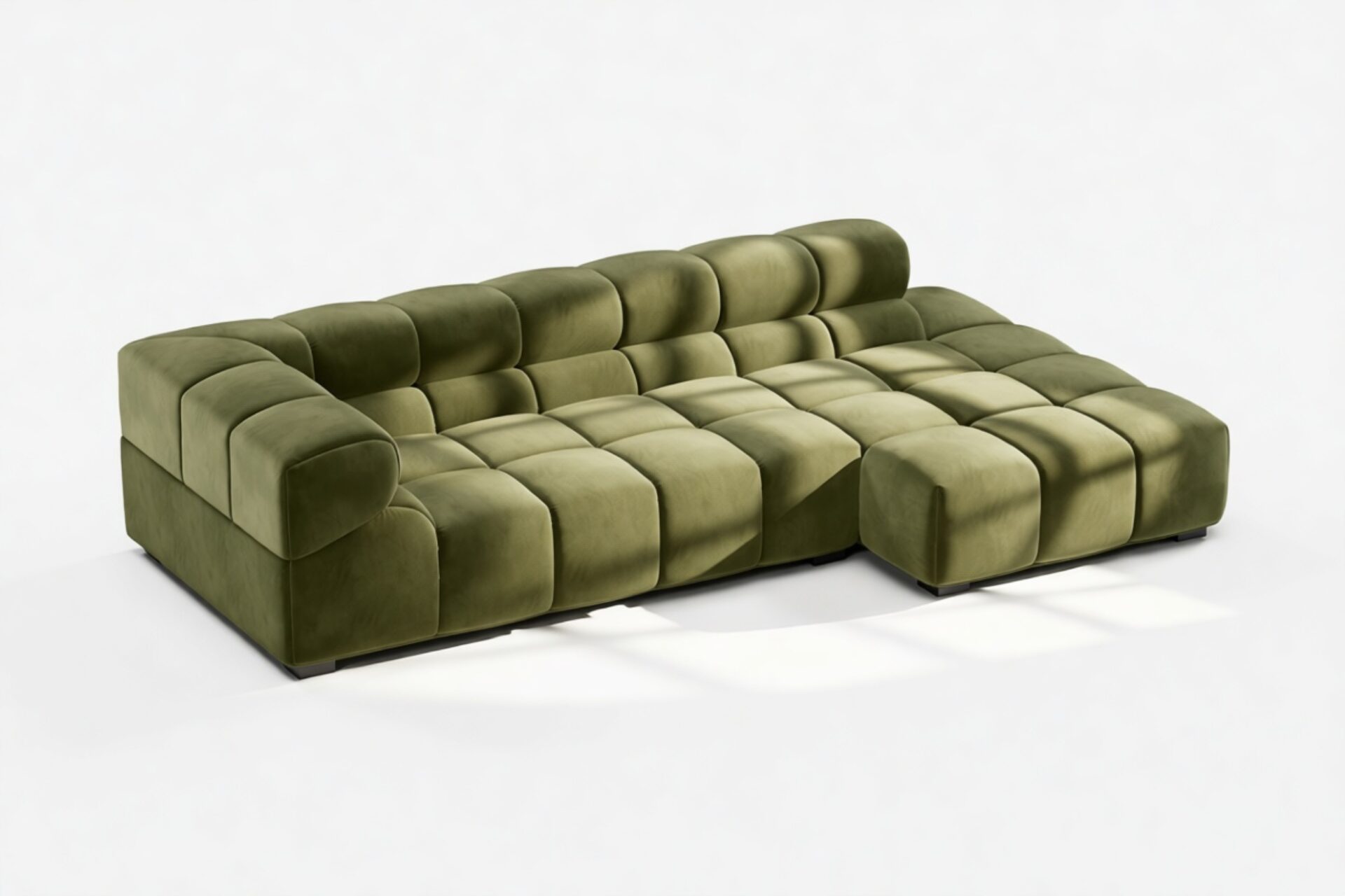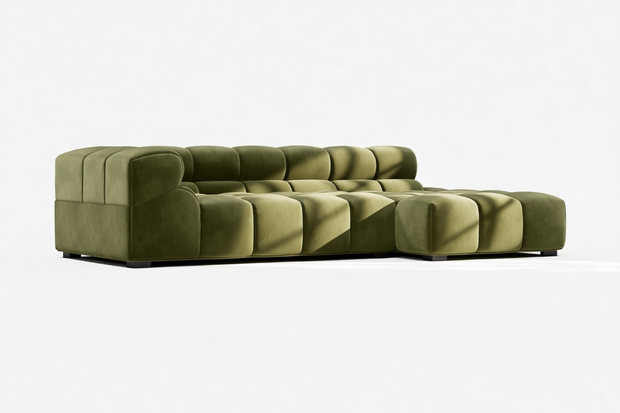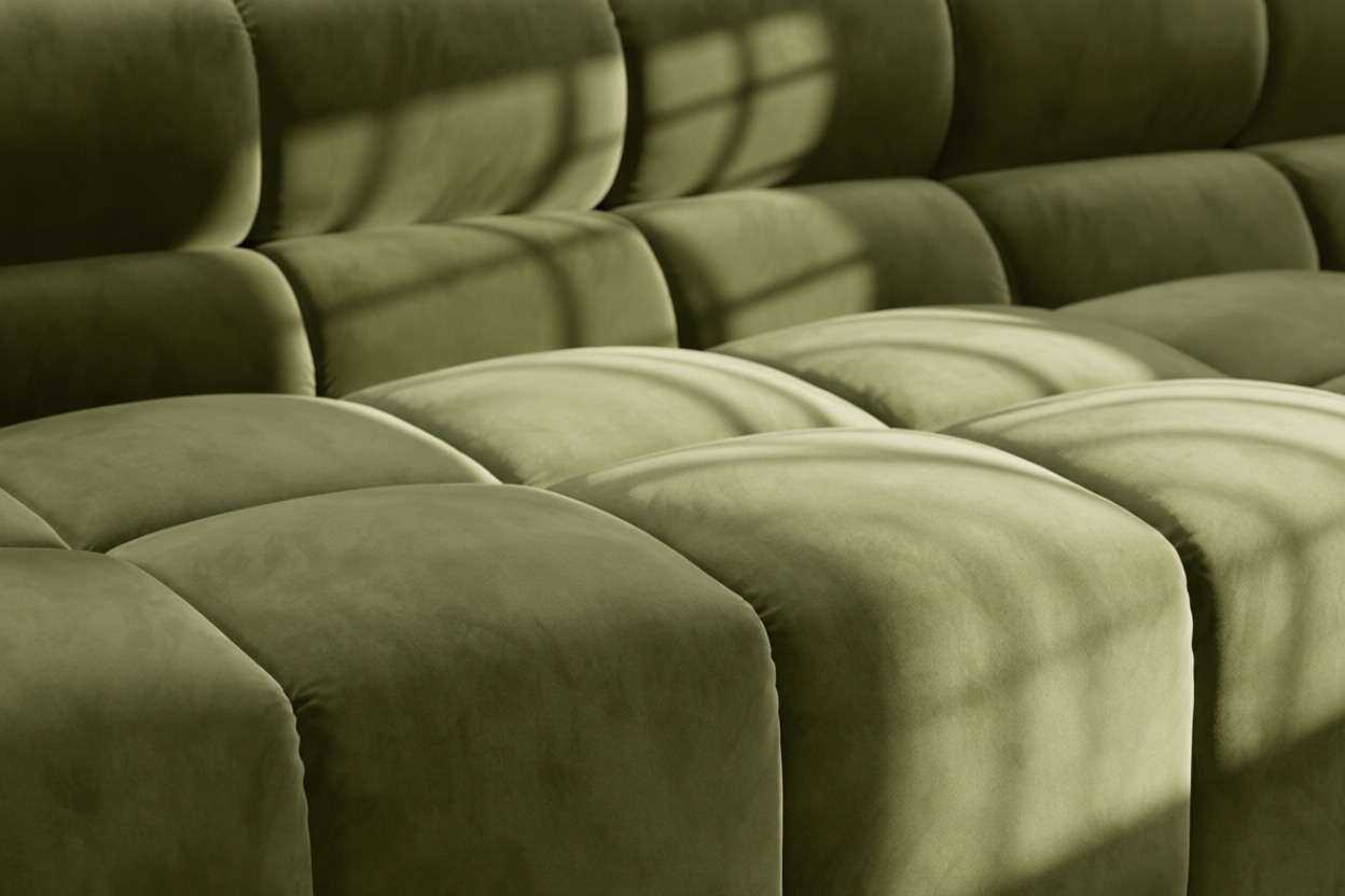 Introducing the Tufty sectional, a modern twist on the classic Chesterfield capitonné design with a 70s flair, now available in Thyme Luxe Velvet. With its captivating and playful aesthetic, this piece seamlessly blends casual elegance with ultimate comfort. Its modular structure allows for versatile placement in any setting, making it a standout addition to modern or vintage interiors, providing ample space for relaxation and cozy vibes.