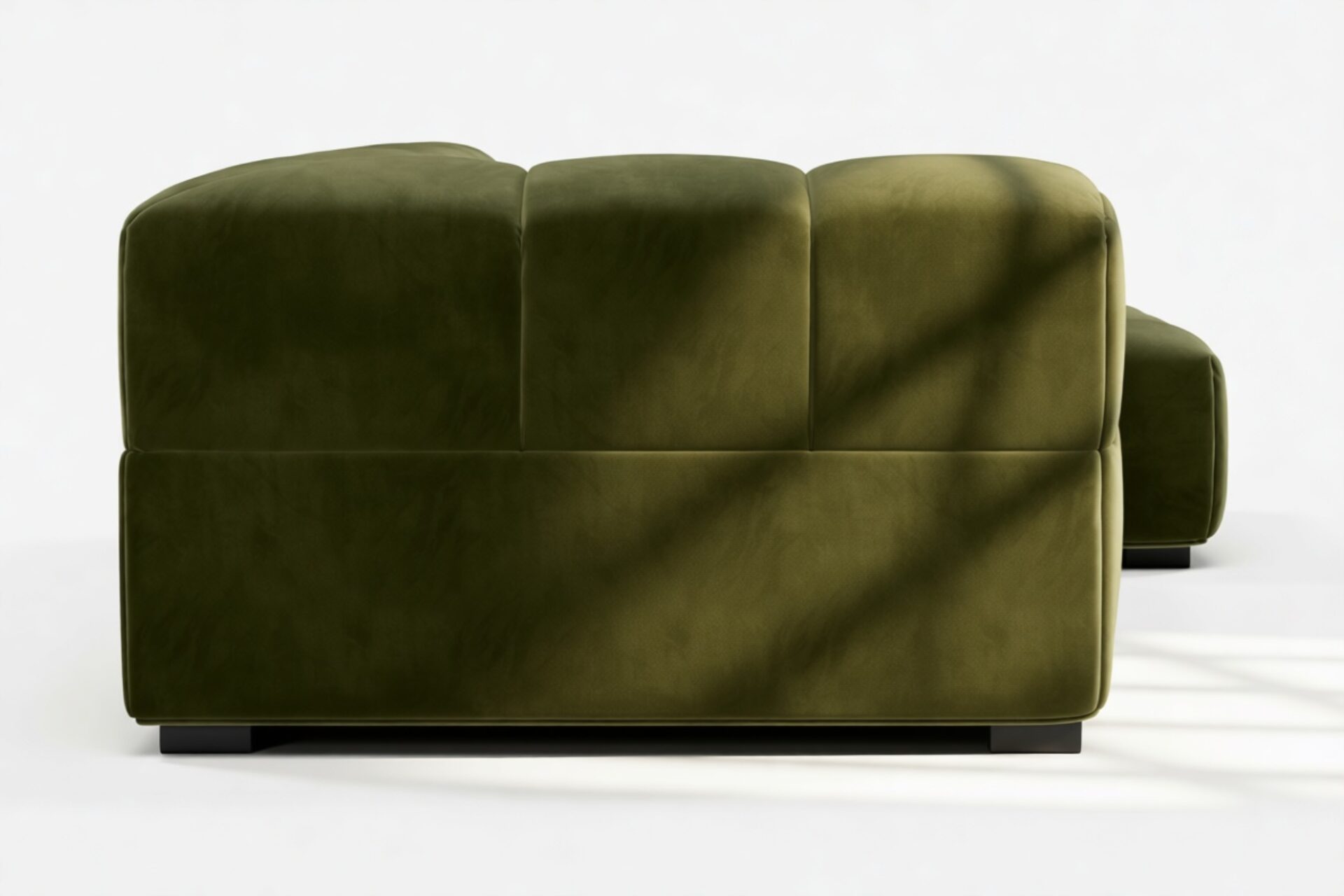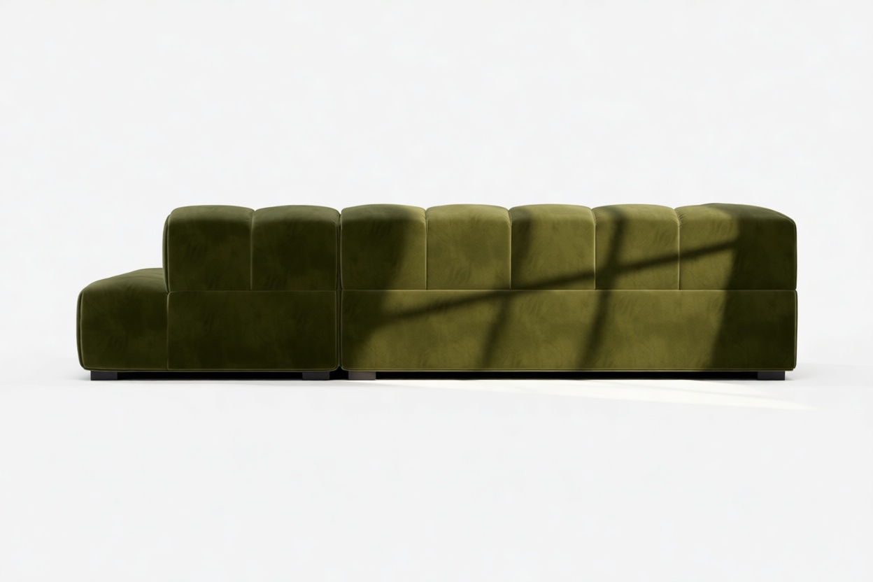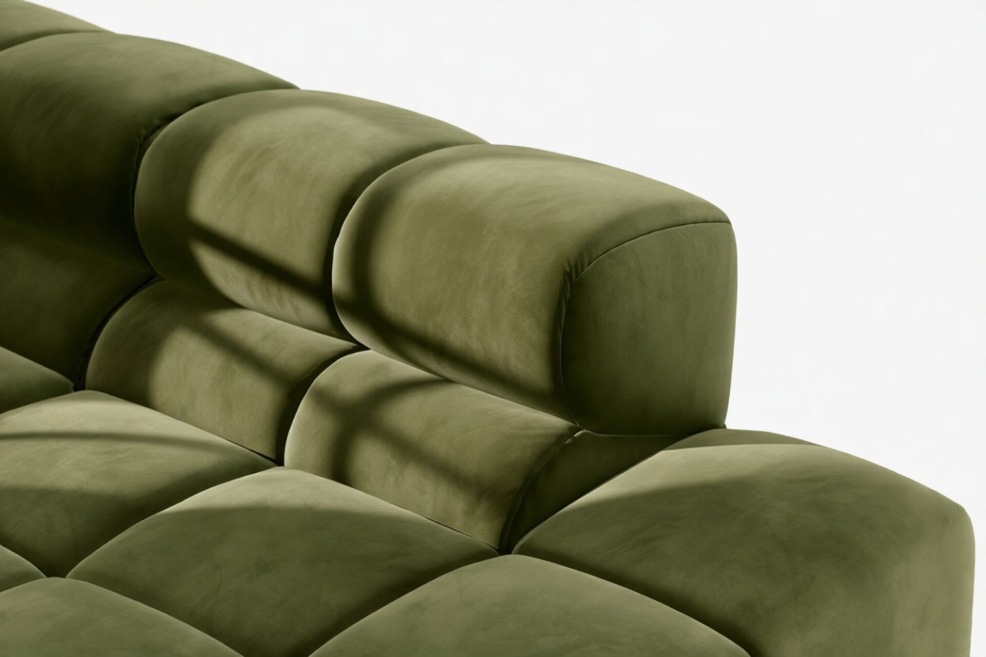 Introducing the Tufty sectional, a modern twist on the classic Chesterfield capitonné design with a 70s flair, now available in Thyme Luxe Velvet. With its captivating and playful aesthetic, this piece seamlessly blends casual elegance with ultimate comfort. Its modular structure allows for versatile placement in any setting, making it a standout addition to modern or vintage interiors, providing ample space for relaxation and cozy vibes.