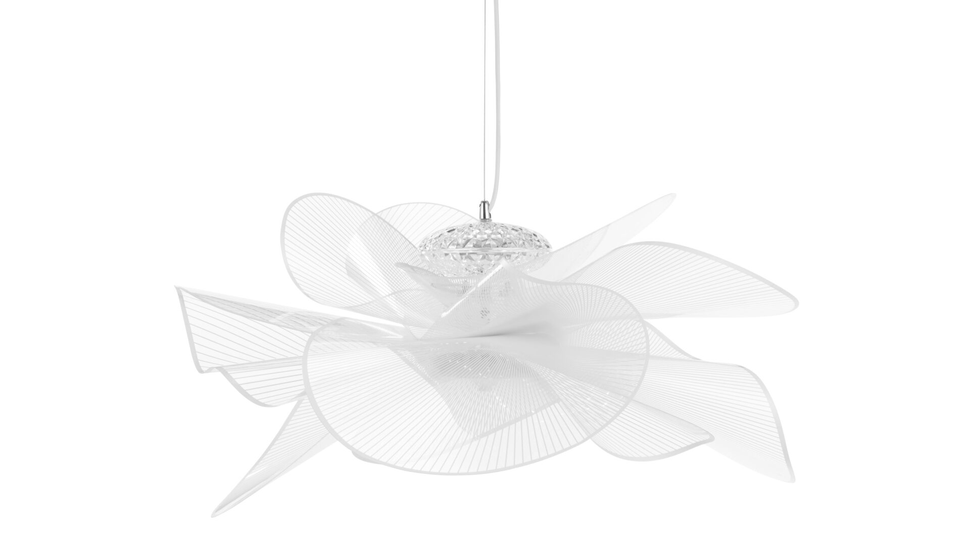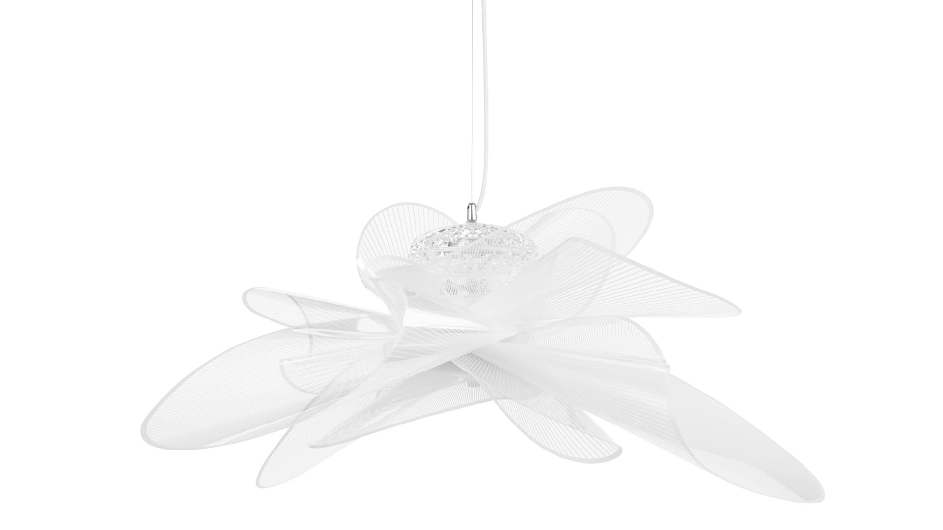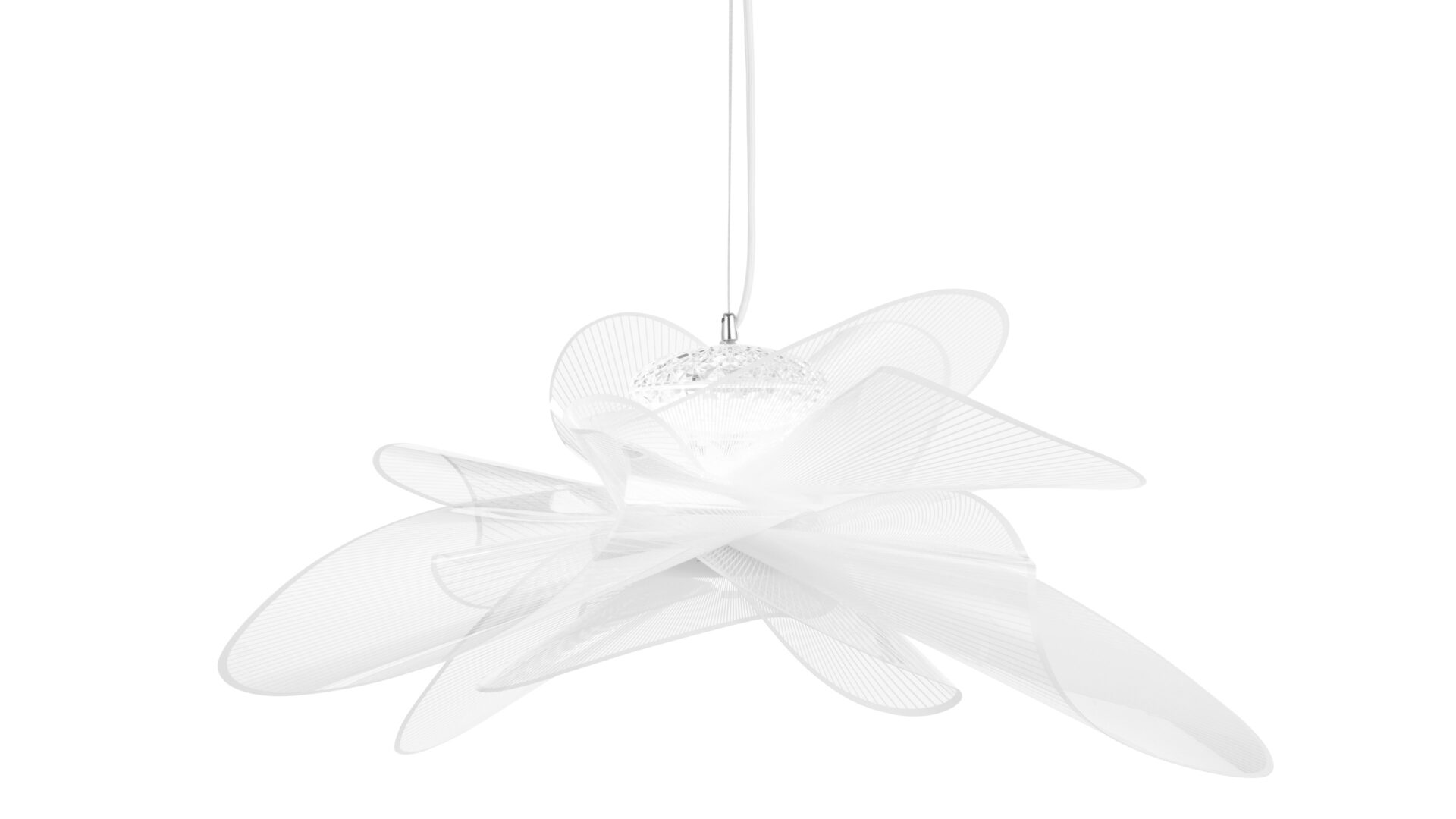 Experience the contemporary elegance of the Tulle Ceiling Lamp, a stunning fixture composed of wide, curved acrylic pieces that evoke the movement of undulating waves. Illuminated by an internal LED system encased in a crystal-like compartment, this lamp emits a soft, warm white glow that elevates the atmosphere of any space. Drawing inspiration from the texture and light diffusion qualities of tulle fabric, and suspended by a slender cord, this lamp boasts a remarkably lightweight presence.