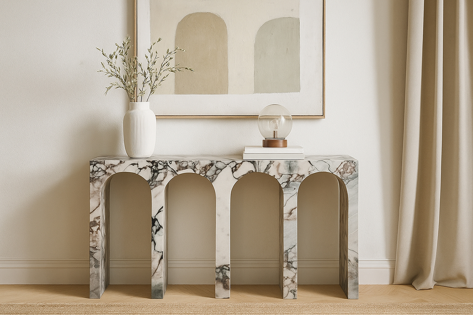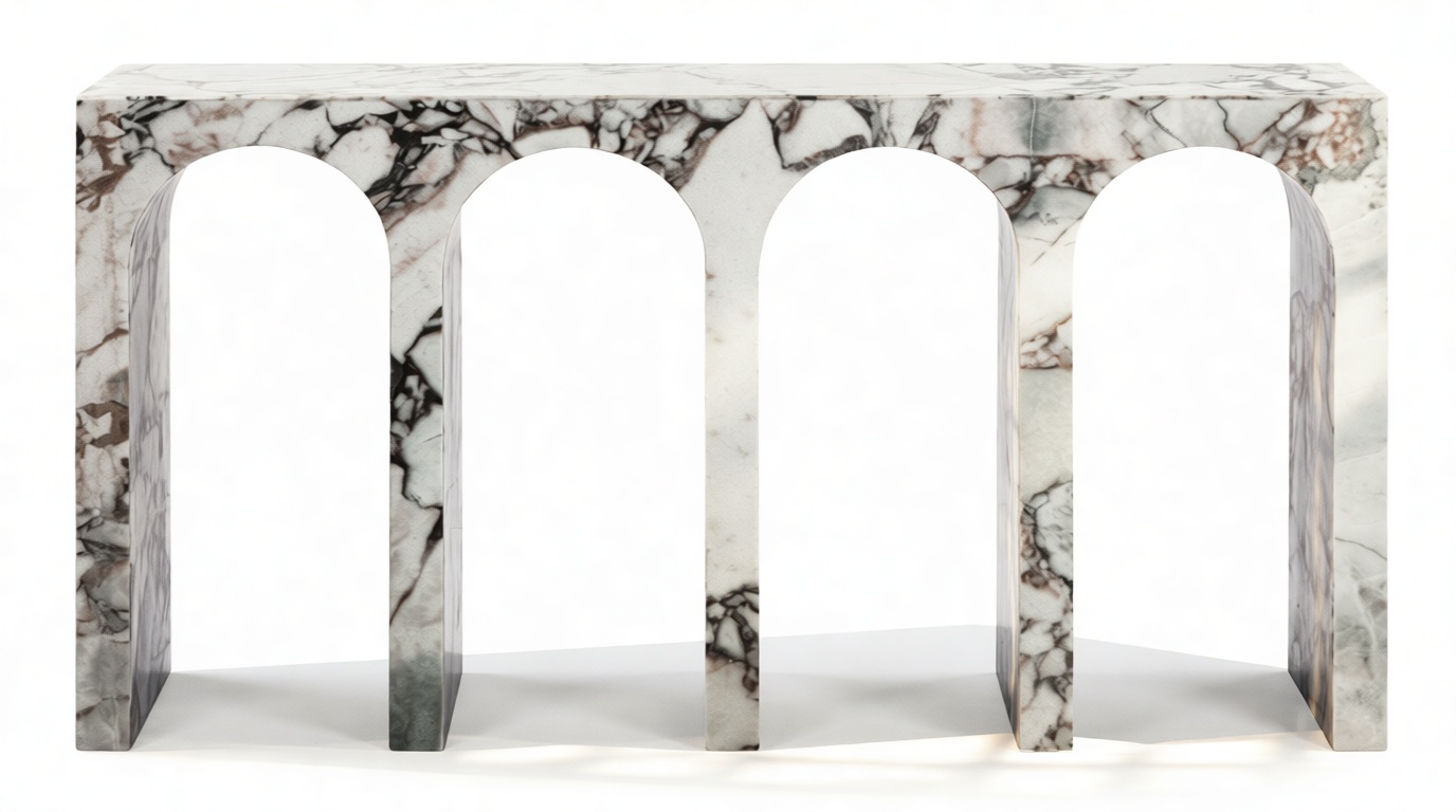 The Venezia Console Table transcends being just a piece of furniture; it is an exquisite creation that captures the grandeur of ancient Roman architecture. Its enduring design, featuring opulent marble and graceful arches, renders it a beloved addition to any living space. The Venezia Console Table not only fulfills a practical function but also serves as a tribute to classical beauty and enduring artistry, seamlessly blending the bygone era with modern allure. The Venezia Console Table is meticulously crafted from genuine Modellato marble, renowned for its unique veining and lustrous sheen. The innate beauty and durability of marble make it a perfect selection for a focal piece that guarantees both longevity and sophistication. The sleek, velvety surface offers an elegant stage for showcasing cherished objects, from elaborate vases to priceless photographs.