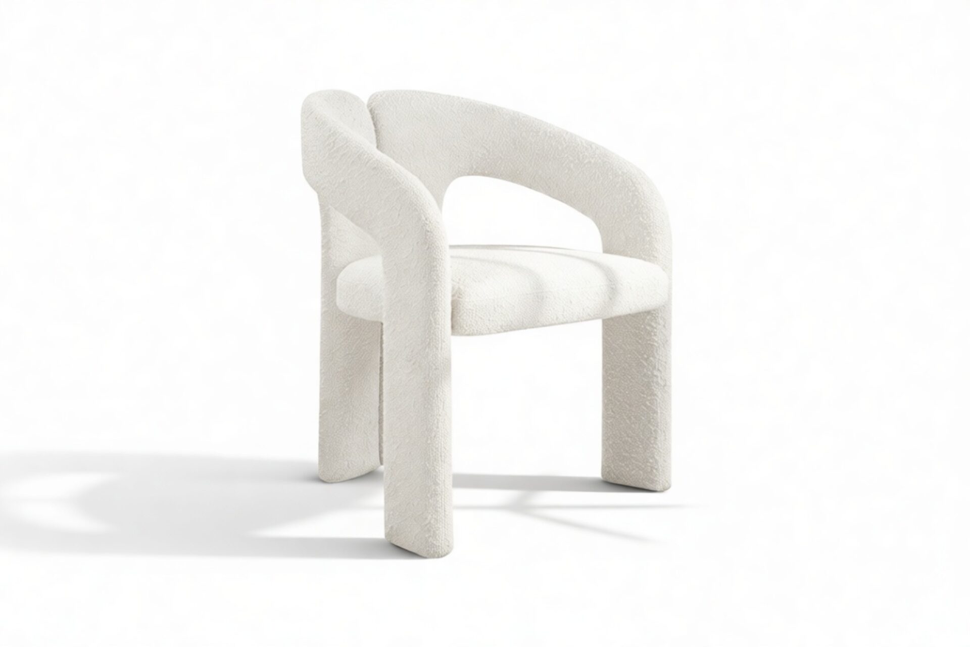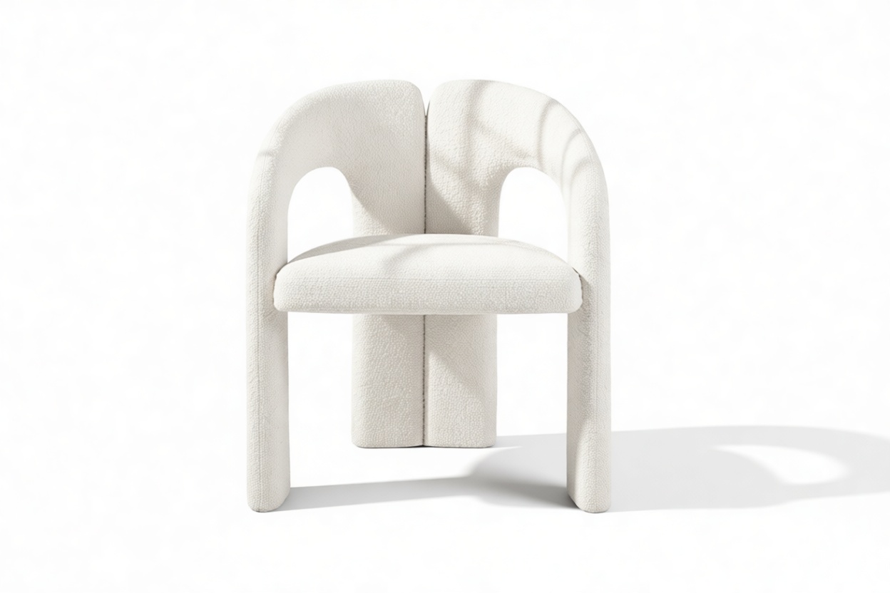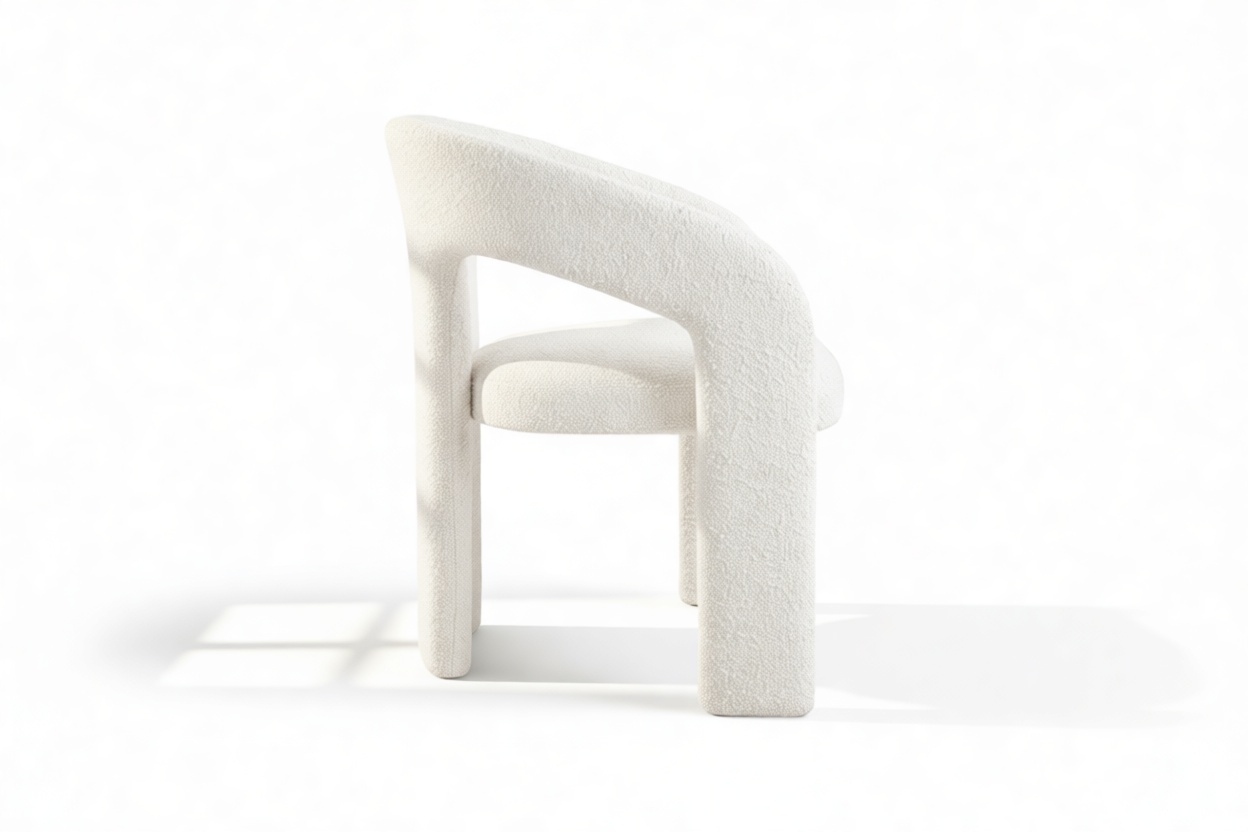 Discover the Vesper Chair, a stunning blend of modern aesthetics and comfort. Its sculpted frame and fashionable white bouclé fabric make it a symbol of contemporary luxury. Embrace its avant-garde design, with armrests adding both style and functionality. Elevate your dining experience with this chic and sturdy centerpiece that exudes elegance and coziness.