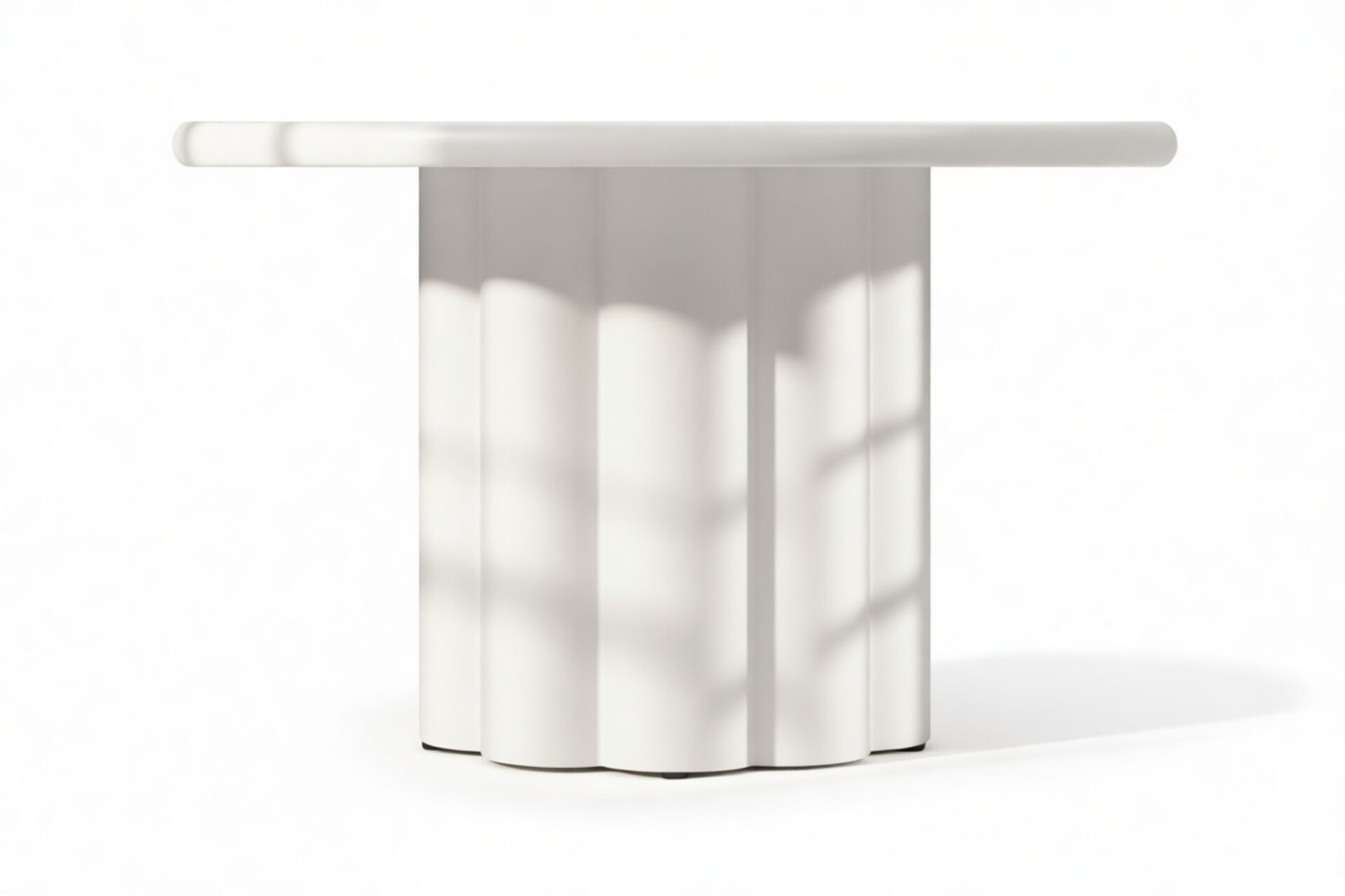 The Vestida Coffee Table, drawing inspiration from Art Deco aesthetics and distinguished by its reeded base, functions as a whimsical yet practical enhancement to any living area. With its rounded top offering convenient surface area for daily essentials, and its eye-catching base and understated hues, it seamlessly enhances the surrounding decor.