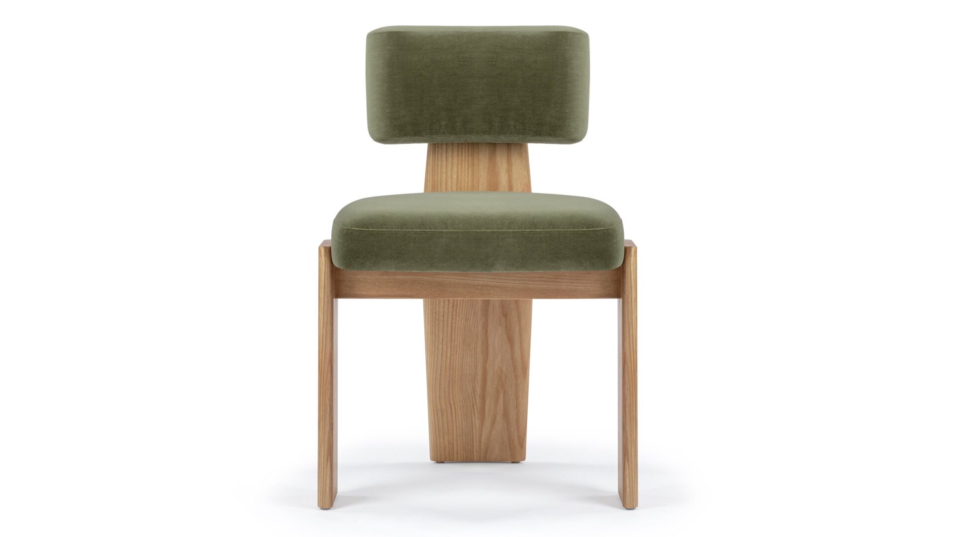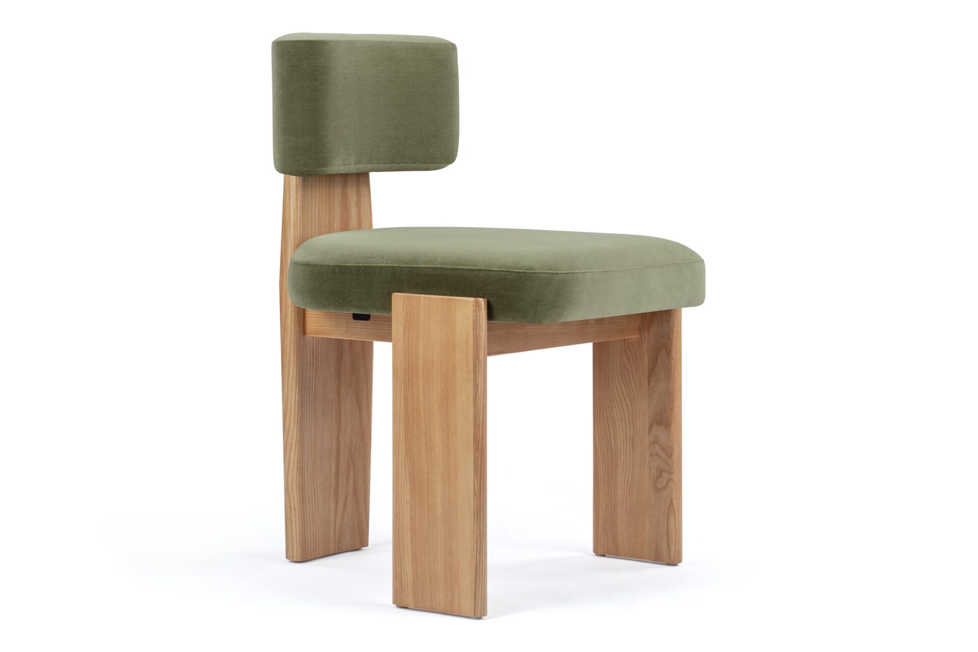 Enhance your contemporary dining space with the Vieve Side Chair, a stunning blend of organic elegance and bold modern design. Upholstered in lavish sage green velvet, this chair offers a luxurious feel and a serene aesthetic. The solid ash wood frame showcases its natural grain, creating a striking contrast with the plush velvet seat. Featuring thick geometric block-style legs for a sculptural touch, and a minimalist upholstered backrest for comfort without sacrificing style.