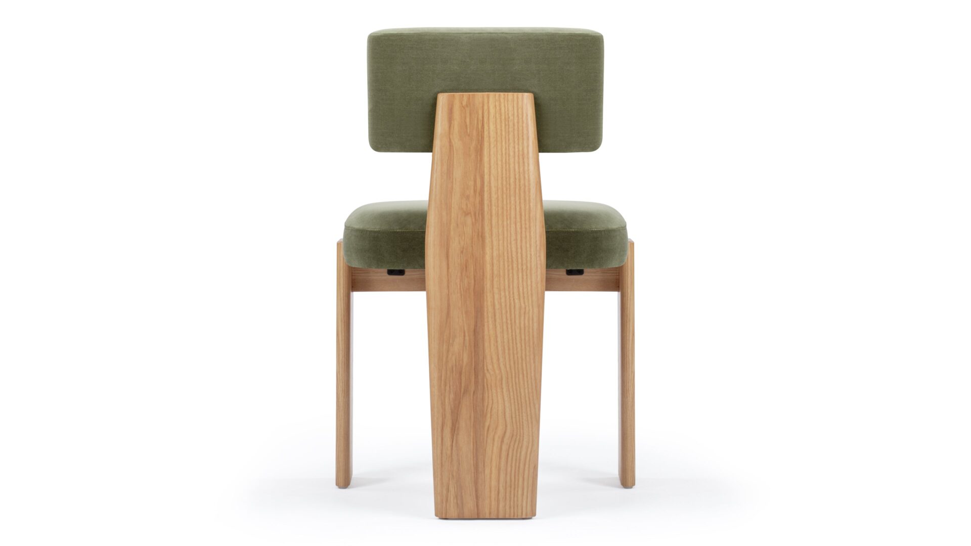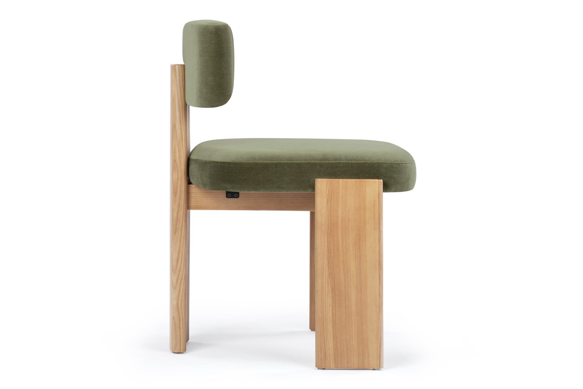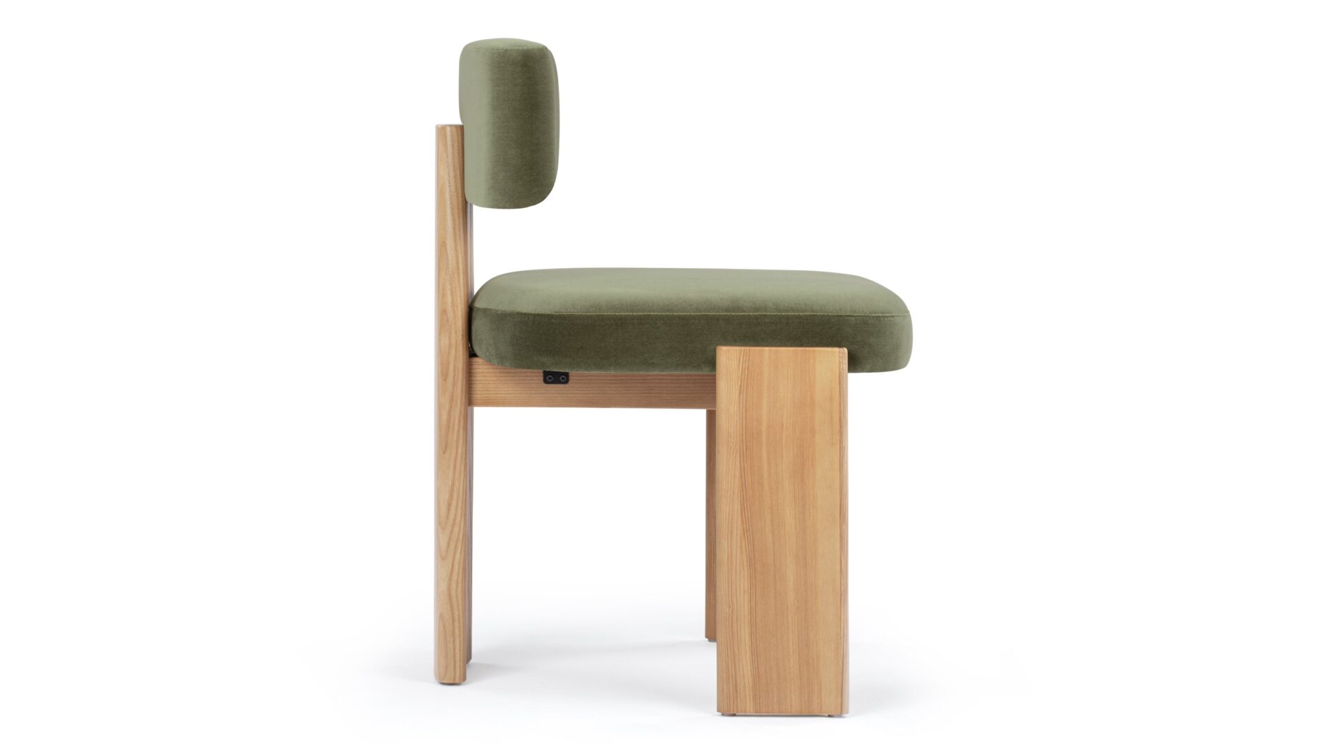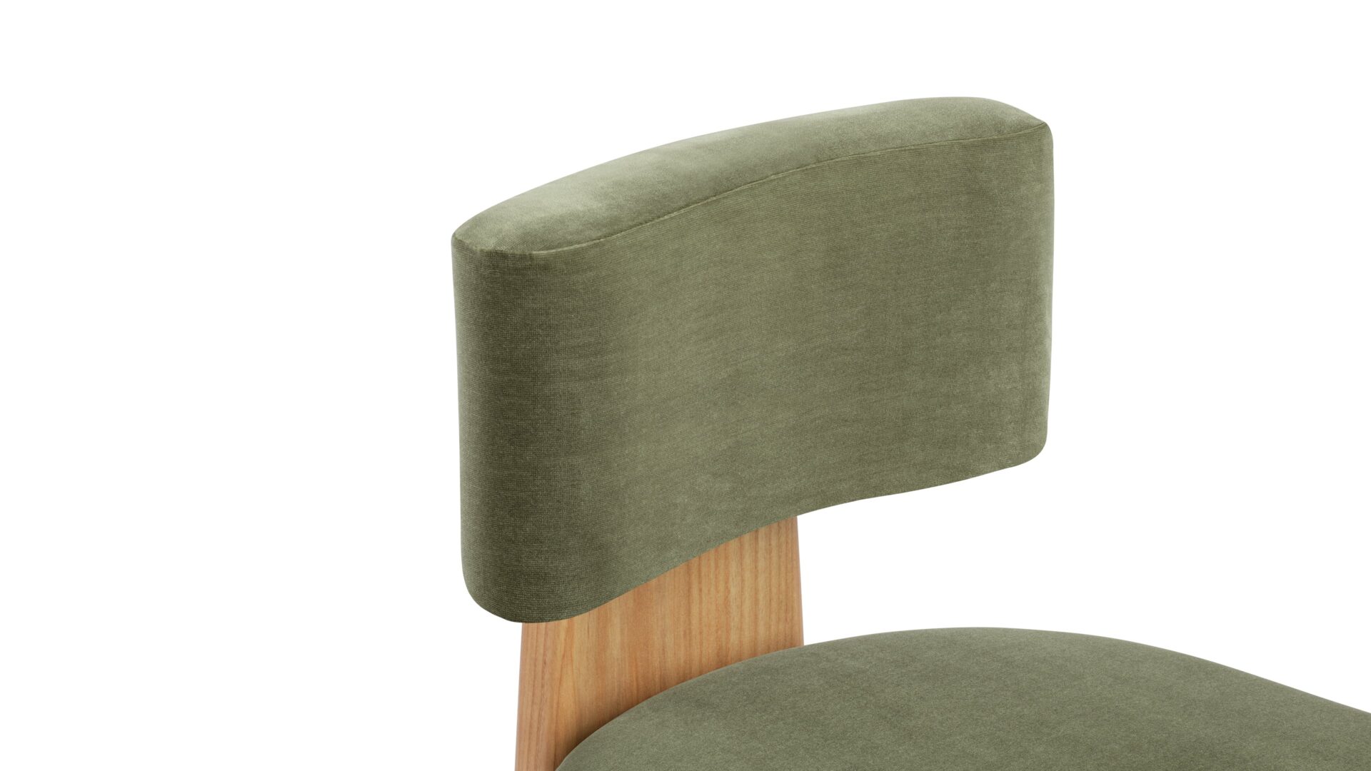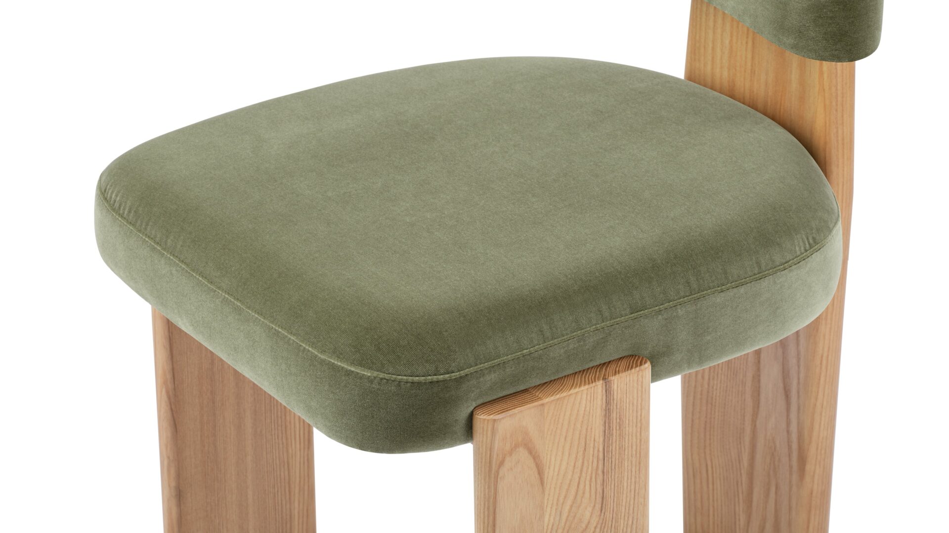Experience the luxurious feel of soft velvet upholstery in a muted sage green blending harmoniously with the warm, solid ash wood showcasing its natural grain. This unique combination offers a balanced aesthetic of texture and strength.