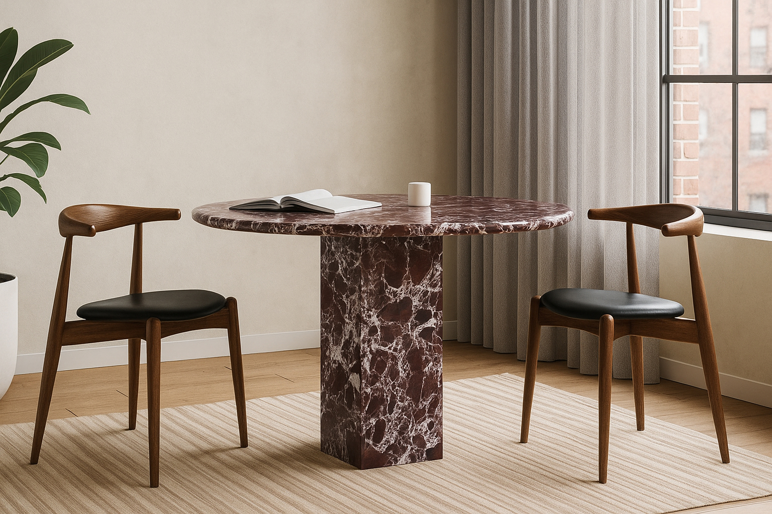 Experience the blending of Roman architecture and modern flair with the Viola dining table. This exquisite piece features a sleek Italian Rosso Levanto marble top set upon an angular plinth base, offering a minimalist design with captivating visual impact. Its honed finish not only exudes elegance but also provides a functional surface for dining, working, and socializing. Each table's unique textural quality and color variations highlight the natural beauty of Rosso Levanto Marble, making it an ideal centerpiece for any dining space.