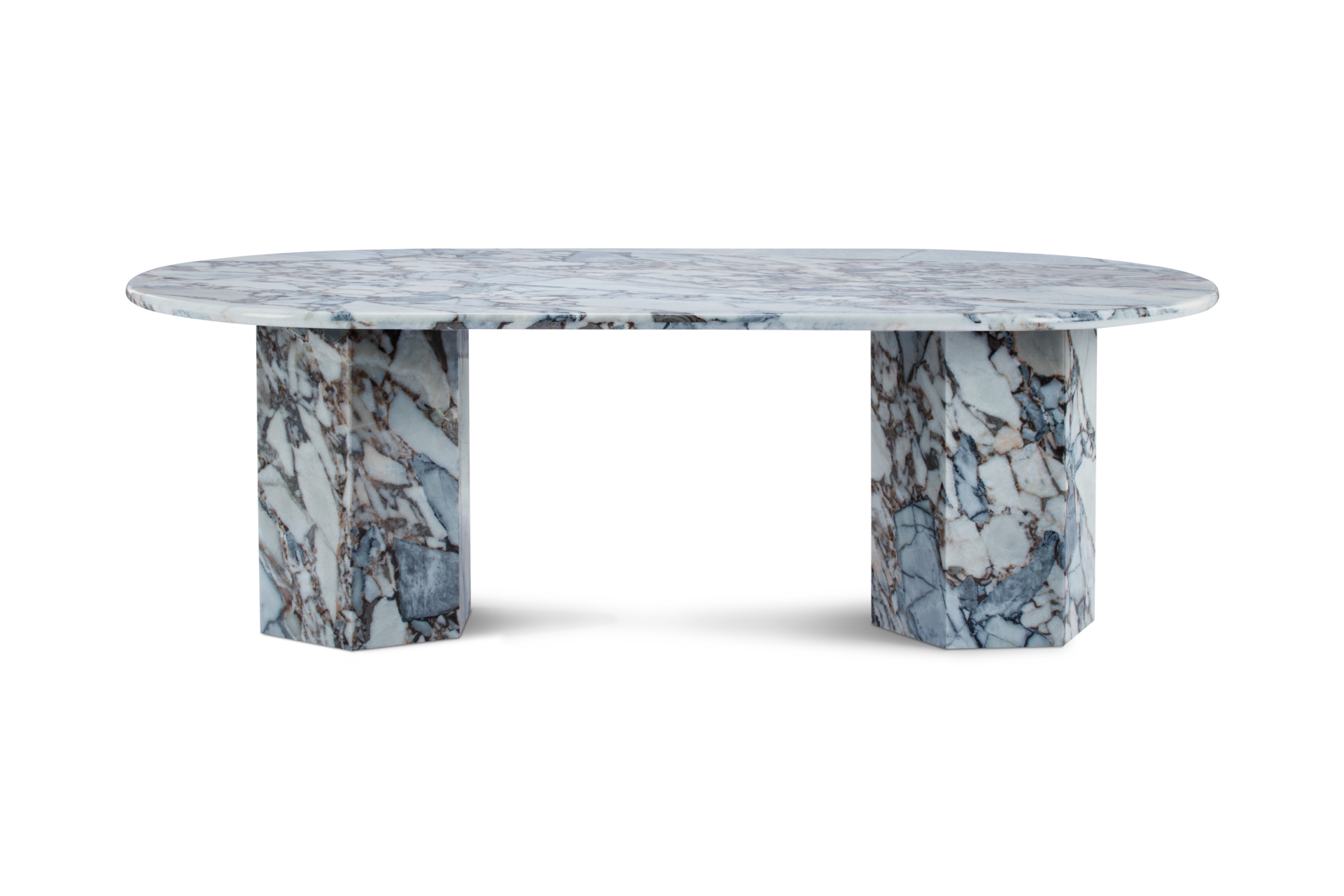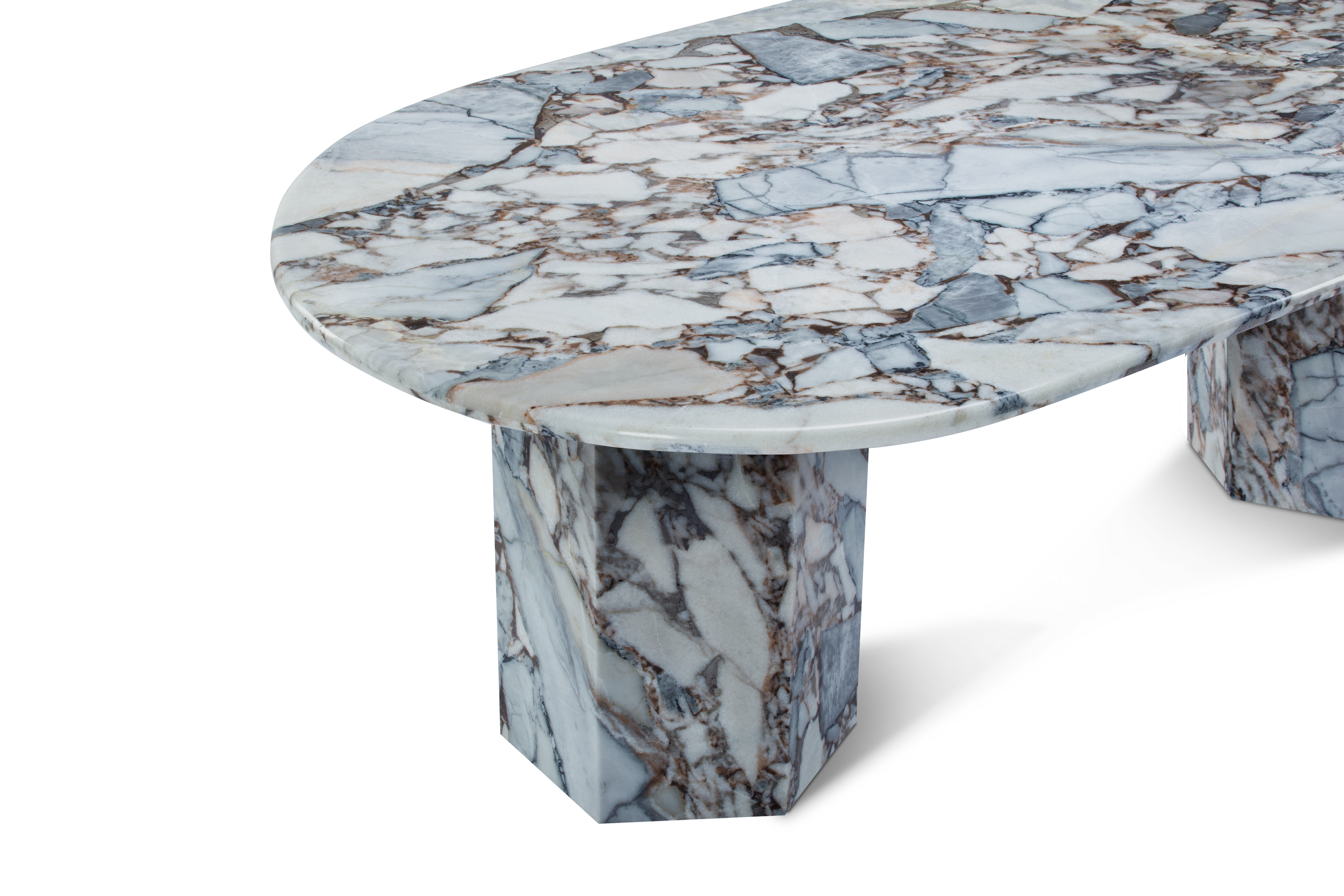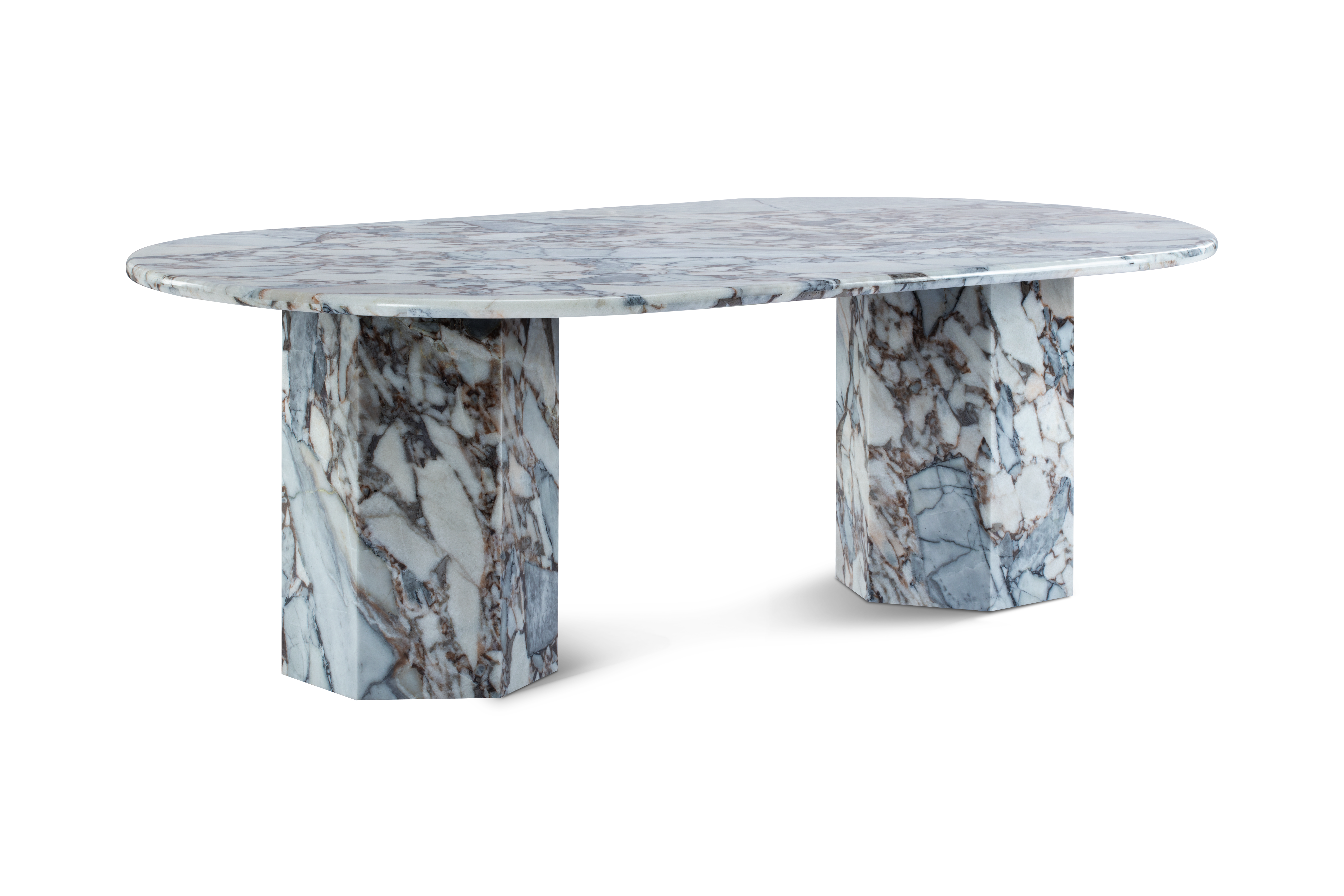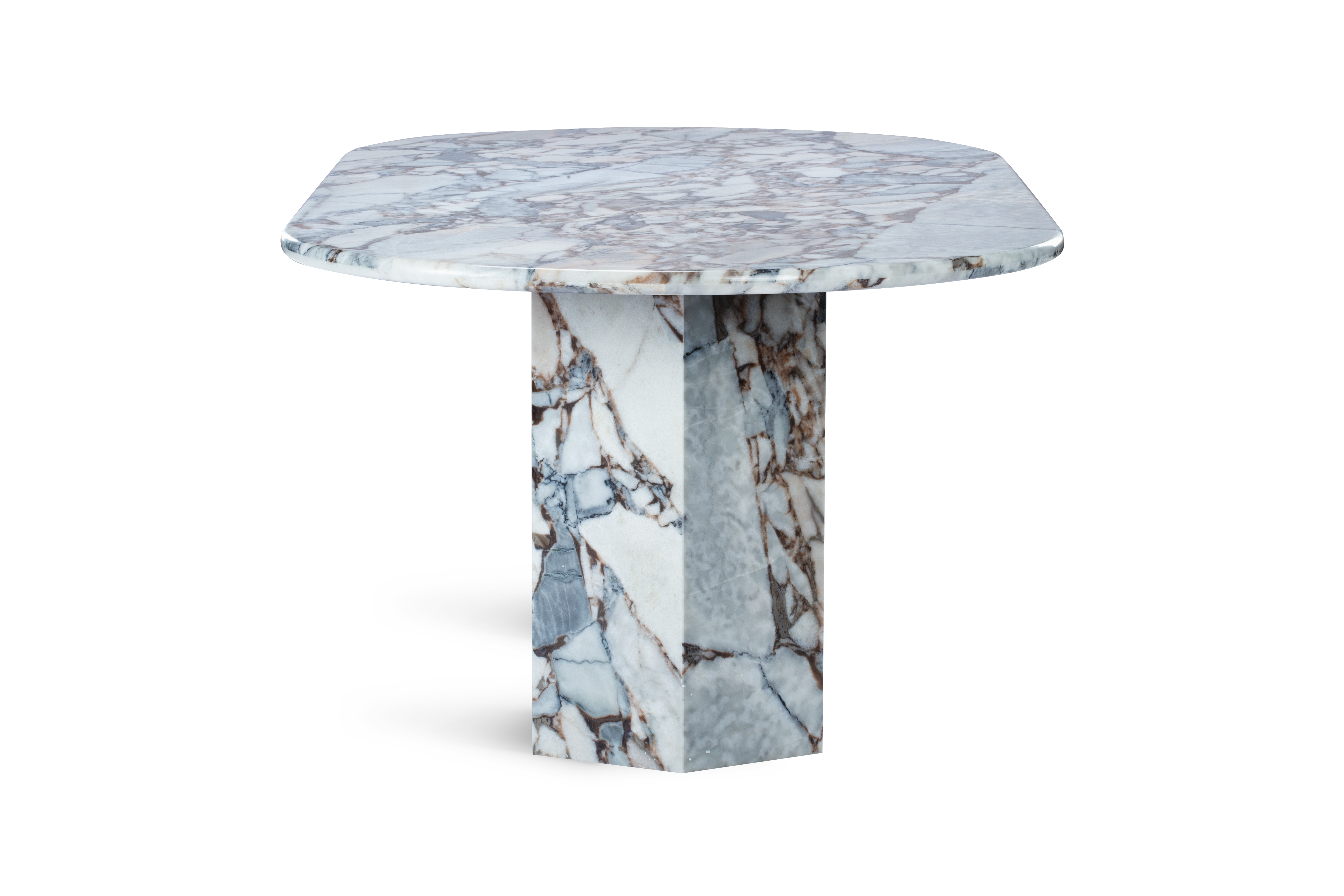 The Viola dining table captures the essence of Roman architecture with a modern twist, featuring a sleek marble countertop atop geometric plinth bases for a minimalist design with a remarkable presence. Crafted from honed natural Italian modellato marble, it showcases the material's unique texture and patina, providing a chic and functional surface for various activities. The design seamlessly blends sculptural flair and minimalist charm, serving as a versatile focal point in expansive dining spaces, where traditional meets contemporary with hexagonal plinth bases that offer ample space for additional diners.