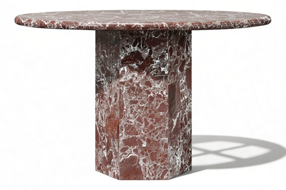 Crafted from honed natural Italian Rosso Levanto marble, this exquisite contemporary table serves as an impressive focal point. Its sleek and bold design pays tribute to this opulent material, emphasizing its unique texture and patina.