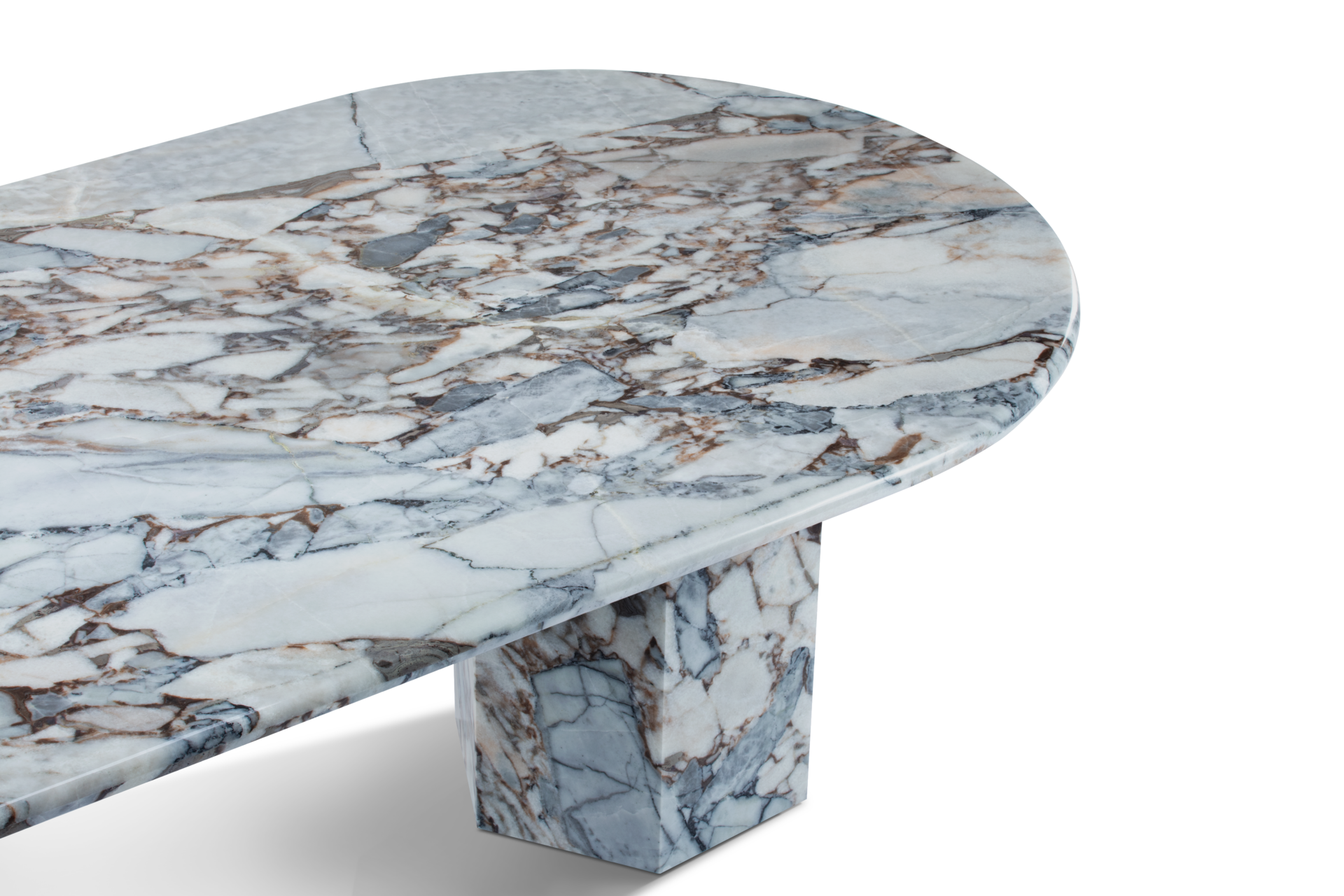 Channeling the essence of Roman architecture but infused with a modern edge, the Viola dining table stands as a captivating and adaptable contemporary furnishing. The sleek marble countertop harmonizes with the geometric plinth bases, resulting in a design that embodies minimalism yet exudes a remarkable presence. The clean, monolithic structure accentuates the raw beauty of the stone, showcasing its lively texture, distinct patina, charm-filled veining, and subtle tonal nuances. Crafted with a honed finish, the table provides a chic and functional surface for dining, working, and socializing. Please note that due to its natural composition, each marble tabletop will bear unique characteristics inherent to the stone: color divergences, natural veining, and pores.