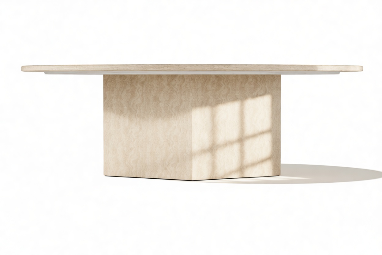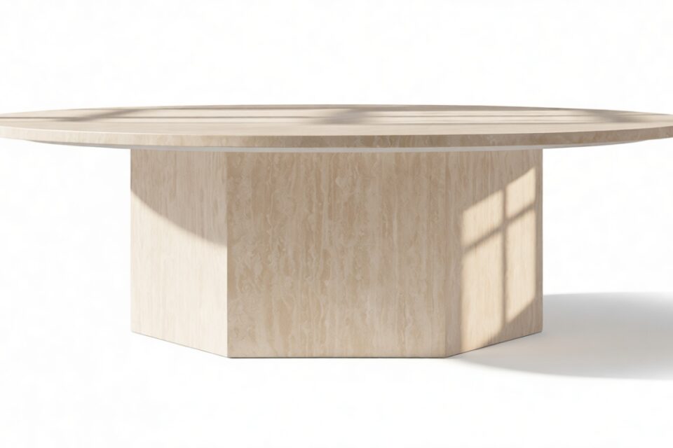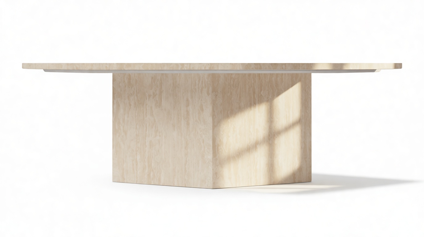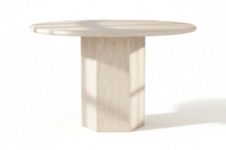 Crafted from honed natural Italian marble or travertine, this exquisite contemporary table serves as a remarkable focal point. Its sleek, eye-catching design celebrates the opulence of this premium material, highlighting its unique texture and patina.