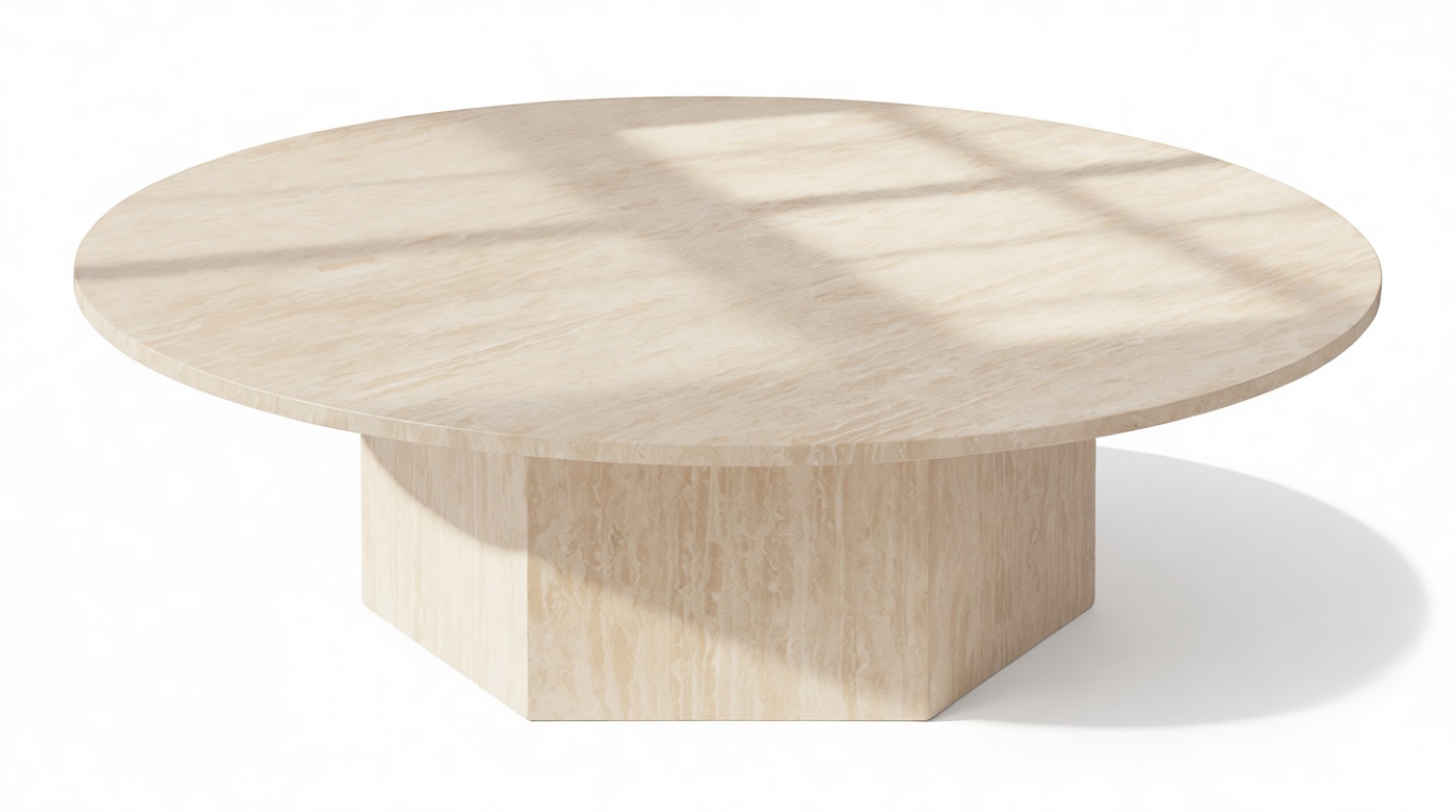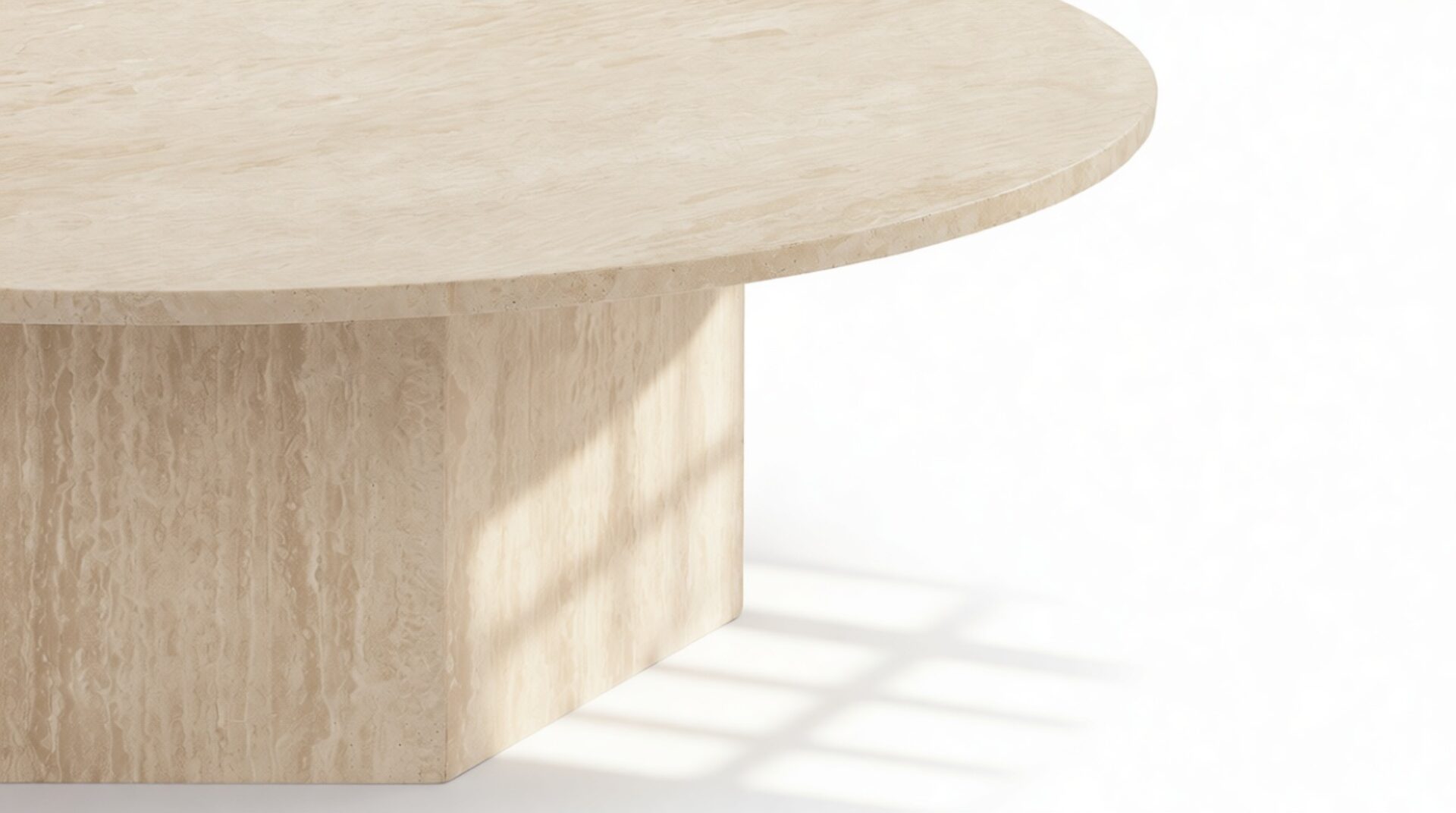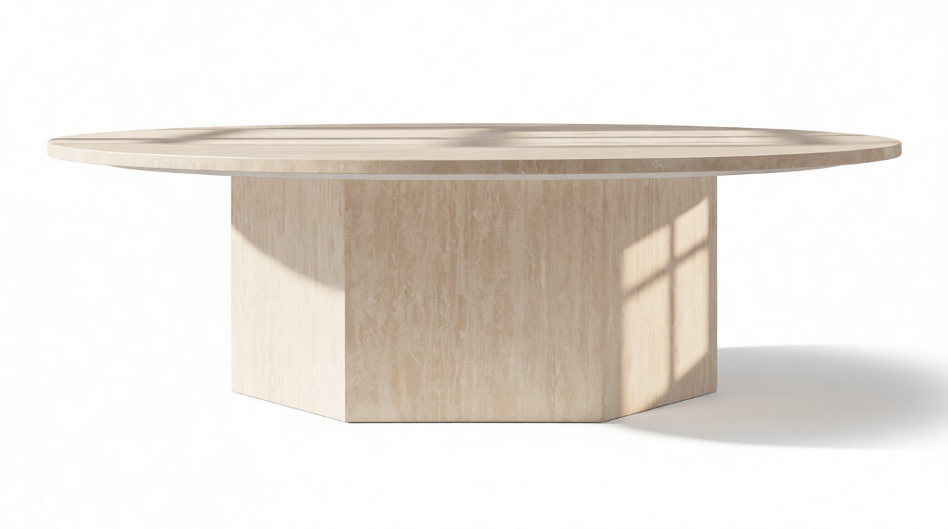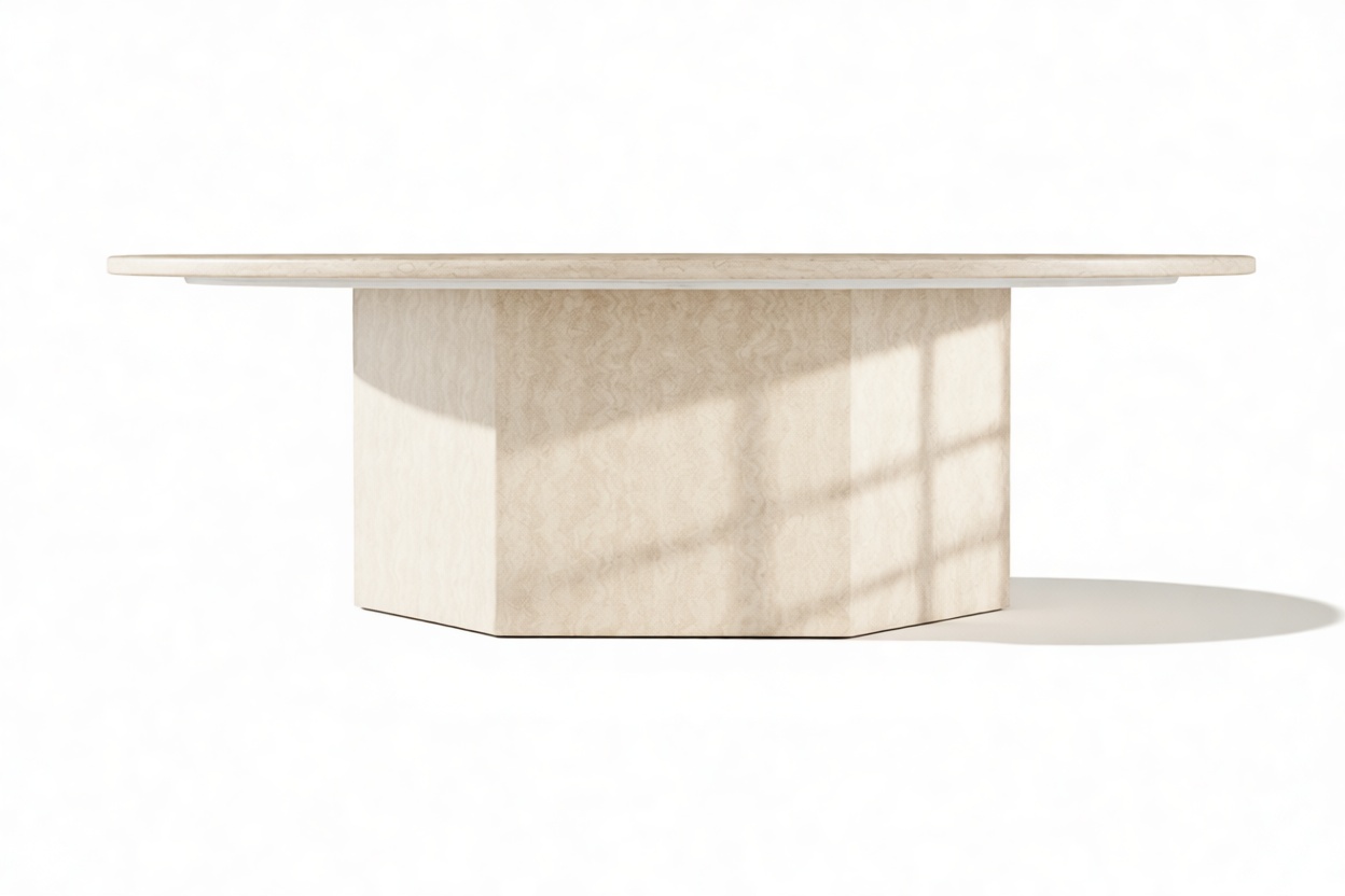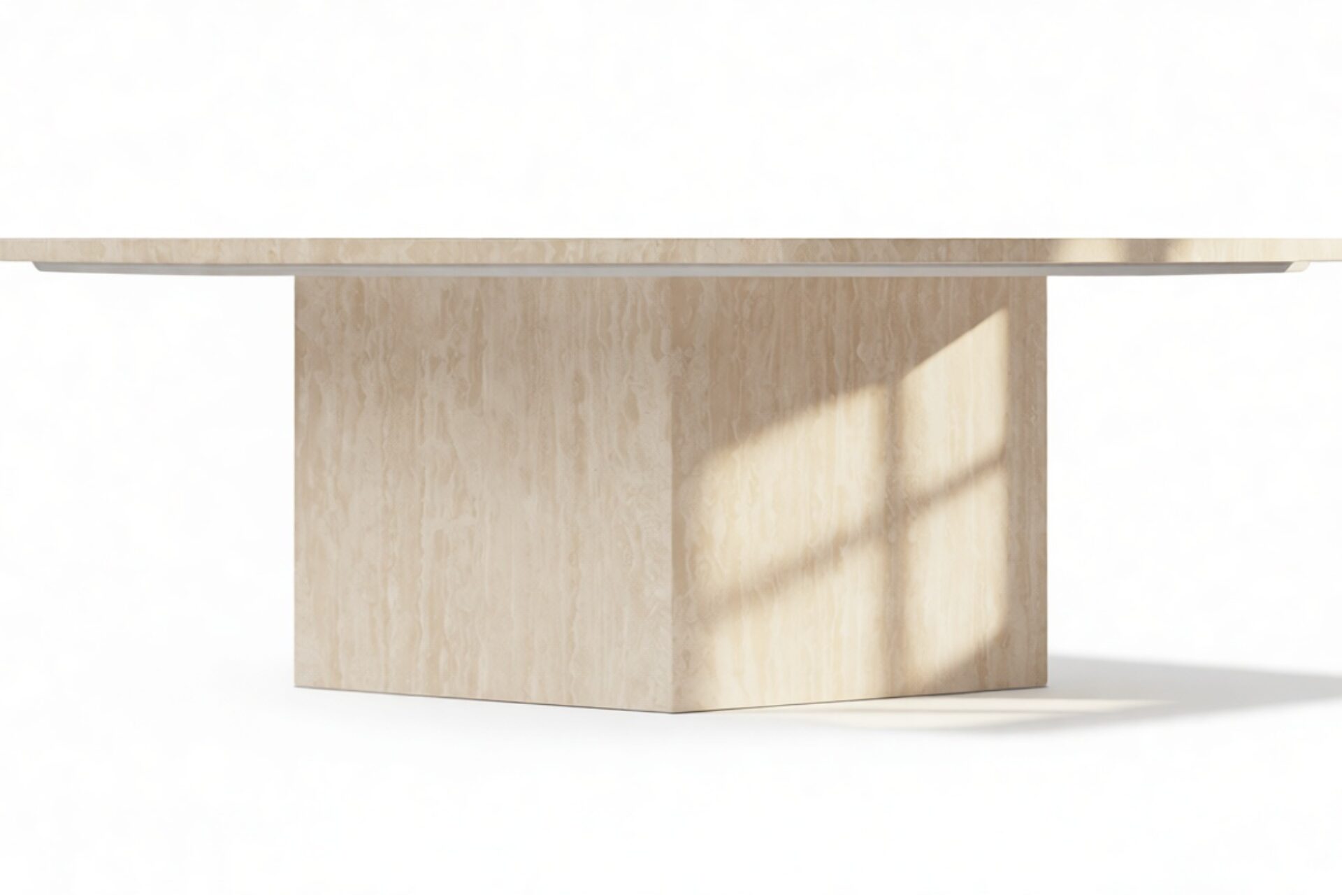 Inspired by ancient Roman architecture, the Viola Coffee Table seamlessly marries contemporary style with minimalist design. The smooth travertine top elegantly contrasts the angular base, showcasing the stone's rich texture, veining, and color variations. With a hexagonal plinth base providing ample room, this exquisite table celebrates the opulence of natural travertine, creating a versatile and sophisticated centerpiece.