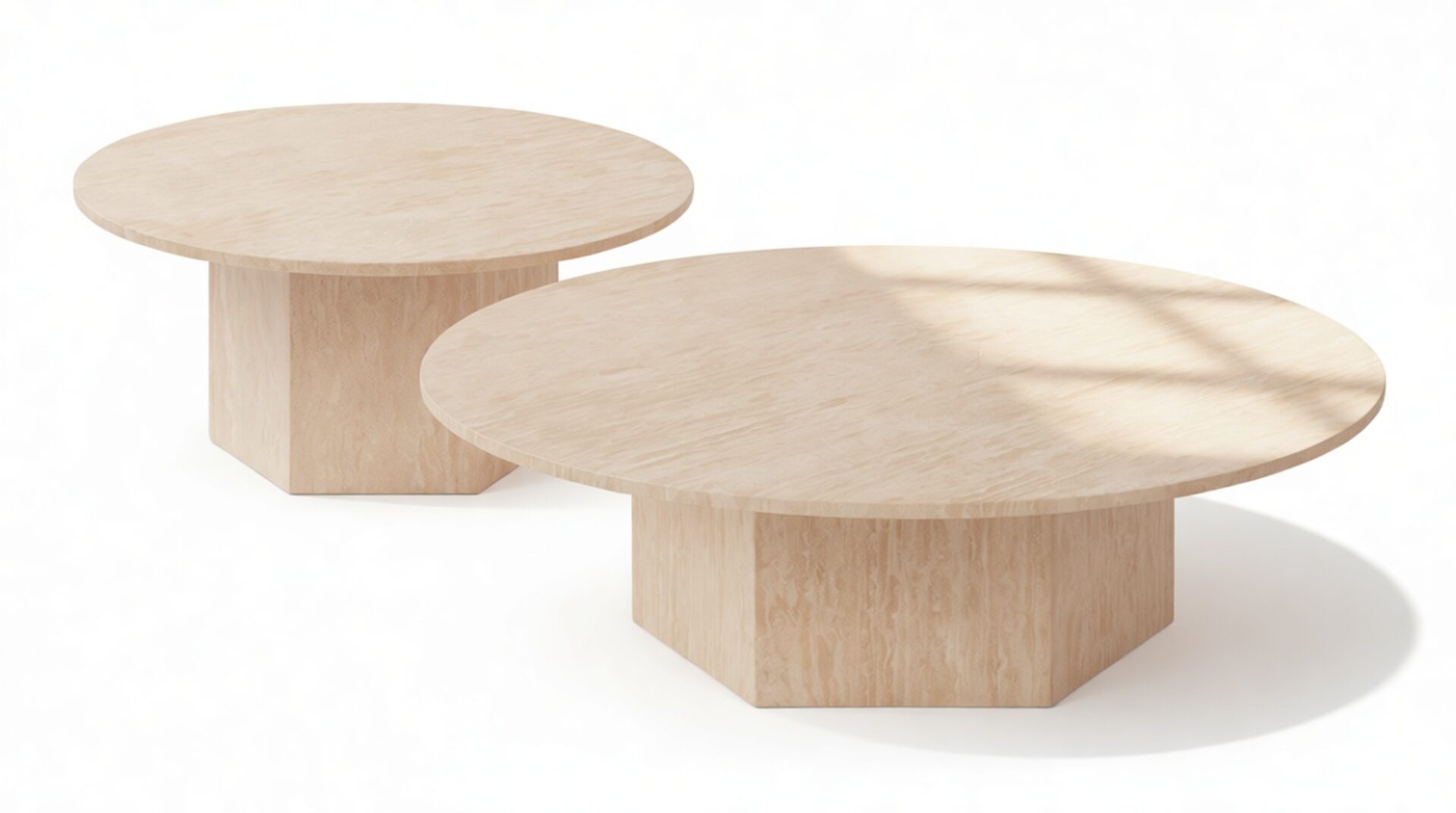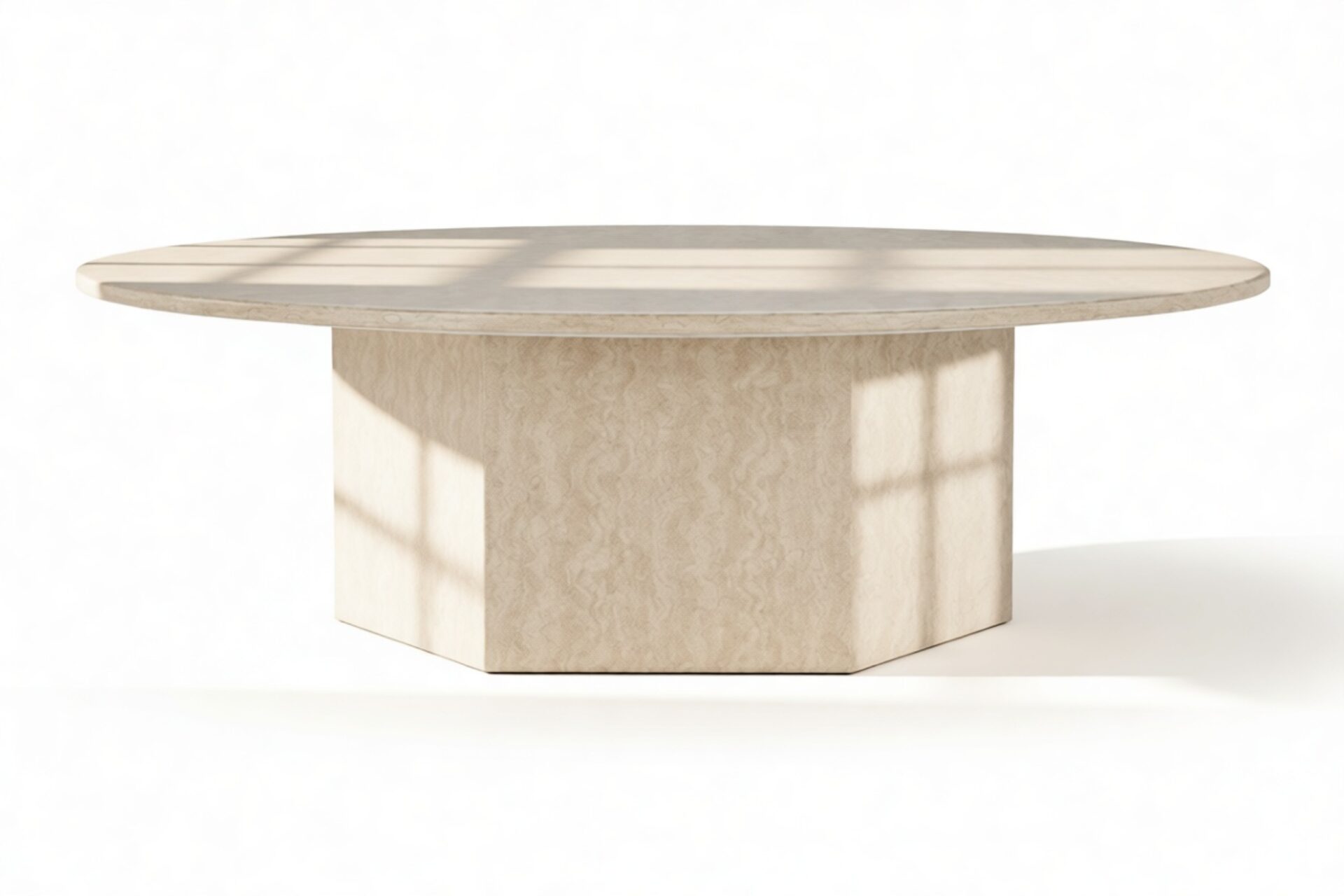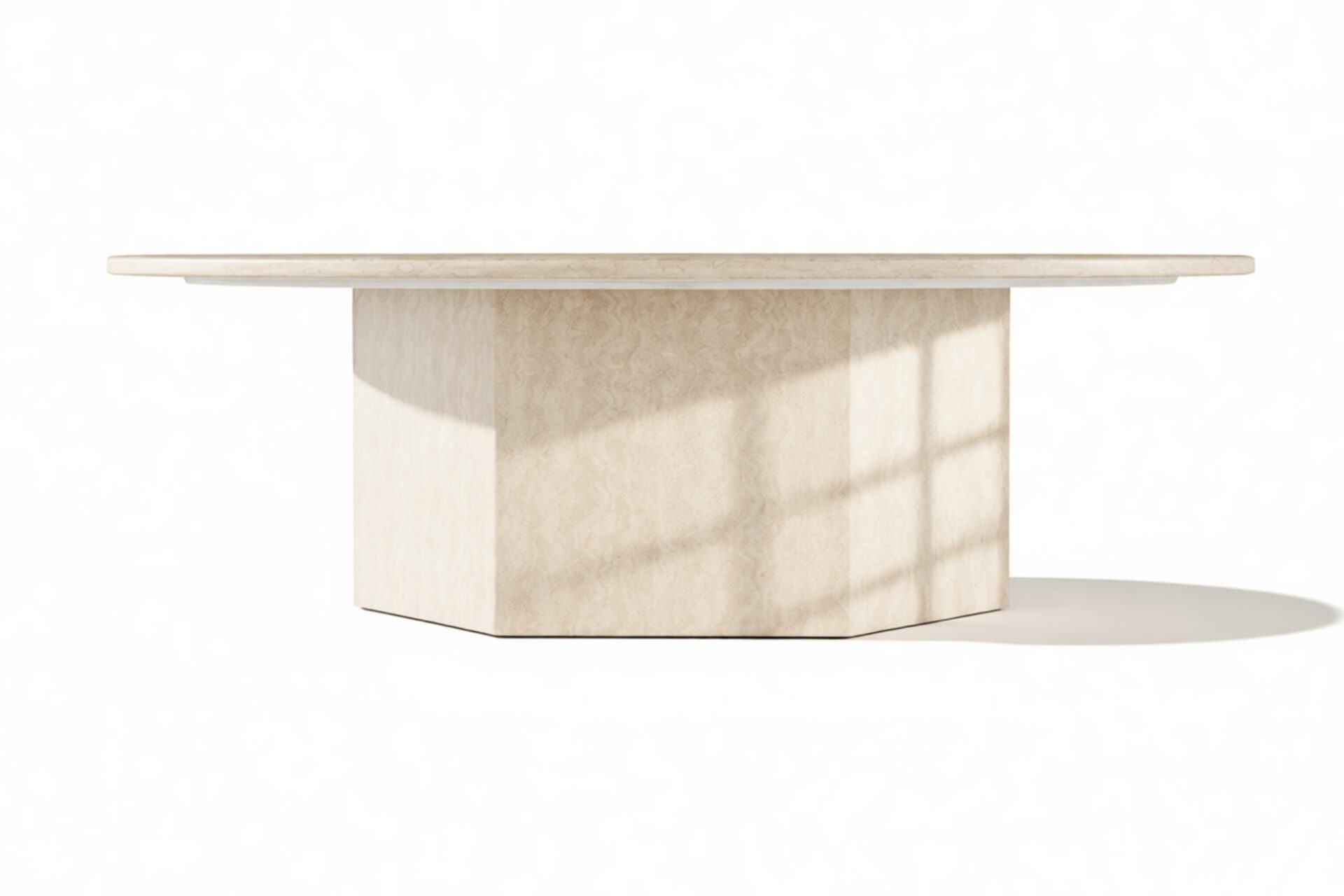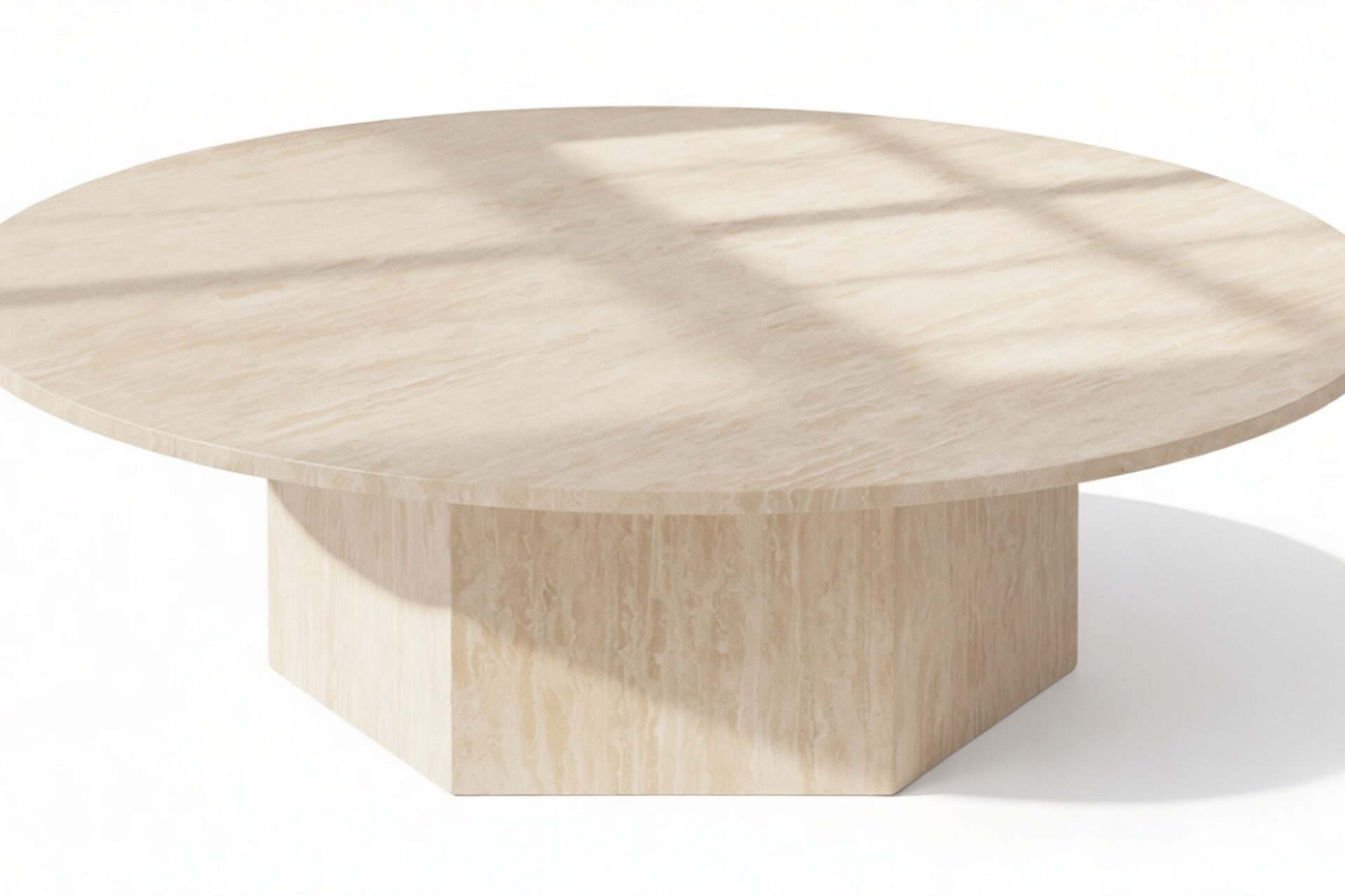 Inspired by ancient Roman architecture, the Viola Coffee Table seamlessly marries contemporary style with minimalist design. The smooth travertine top elegantly contrasts the angular base, showcasing the stone's rich texture, veining, and color variations. With a hexagonal plinth base providing ample room, this exquisite table celebrates the opulence of natural travertine, creating a versatile and sophisticated centerpiece.