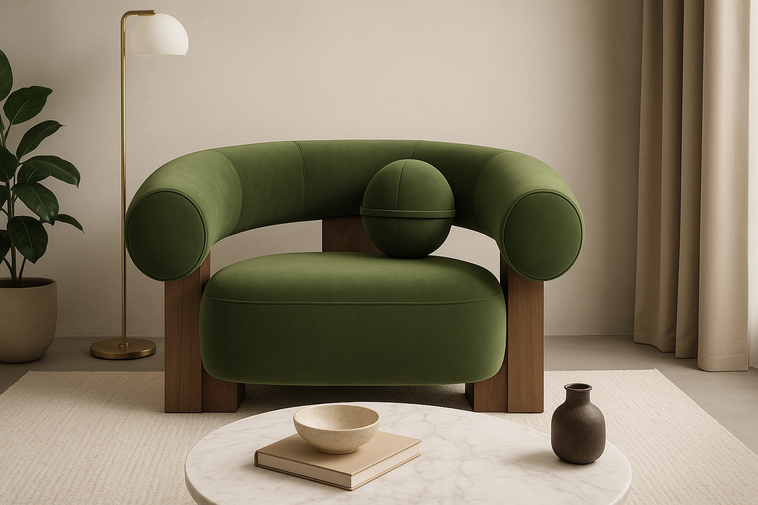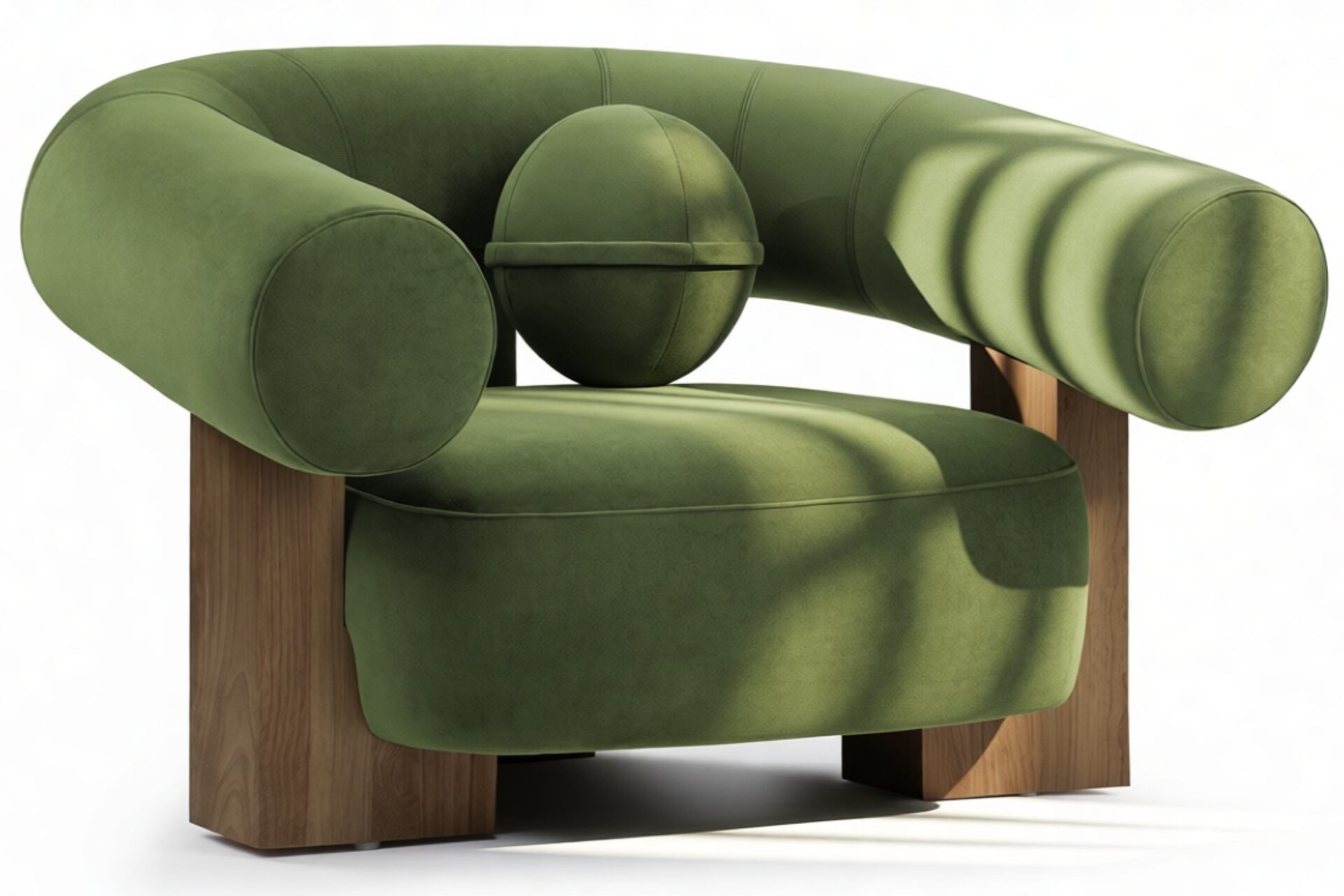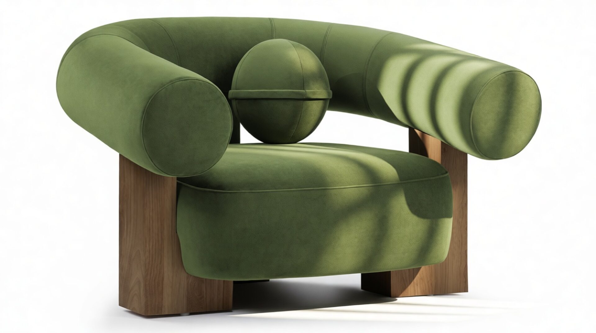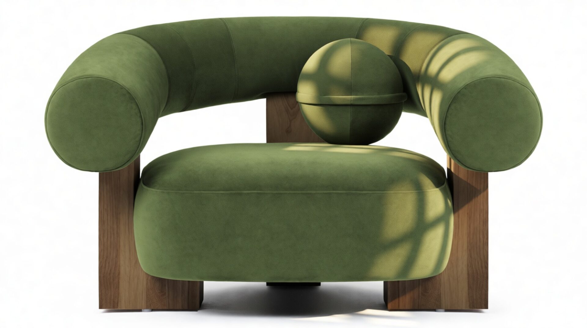 Introducing the captivating Vita Lounge Chair, an artistic statement piece that boldly marries strength and style. Featuring wide, curved arms and a charming ball-shaped cushion, this chair's striking silhouette is enhanced by lush Lichen Plush Velvet upholstery. Crafted with robust walnut pieces, it offers luxurious comfort and a refined focal point in any living space. Elevate your decor with the distinctive aesthetic of the Vita Lounge Chair.