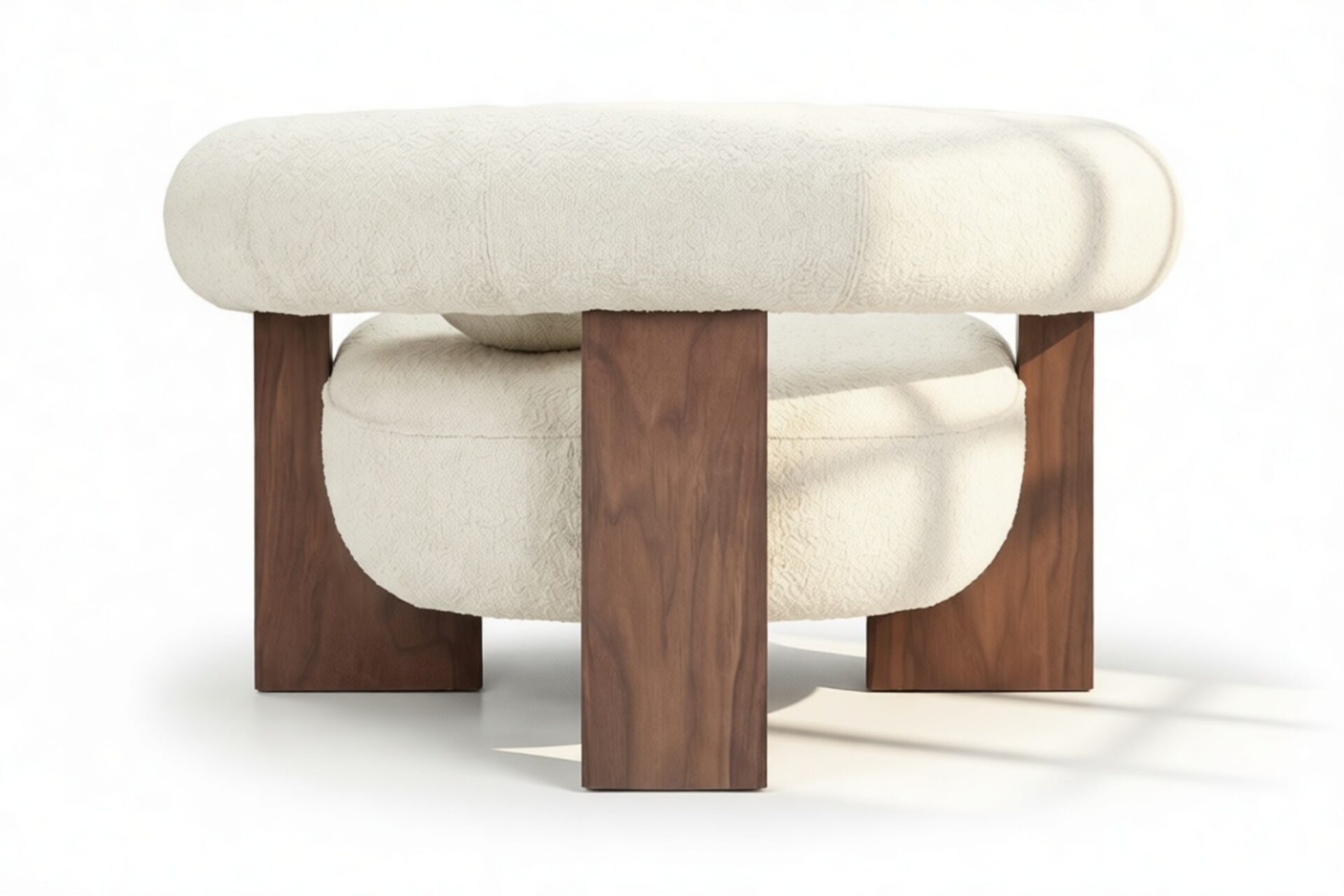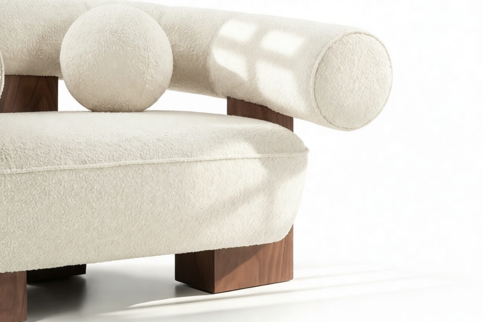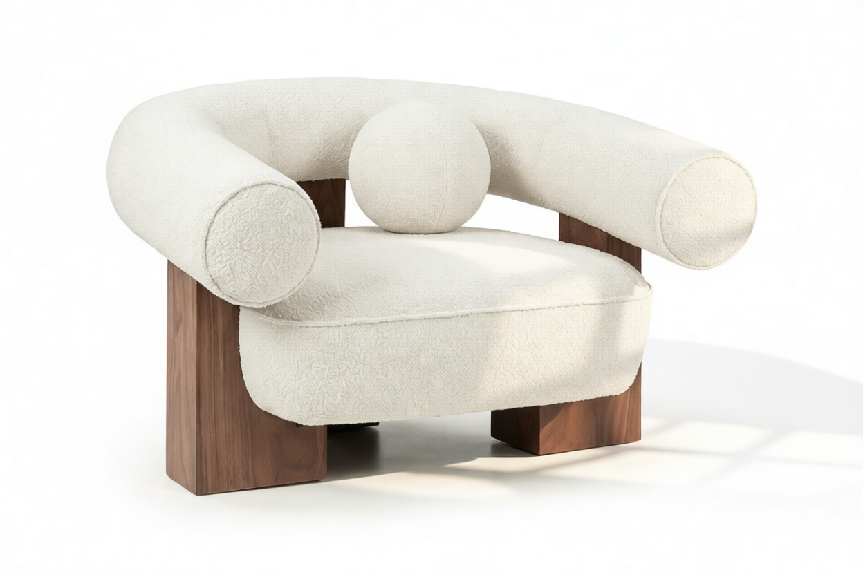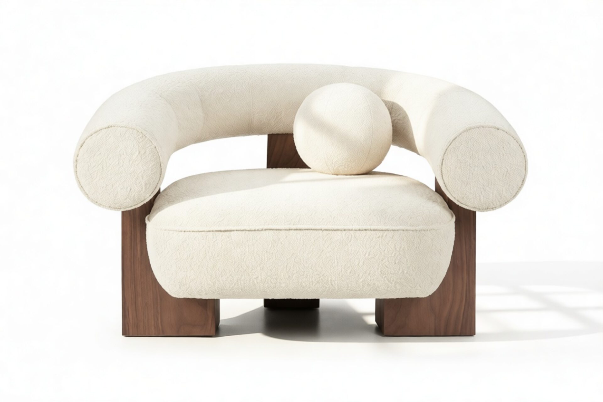 Embrace boldness with the Vita Lounge Chair, an artistic statement with wide, curved arms and a distinctive spherical cushion that adds a playful sculptural touch. Crafted from robust walnut pieces, it juxtaposes dark wood with sumptuously textured Pearl Boucle fabric for a luxurious and enduring appeal. This chair seamlessly blends comfort and creativity, serving as an elegant focal point in any living space.