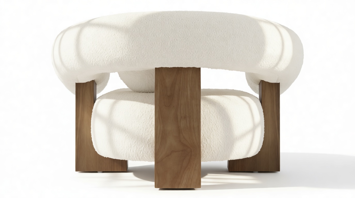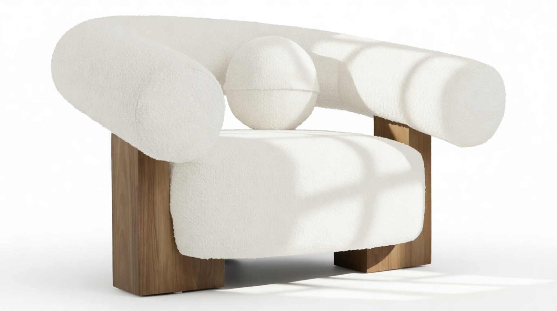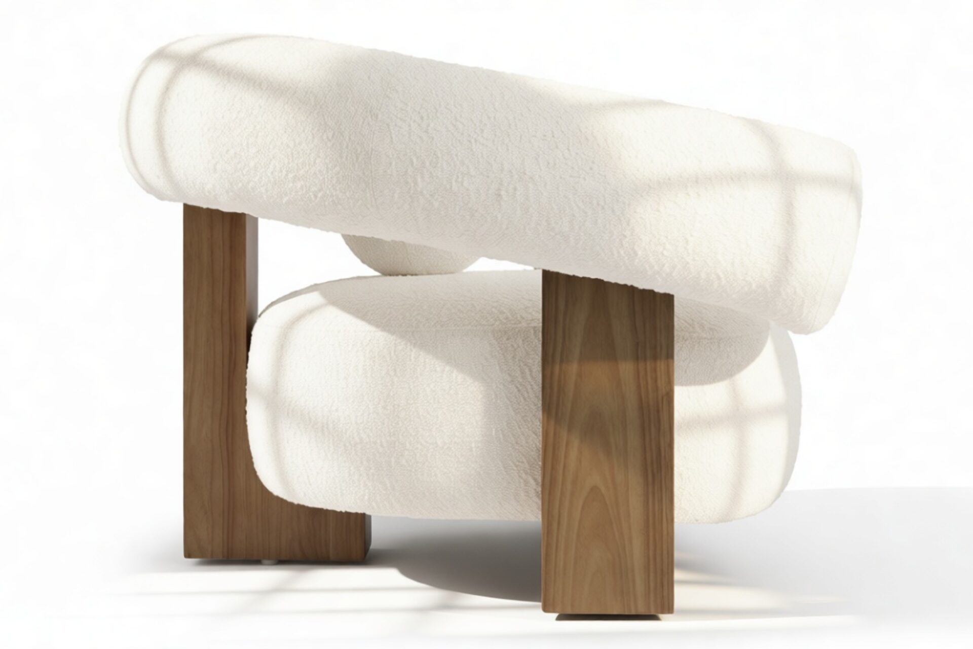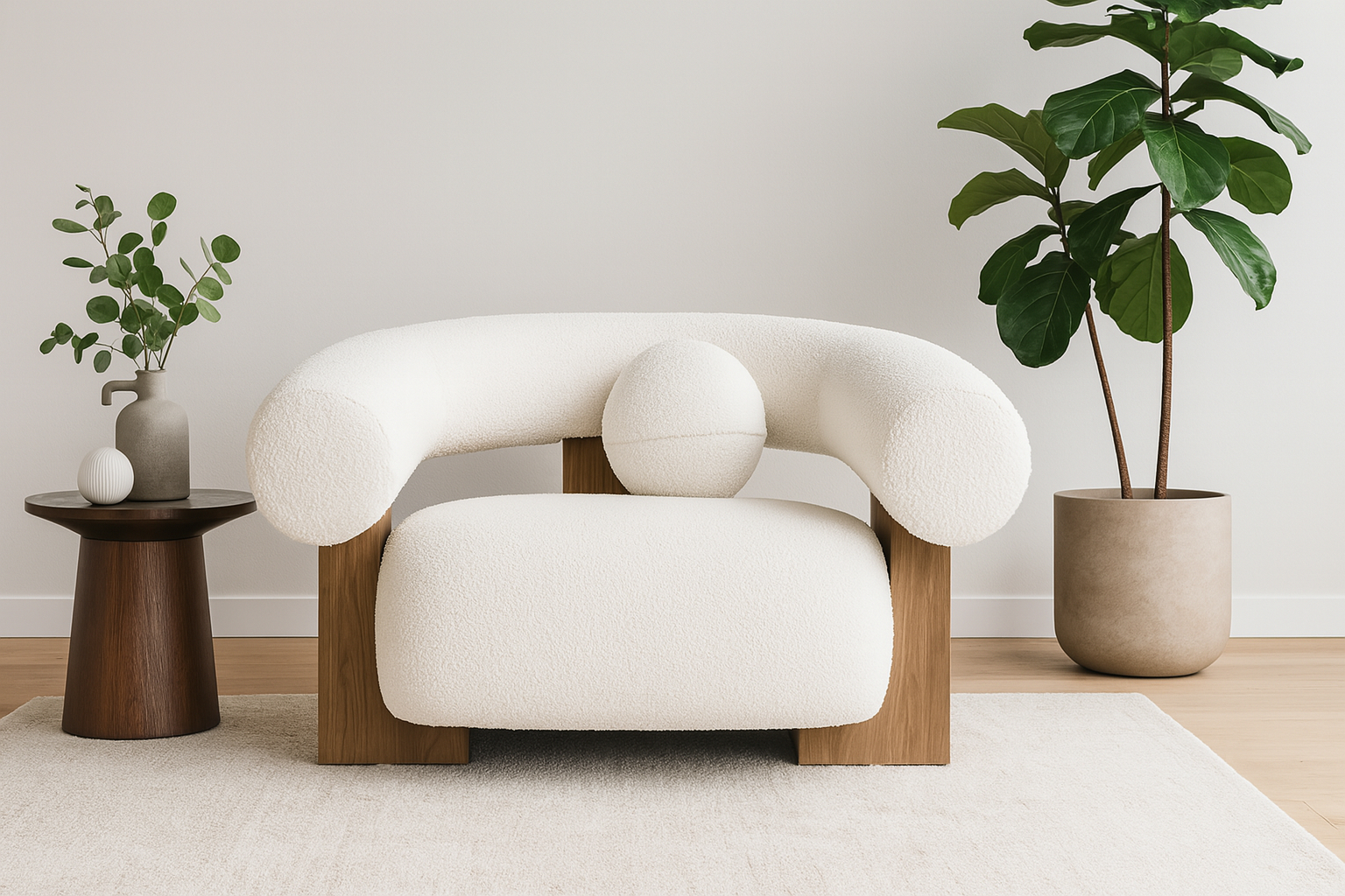 Embrace boldness with the Vita Lounge Chair, an artistic statement with wide, curved arms and a distinctive spherical cushion that adds a playful sculptural touch. Crafted from robust walnut pieces, it juxtaposes dark wood with sumptuously textured Pearl Boucle fabric for a luxurious and enduring appeal. This chair seamlessly blends comfort and creativity, serving as an elegant focal point in any living space.