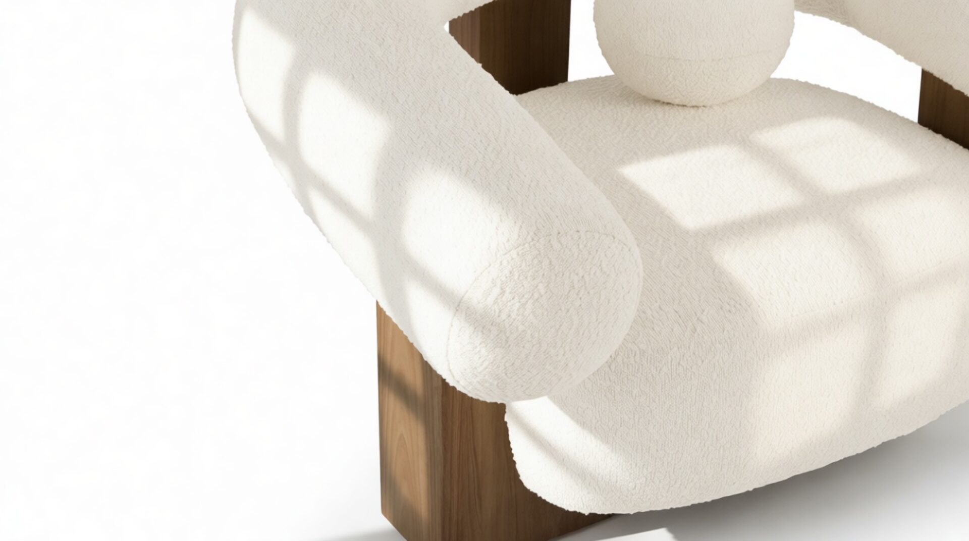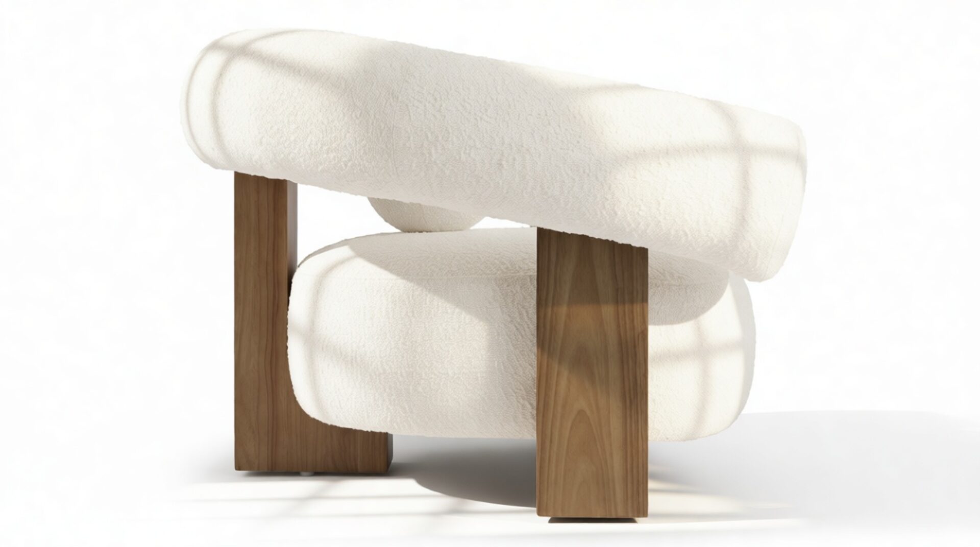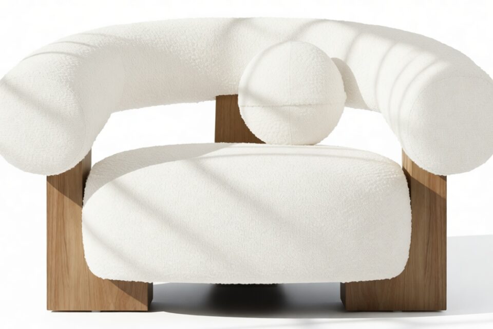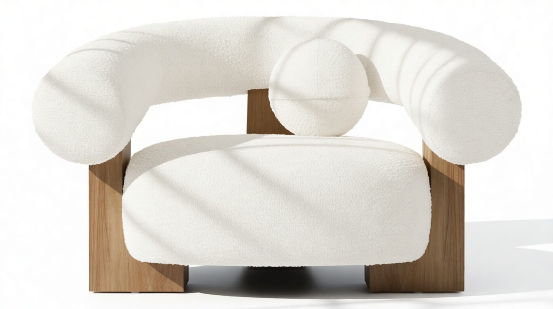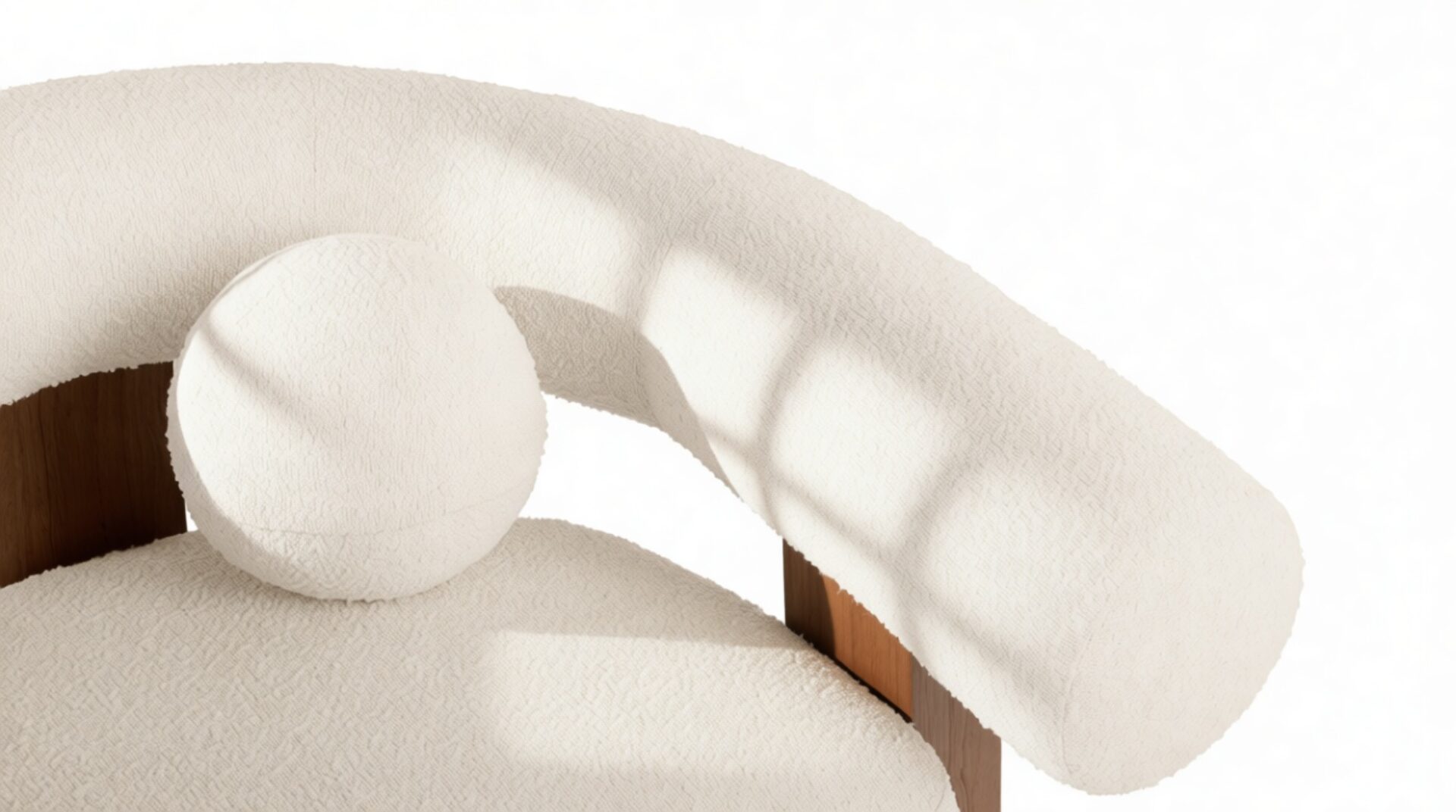 Embrace boldness with the Vita Lounge Chair, an artistic statement with wide, curved arms and a distinctive spherical cushion that adds a playful sculptural touch. Crafted from robust walnut pieces, it juxtaposes dark wood with sumptuously textured Pearl Boucle fabric for a luxurious and enduring appeal. This chair seamlessly blends comfort and creativity, serving as an elegant focal point in any living space.