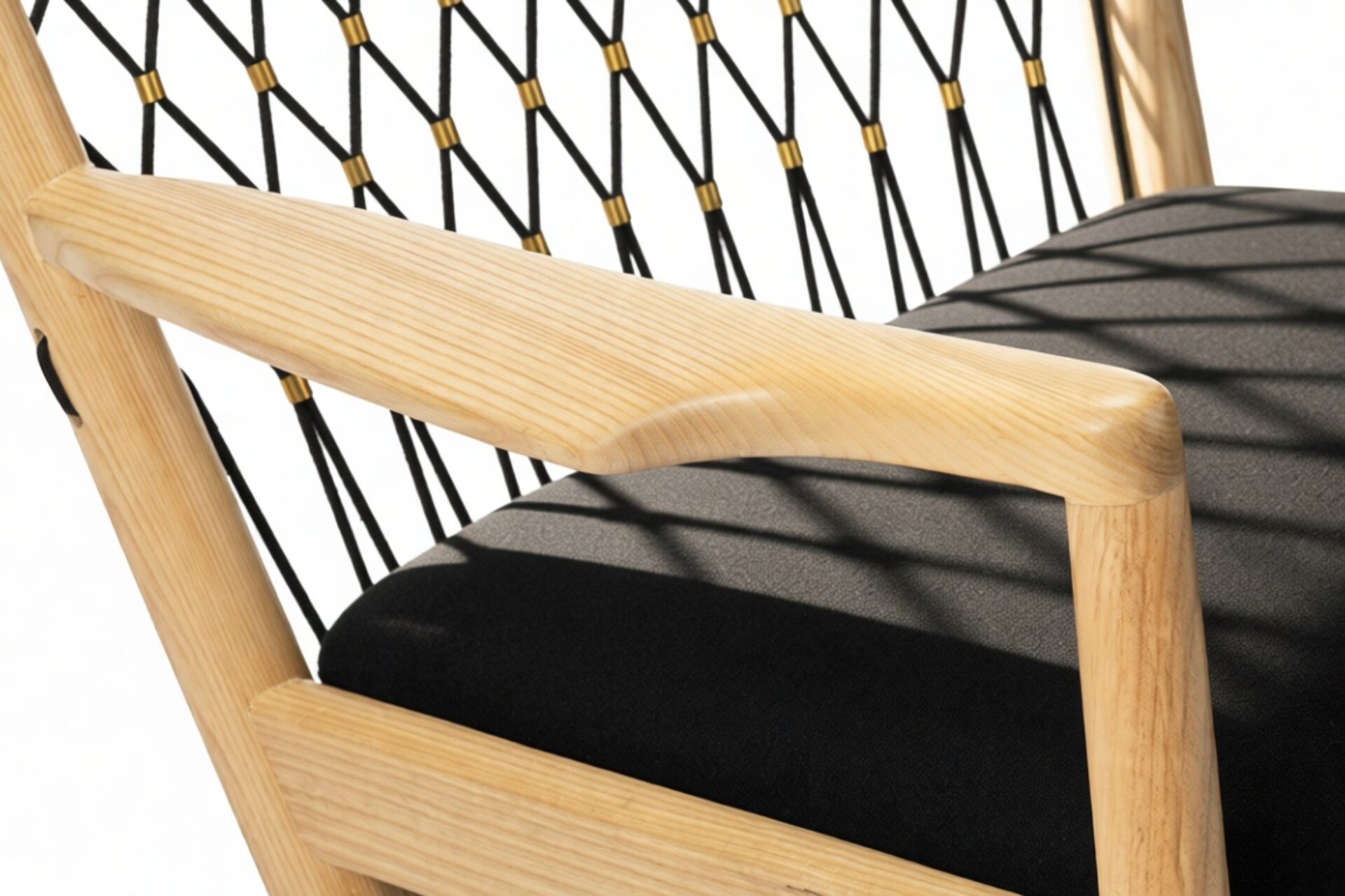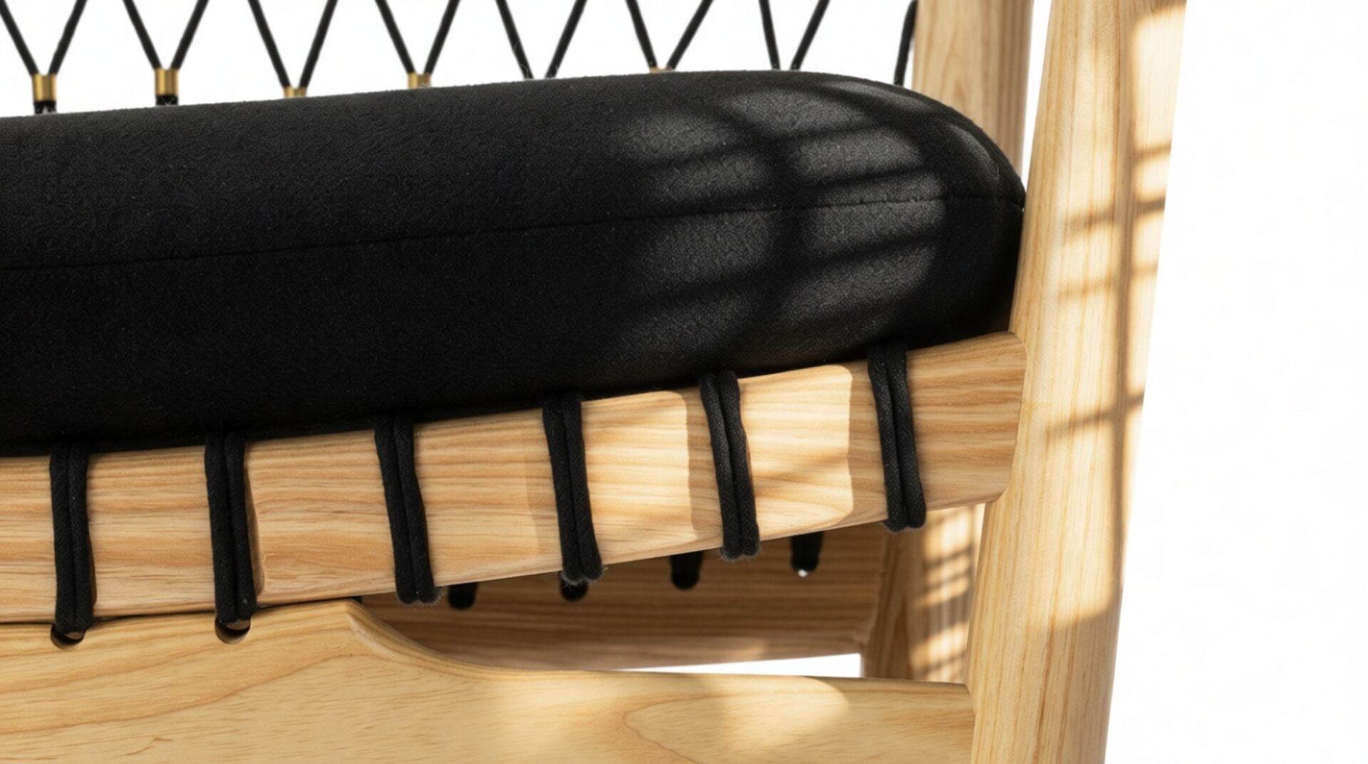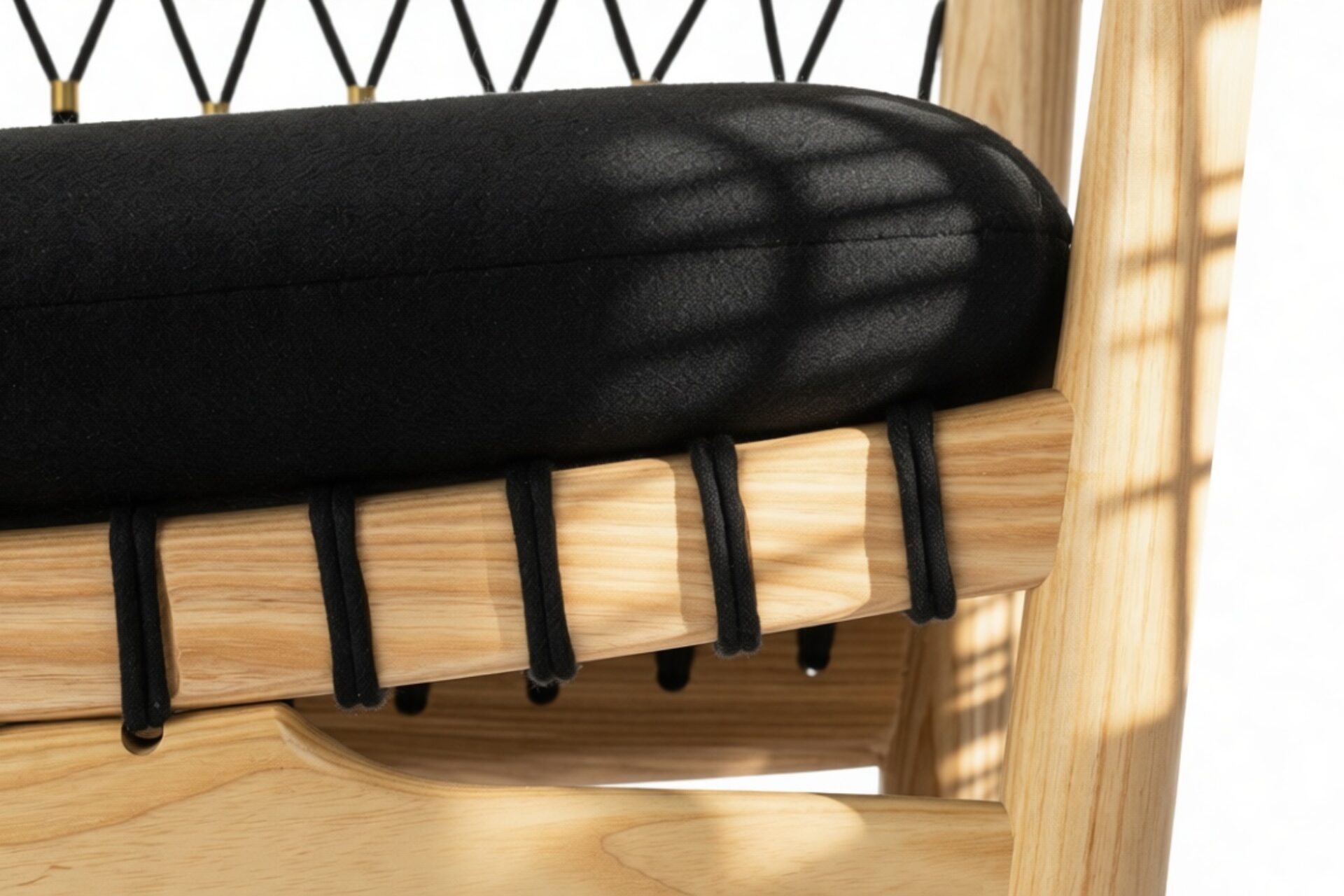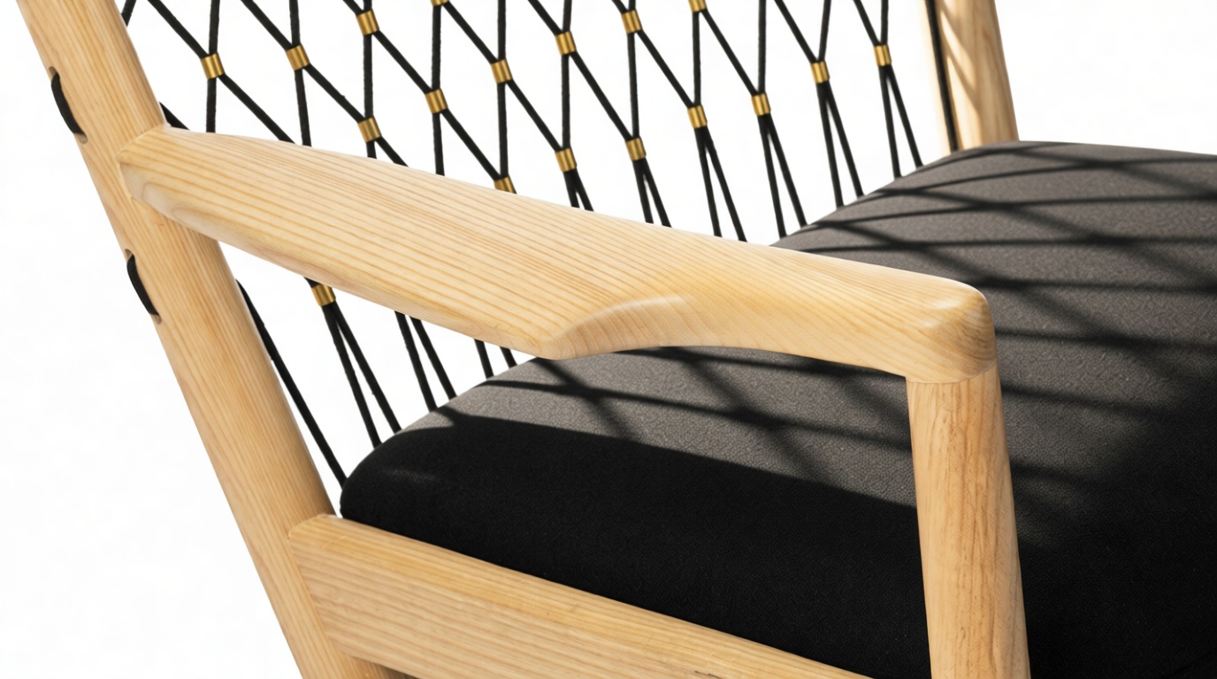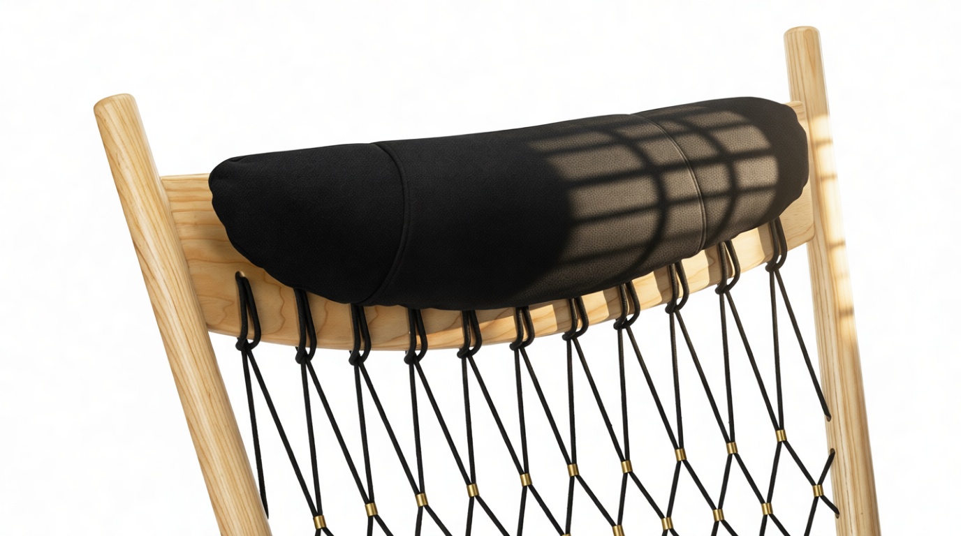 Experience the artisanal craftsmanship of the Wegner chair, featuring a blend of premium materials such as a wooden frame, upholstered seat and neck cushions, and plaited flag halyard.