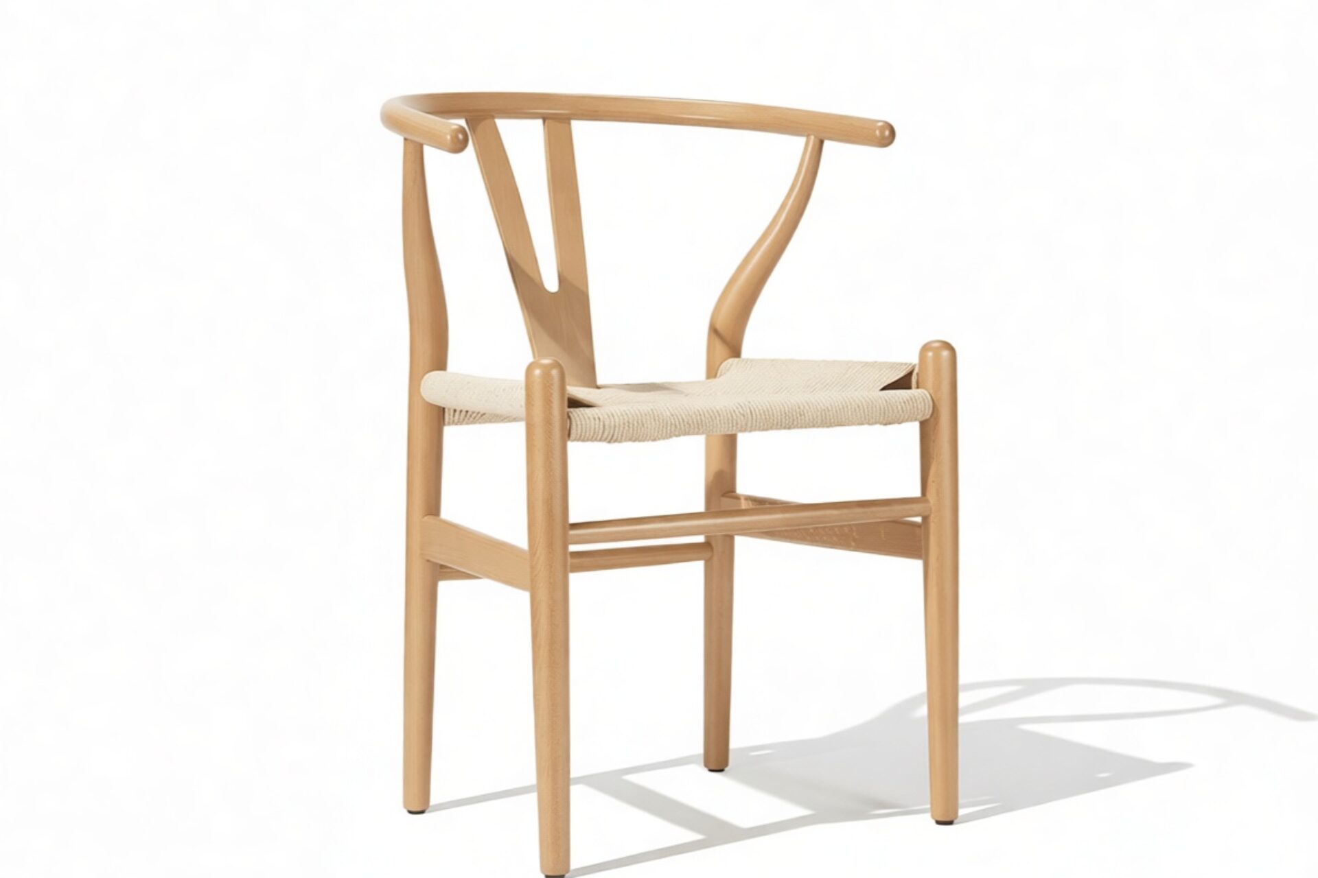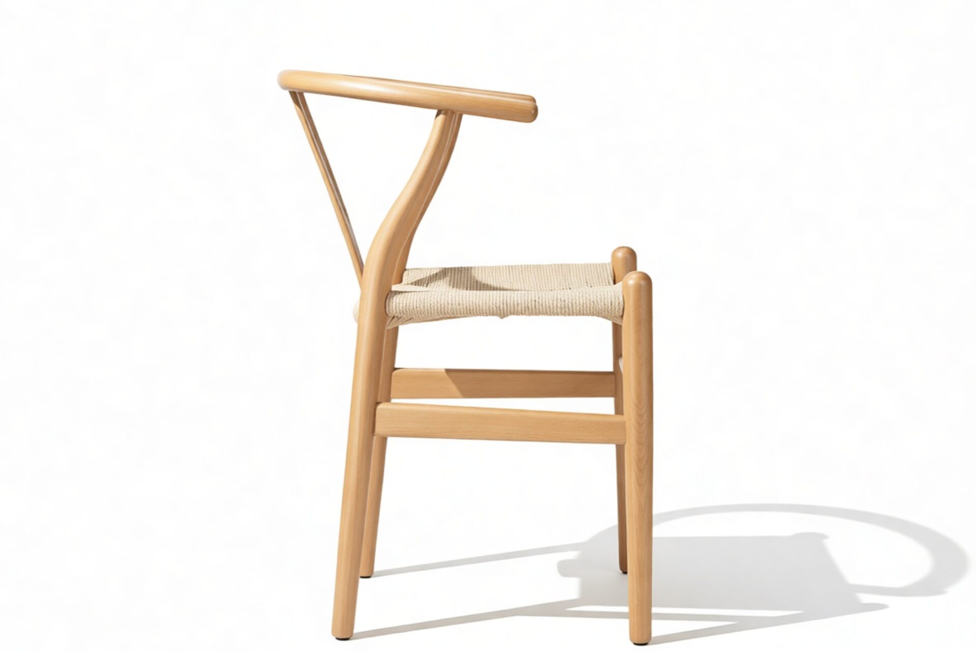 The Wish Chair, inspired by world-renowned Wishbone chair, exemplifies the iconic mid-century Danish design known for its unique back-rest support shape. This chair's design represents a superb example of elegant simplicity. Featuring curved back legs that gradually taper to connect with the back rail, its silhouette continues to captivate enthusiasts of the design. The Wish Chair is a minimalist's dream, boasting a lightweight yet sturdy and sophisticated frame paired with a comfortable paper-cord seat.