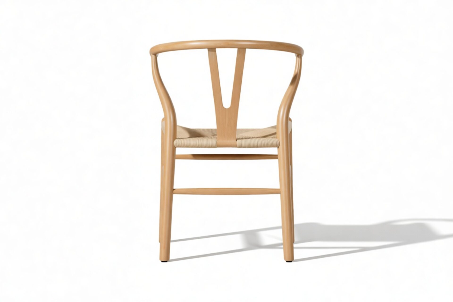 The Wish Chair, inspired by world-renowned Wishbone chair, exemplifies the iconic mid-century Danish design known for its unique back-rest support shape. This chair's design represents a superb example of elegant simplicity. Featuring curved back legs that gradually taper to connect with the back rail, its silhouette continues to captivate enthusiasts of the design. The Wish Chair is a minimalist's dream, boasting a lightweight yet sturdy and sophisticated frame paired with a comfortable paper-cord seat.
